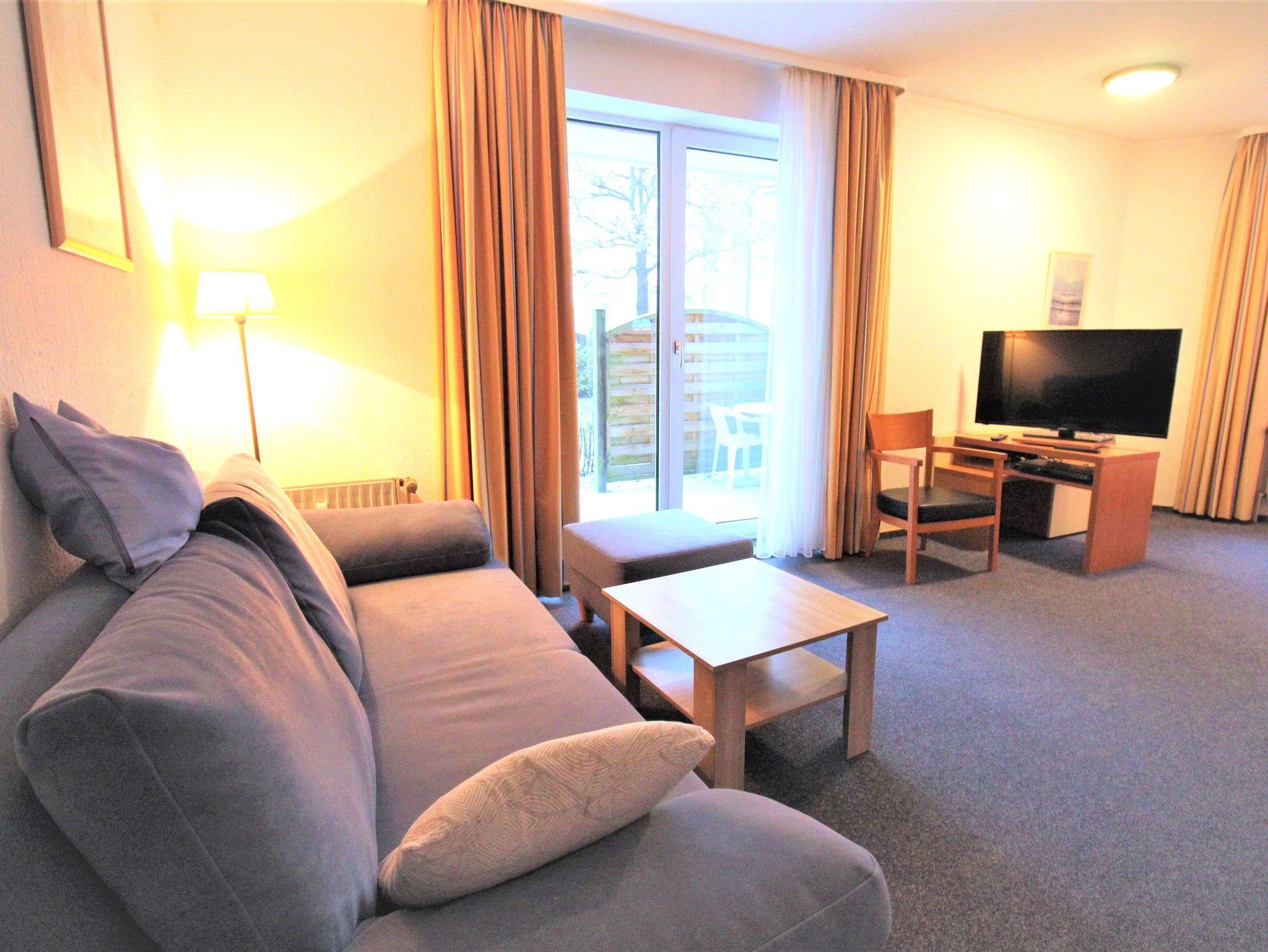 Sie wohnen in einem 1-Zimmer-Appartement für bis zu 2 Personen auf ca. 35 m². Ein Wohn-/Schlafraum mit Doppelbett (hinter einem Raumteiler) und gemütlicher Couchgarnitur mit zusätzlichem Hocker für die Beine, separater Essplatz, voll ausgestatteter Küchenbereich, Dusche/WC, Terrasse, SAT-Flachbild-TV und Mini-HiFi-Anlage. Tiefgarageneinstellplatz für PKW.