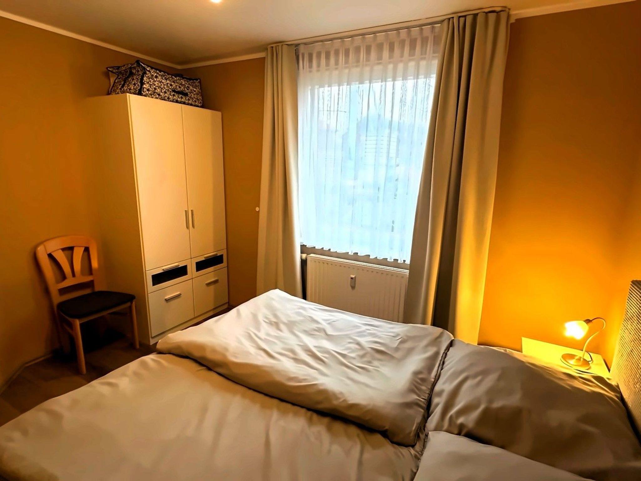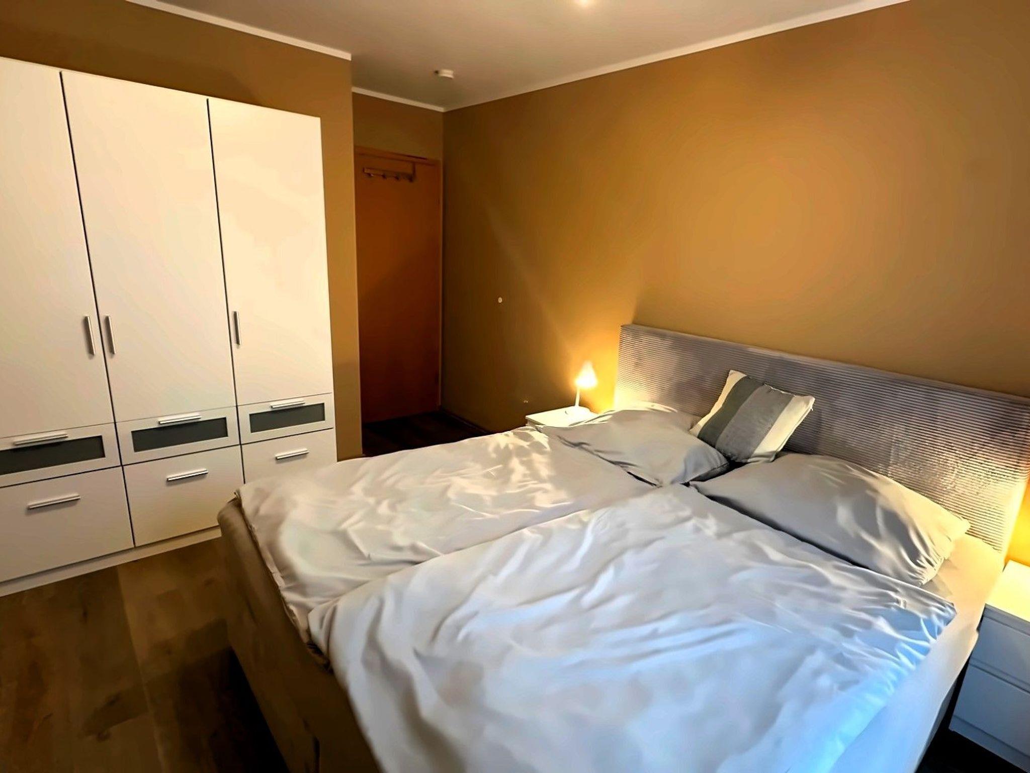 Das Schlafzimmer ist mit einem komfortablen Boxspringbett (180 cm x 200 cm) mit Topper für einen erholsamen Schlaf ausgestattet, sowie einem großen Kleiderschrank.