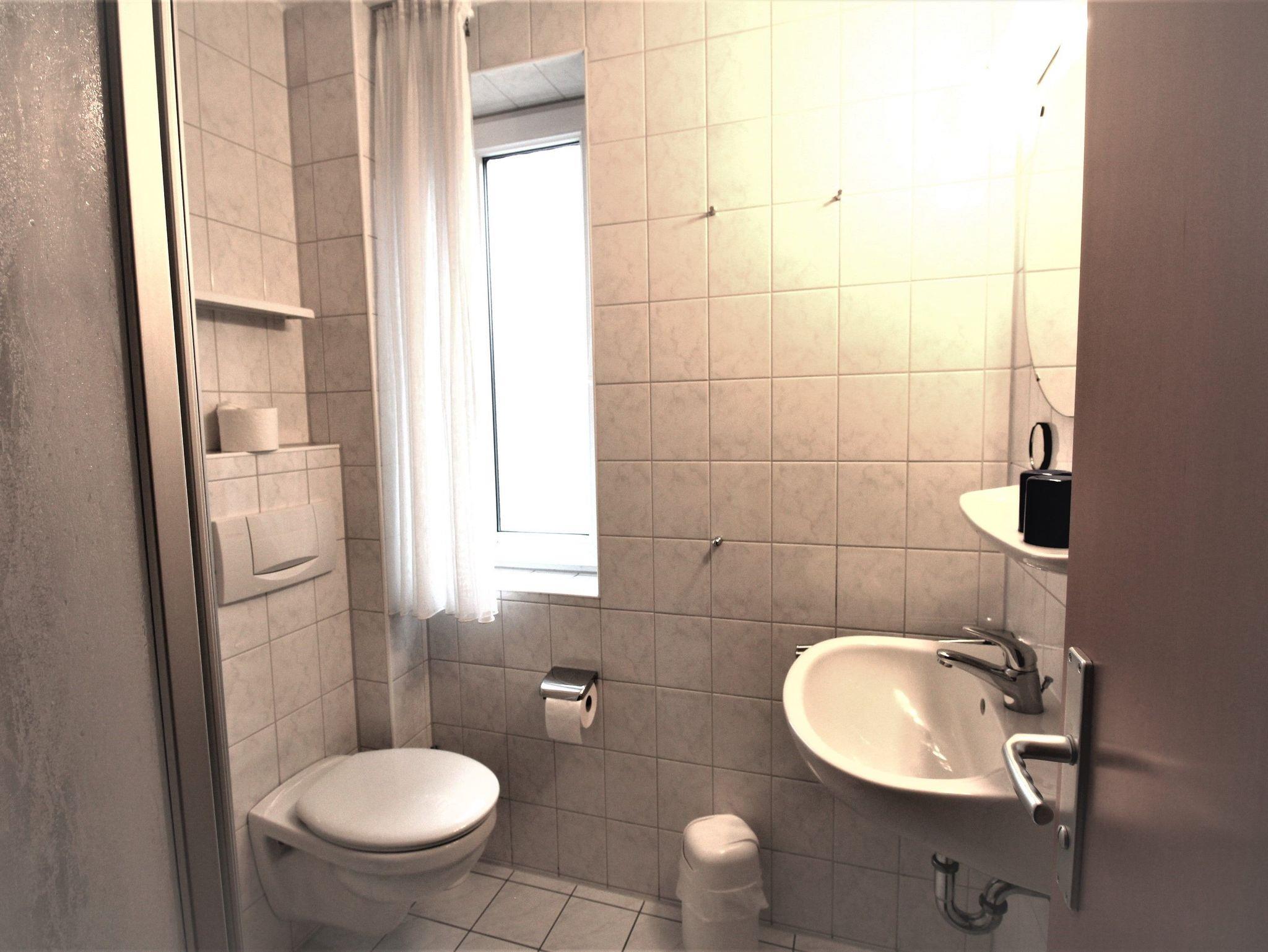 Das Tageslicht-Badezimmer verfügt über eine Dusche, ein WC und ein Waschbecken.