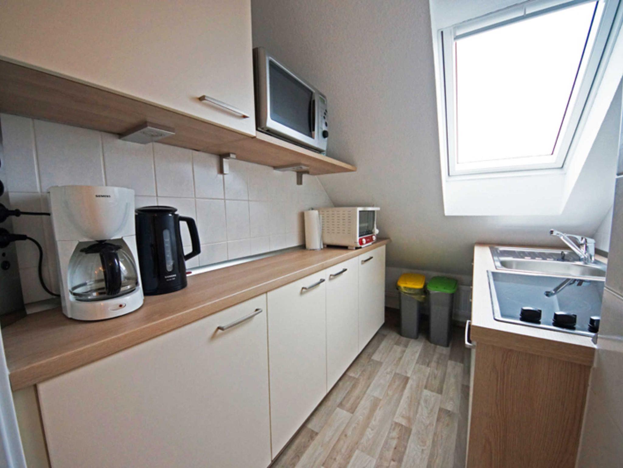 Die Wohnung STEINKAMP 1 befindet sich im Dachgeschoss des Hauses und bietet Platz für 2 - 4 Personen. Die separate Küche ist mit einem Cerankochfeld, Kühlschrank mit Gefrierfach und einer Mikrowelle ausgestattet. Zudem finden Sie alle Utensilien in der Küche, die Sie sonst auch im Alltag benötigen. Die Wohnung verfügt über ein separates Schlafzimmer mit einem Doppelbett (180x200 cm). Im Wohn- und Essbereich befindet sich ein ausklappbares Schlafsofa für 2 Personen (160x200 cm).