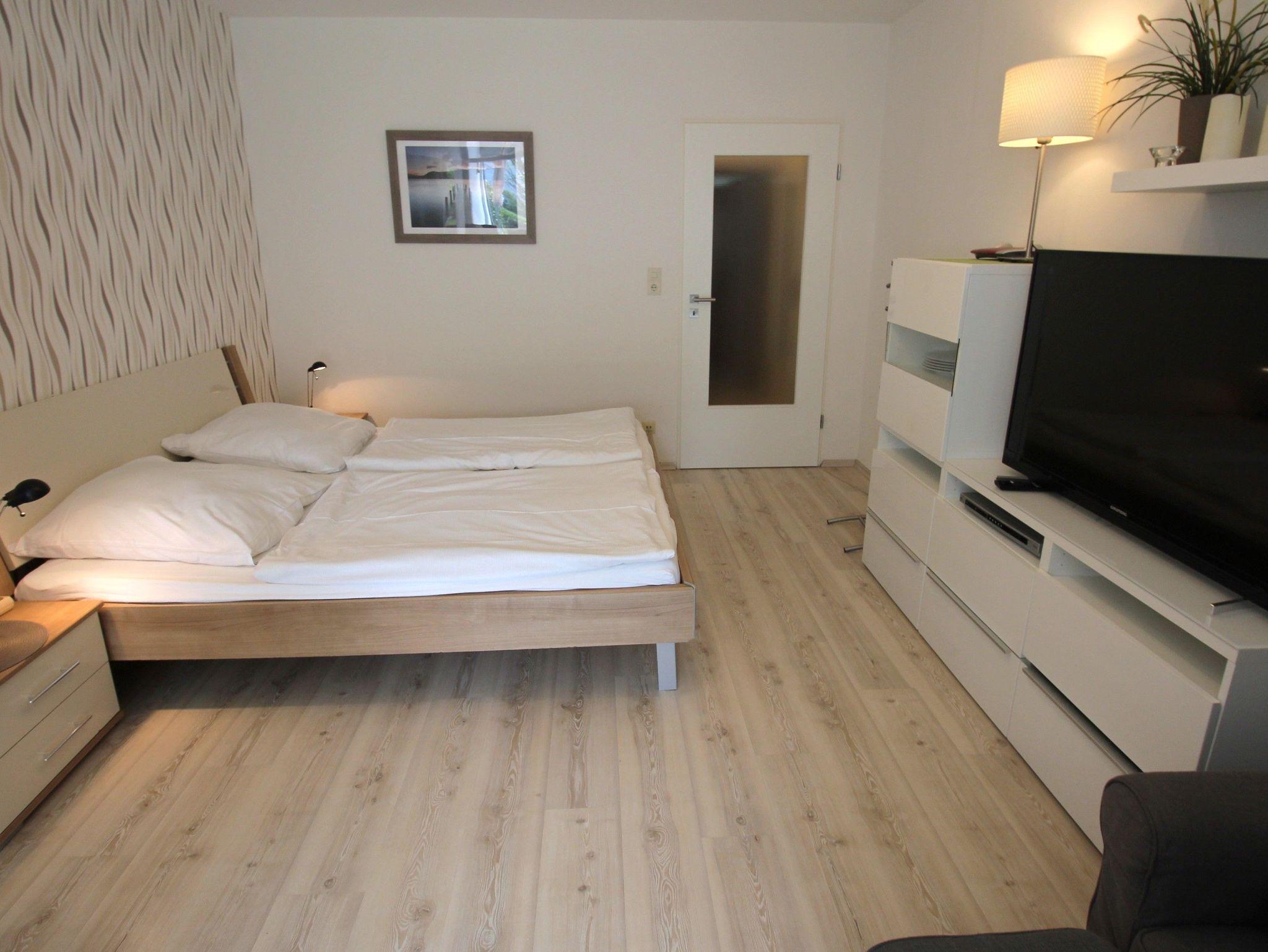 Sie wohnen in einem 2-Zimmer-Appartement für bis zu 4 Personen auf ca. 45 m² im EG. Die Ferienwohnung verfügt über ein Schlafzimmer mit Etagenbett, ein Wohn-/Schlafraum mit Doppelbett, separaten Essplatz und voll ausgestatteter Küchenbereich mit Geschirrspüler, Waschmaschine, Dusche/WC, Süd-West-Terrasse, Kabel-LCD-TV, PKW-Stellplatz vor dem Haus.