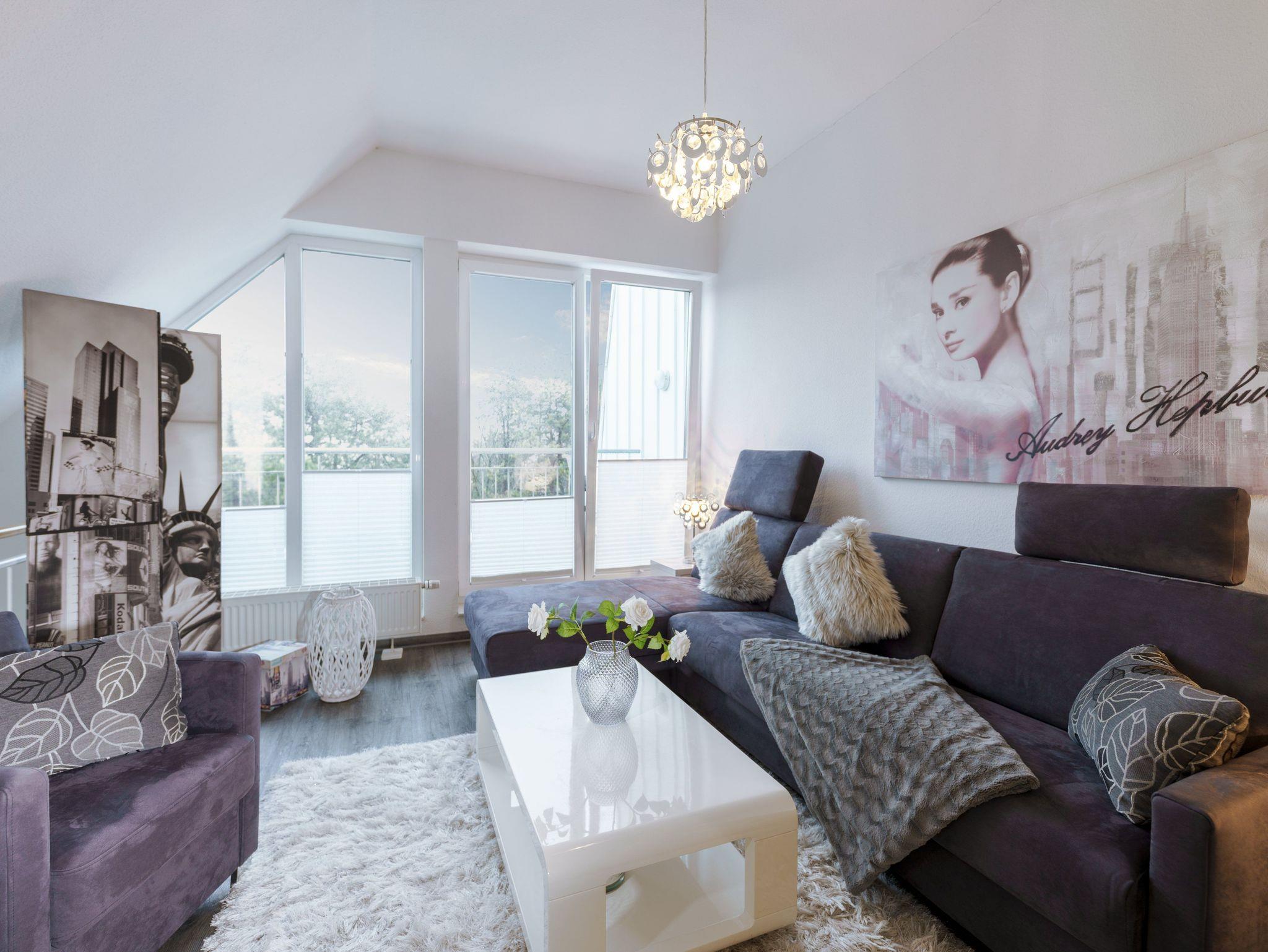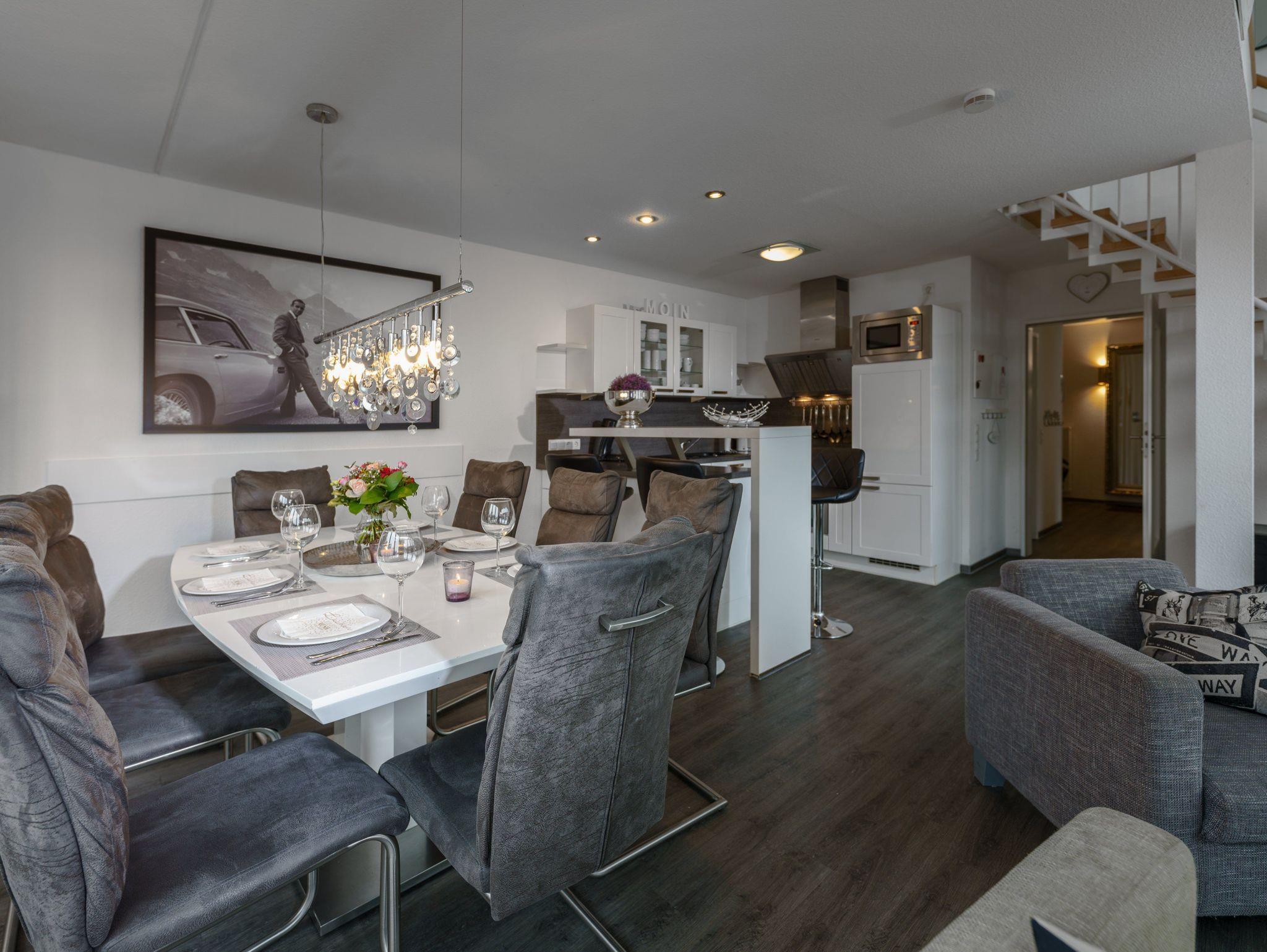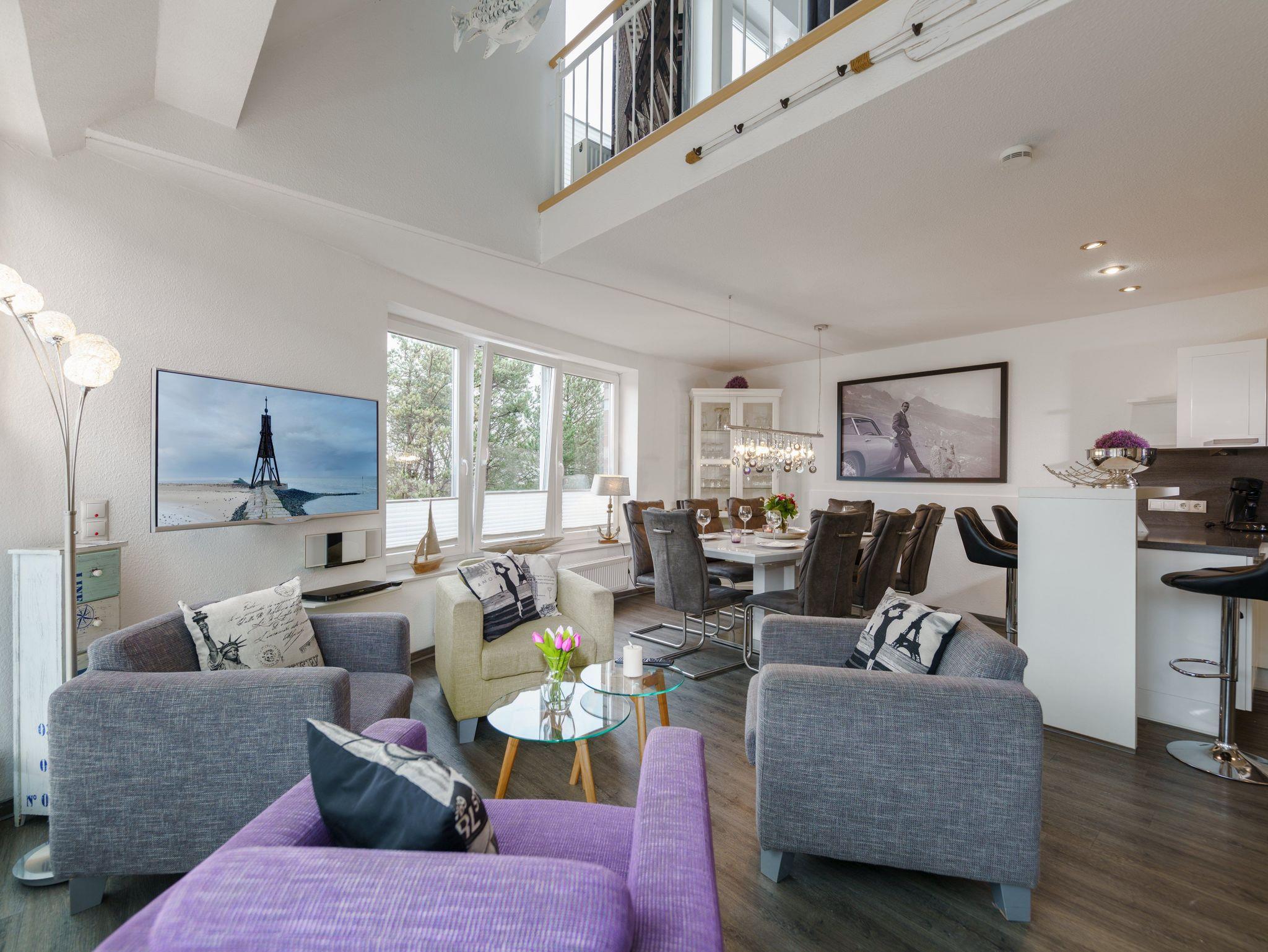 Sie wohnen in einem modern ausgest. 4-Zimmer-App. für bis zu 8 Personen auf ca. 110 m² im 3. + 4. OG mit Terrasse und Balkon, zwei Bädern und eigener Sauna.