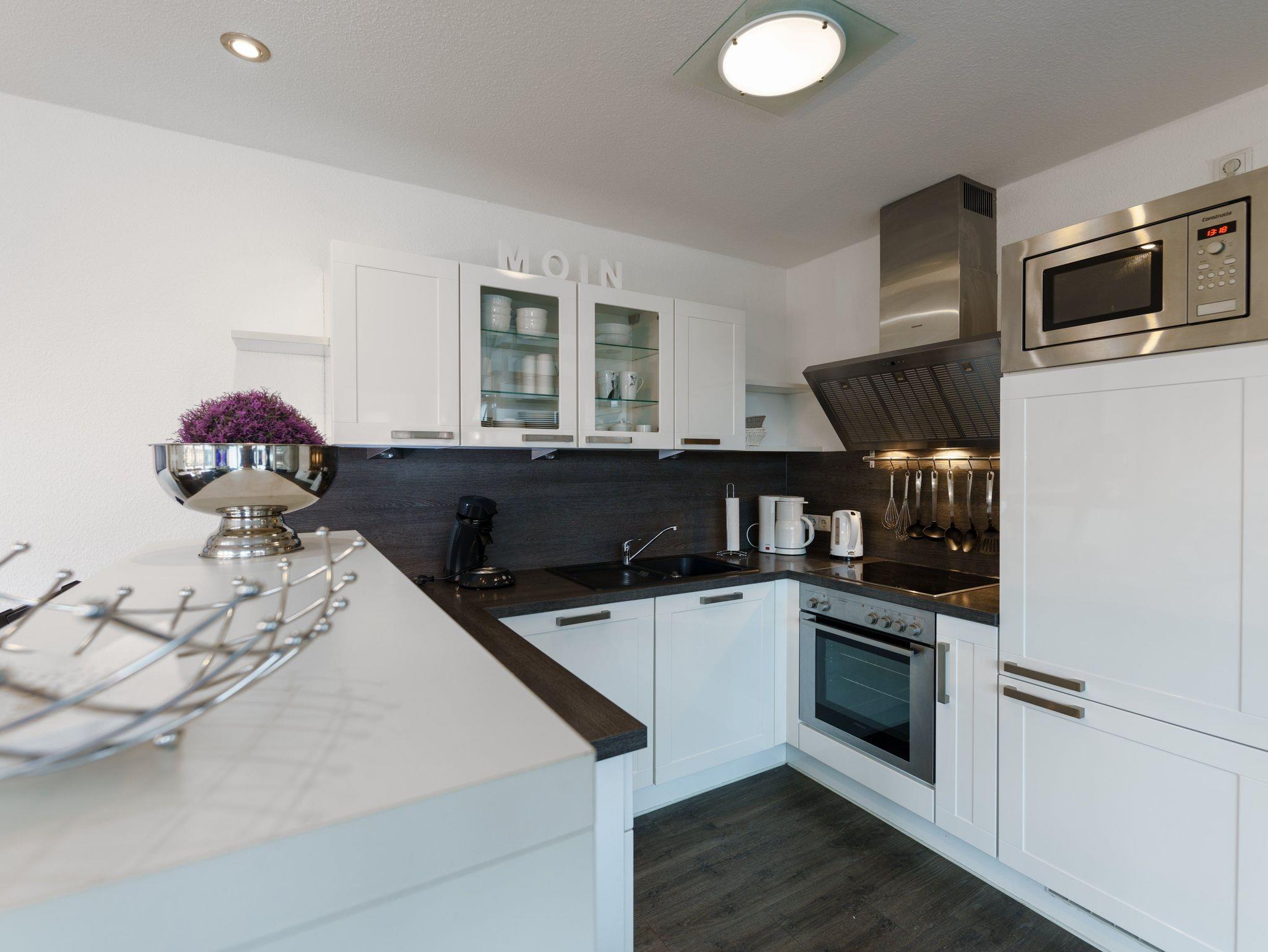 Ein gr. heller Wohnraum, Essplatz für bis zu 8 Pers. Küche mit Geschirrsp. und Mikrow., Backofen, Kühlsch., Gefrierf. sowie Kaffem. + Senseo. Die Küche hat einen Tresen, so dass Sie die Möglichkeit haben Snacks, Kleinigkeiten, Kaffee oder ein Glas Wein in direkter Kommunikation mit evtl. Essensvorbereitern an der Bar zu genießen.