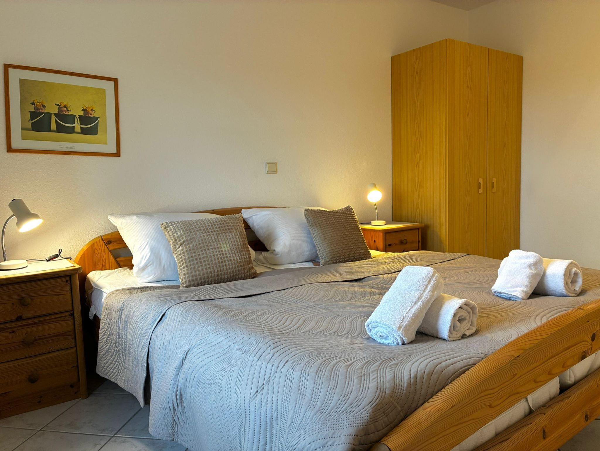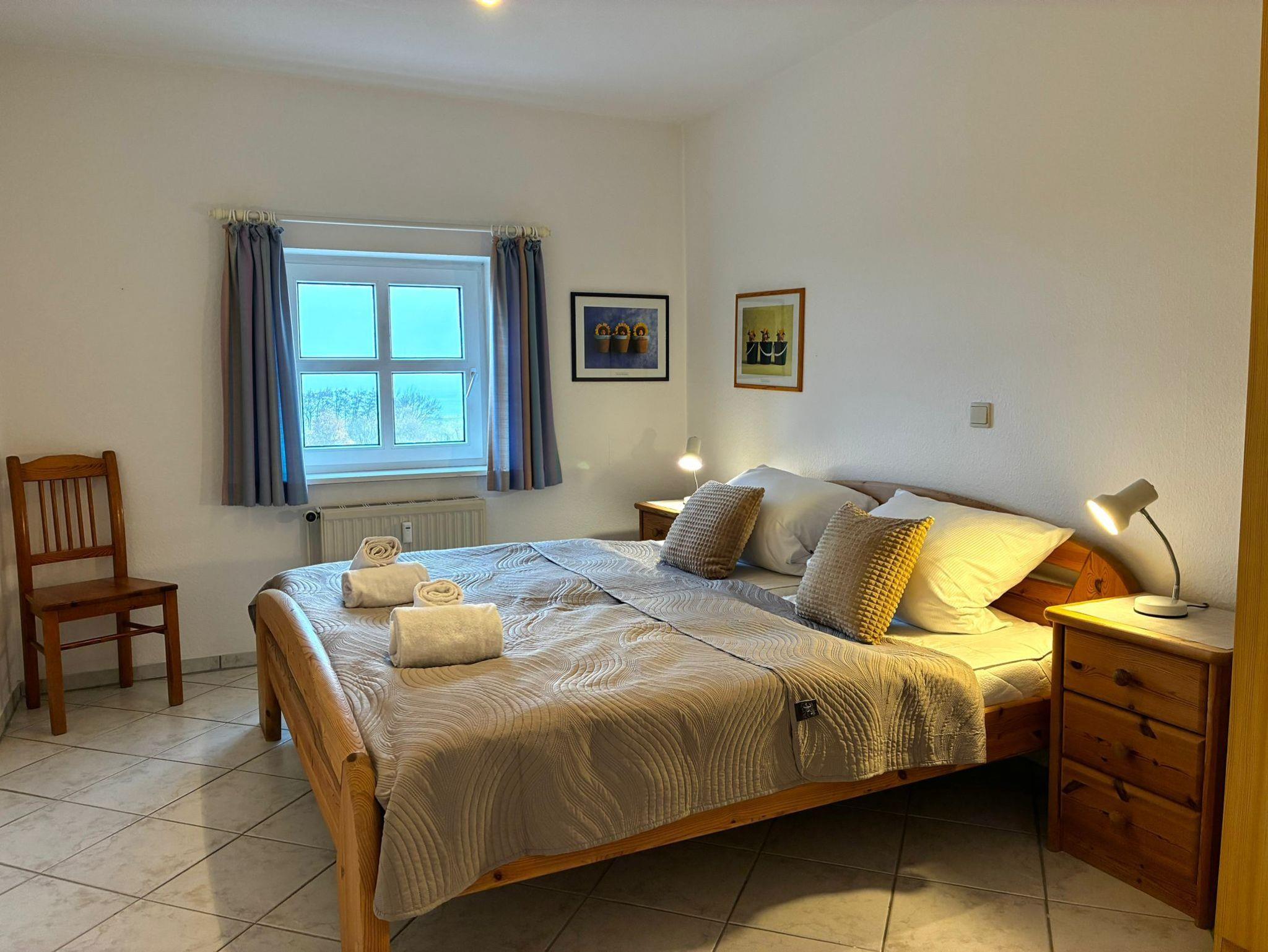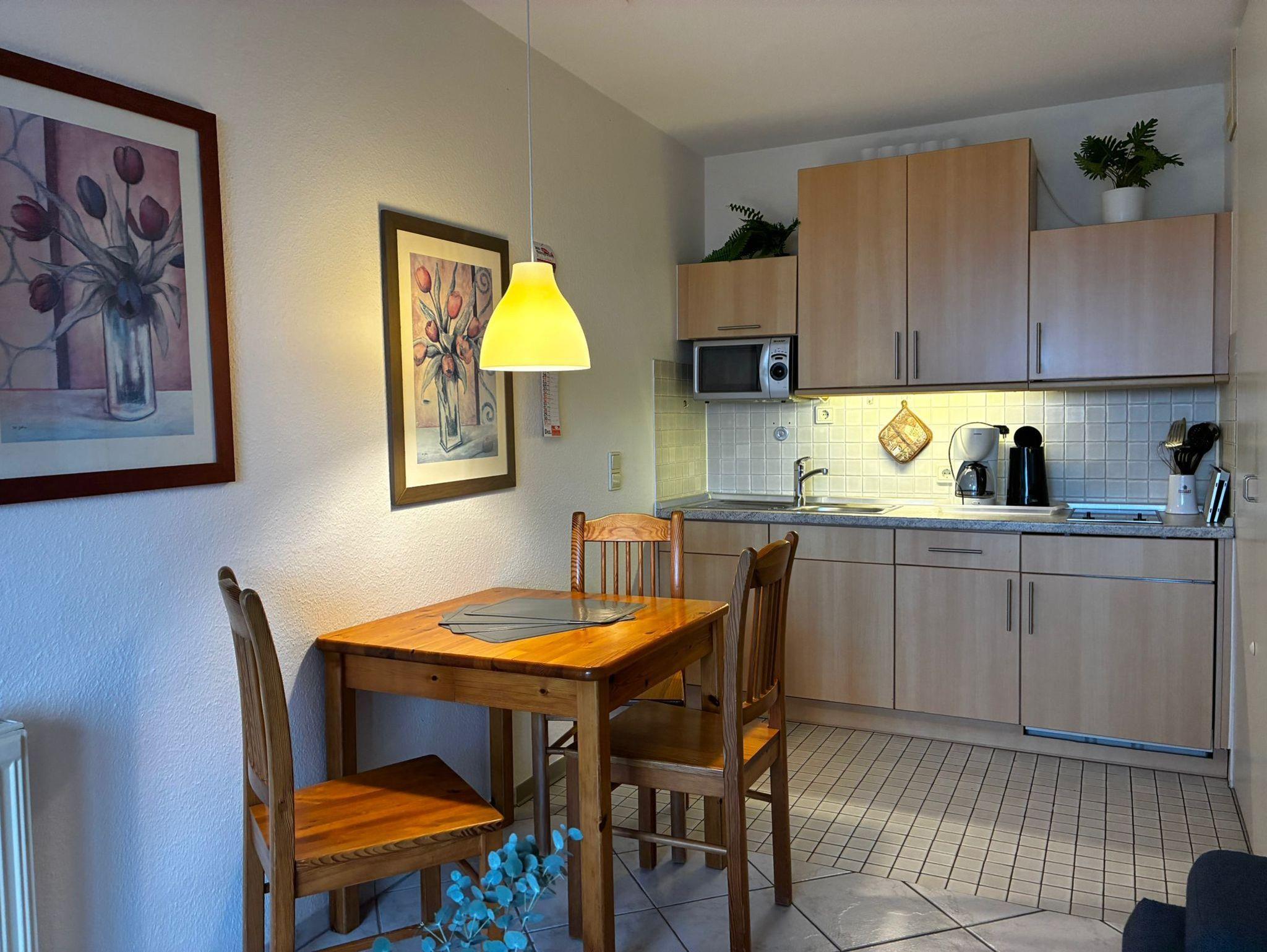 Willkommen in Ihrer Ferienwohnung mit Meerblick. Das gemütliche Apartment verfügt über einen Wohnraum mit offener Küche und Balkon, sowie ein Schlafzimmer mit Doppelbett und ein Bad mit Dusche und WC. Eine zweite Schlafmöglichkeit ist das Doppelschlafsofa im Wohnraum. Die Küche ist voll ausgestattet mit Kaffeemaschine, Wassserkocher, Mikrowelle, Toaster und Kühlschrank mit Gefrierfach.