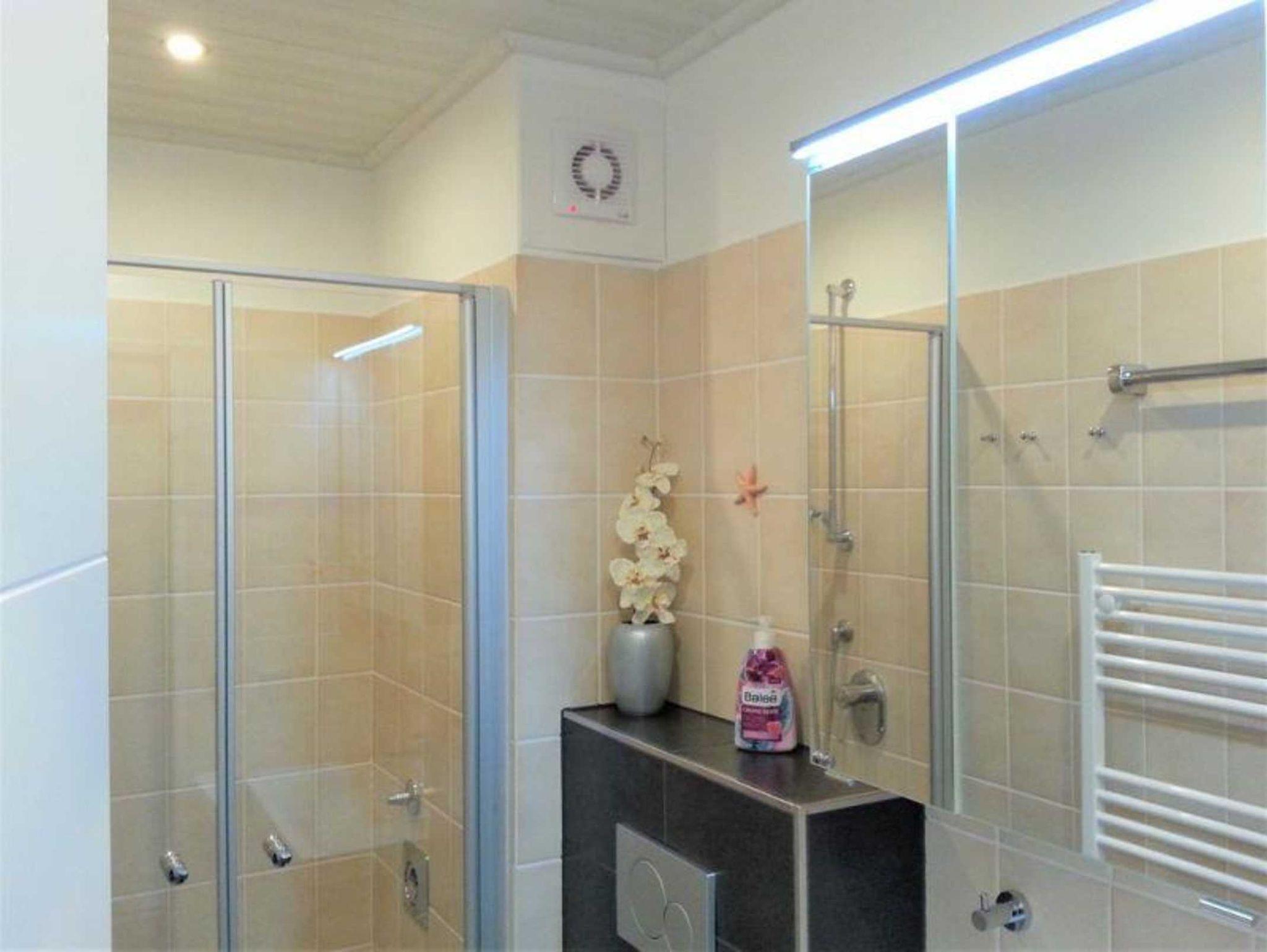 Badezimmer mit Dusche/WC, möblierter Balkon zur Westseite mit Seeblick in Richtung Insel Neuwerk,