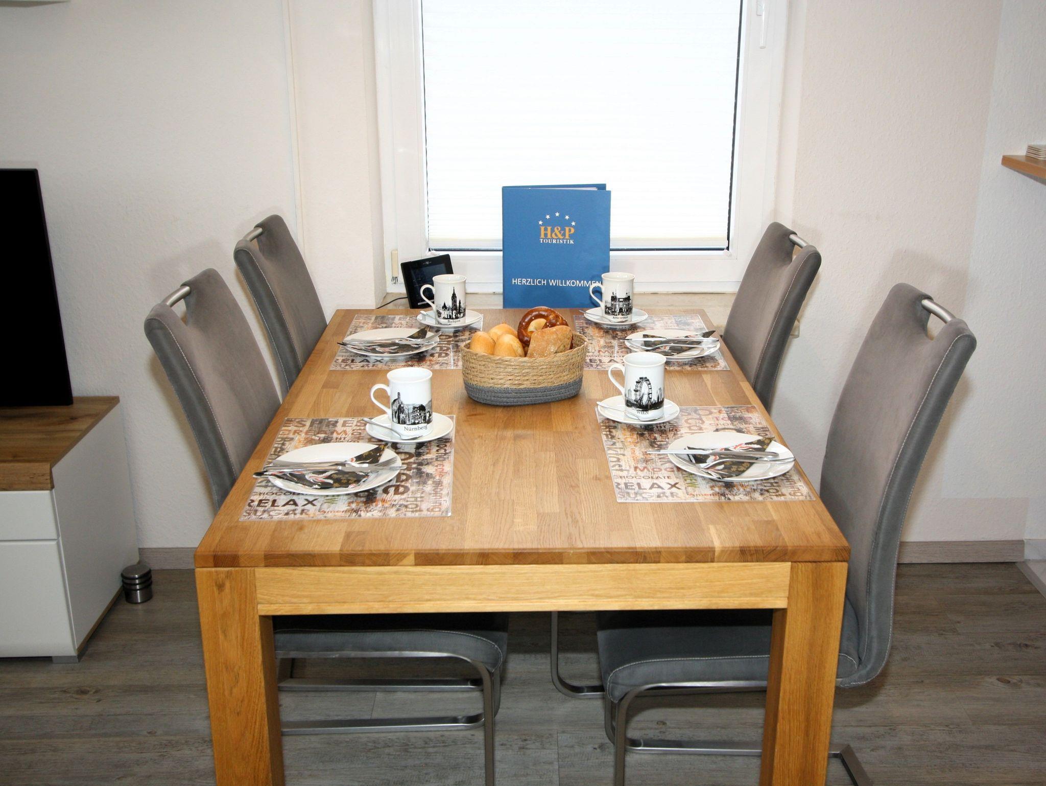 Der Wohn-/Schlafraum ist mit hochwertigen Möbeln ausgestattet. Die sehr bequeme Eckcouch ist schnell und einfach in ein Doppelbett mit der Größe 180 cm x 200 cm umzuwandeln. Der separierte Essbereich, LCD-TV, DVD-Player gehören ebenfalls zur hellen Wohnung dazu. Der voll ausgestattete Küchenbereich (mit 2-Platten Induktionskochfeld (ohne Backofen), Geschirrspüler, Mikrowelle mit Grill- und Backfunktion, Kaffeemaschine, Wasserkocher, Toaster, Eierkocher, ausreichend Geschirr und Besteck) sowie ein großer Eckbalkon runden das Angebot ab.
