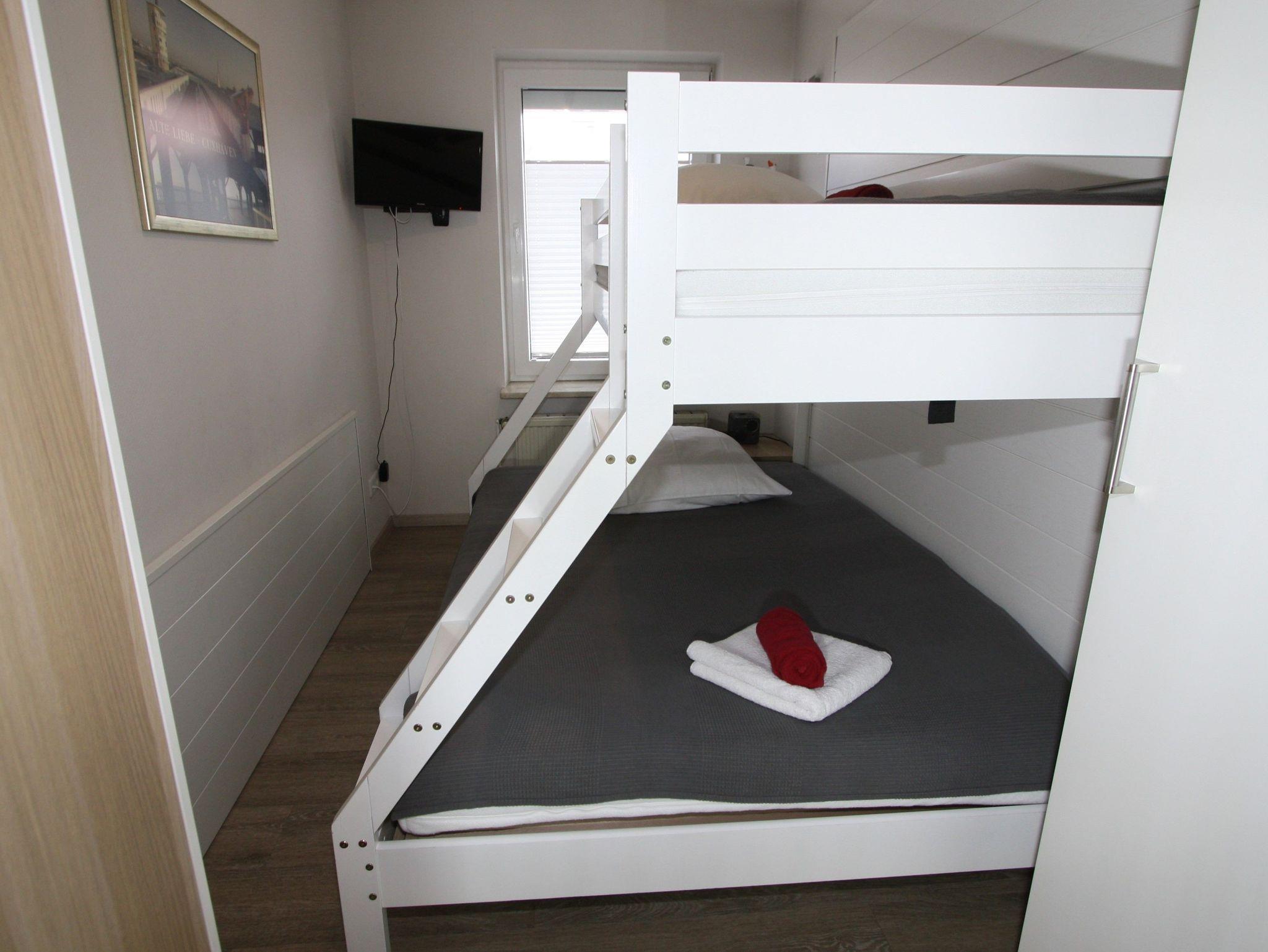 Das vorhandene Doppelstockbett hat unten eine Größe von 140 cm x 200 cm und oben von 90 cm x 200 cm. Es sind zwei geräumige Kleiderschränke vorhanden, wobei bei einem noch ein Safe fest eingebaut ist.