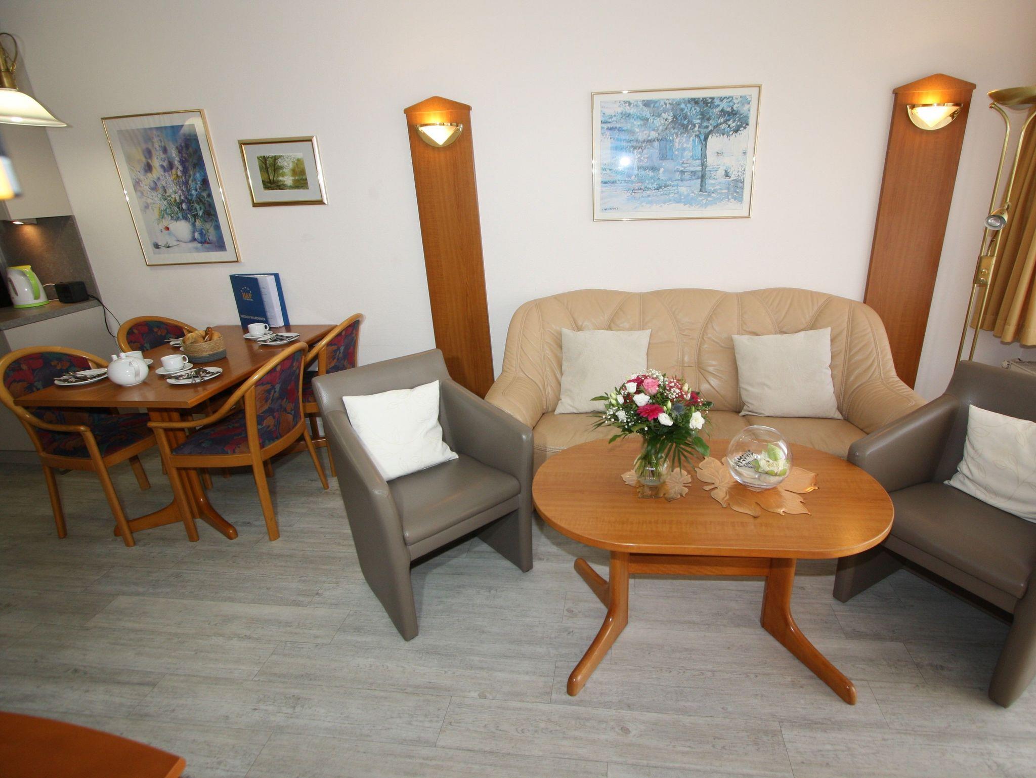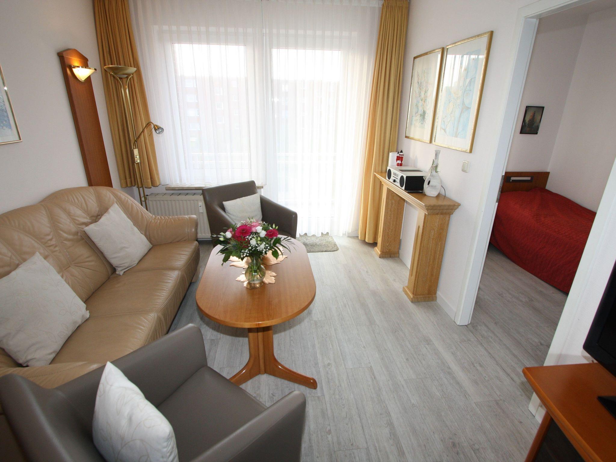 Sie wohnen in einem großzügigen 2-Zimmer-Appartement für bis zu 4 Personen auf 53 m² Wohnfläche im 2. Obergeschoss: ein separates Schlafzimmer mit zwei Einzelbetten, Wohnraum mit integriertem Schlafbereich und Doppelbett, Flachbild-TV, HiFi-Anlage, DVD-Player, separater Essplatz, voll ausgestatteter Küchenbereich mit Geschirrspüler, Ceranfeld, Backofen und Mikrowelle. Dusche/WC, Süd-Balkon, Tresor, WLAN.