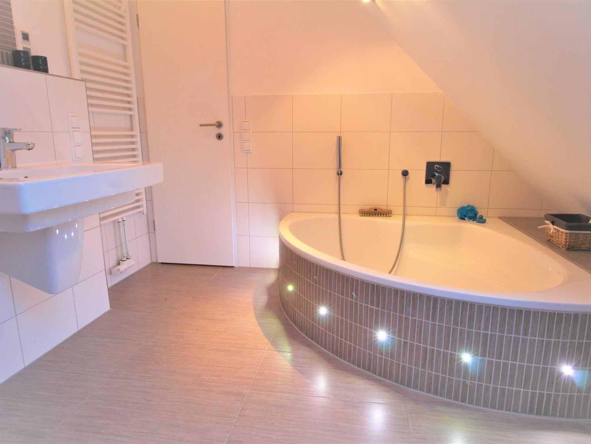 Obere Ebene: Großzügiges Wohlfühlbad mit beleuchteter Eckbadewanne, Kosmetiktisch sowie Föhn sind vorhanden. Optimaler Radioempfang durch große Lautsprecher.