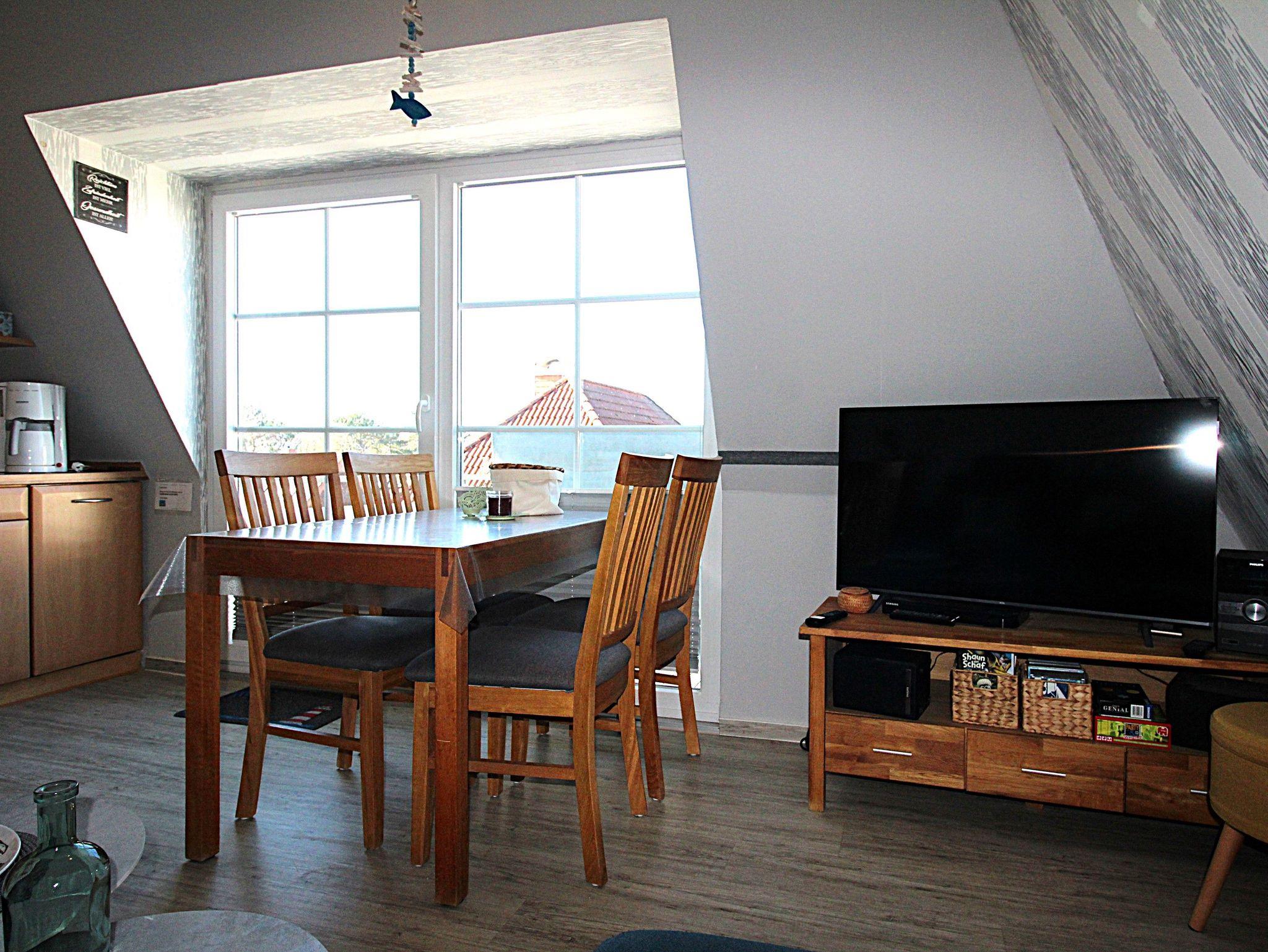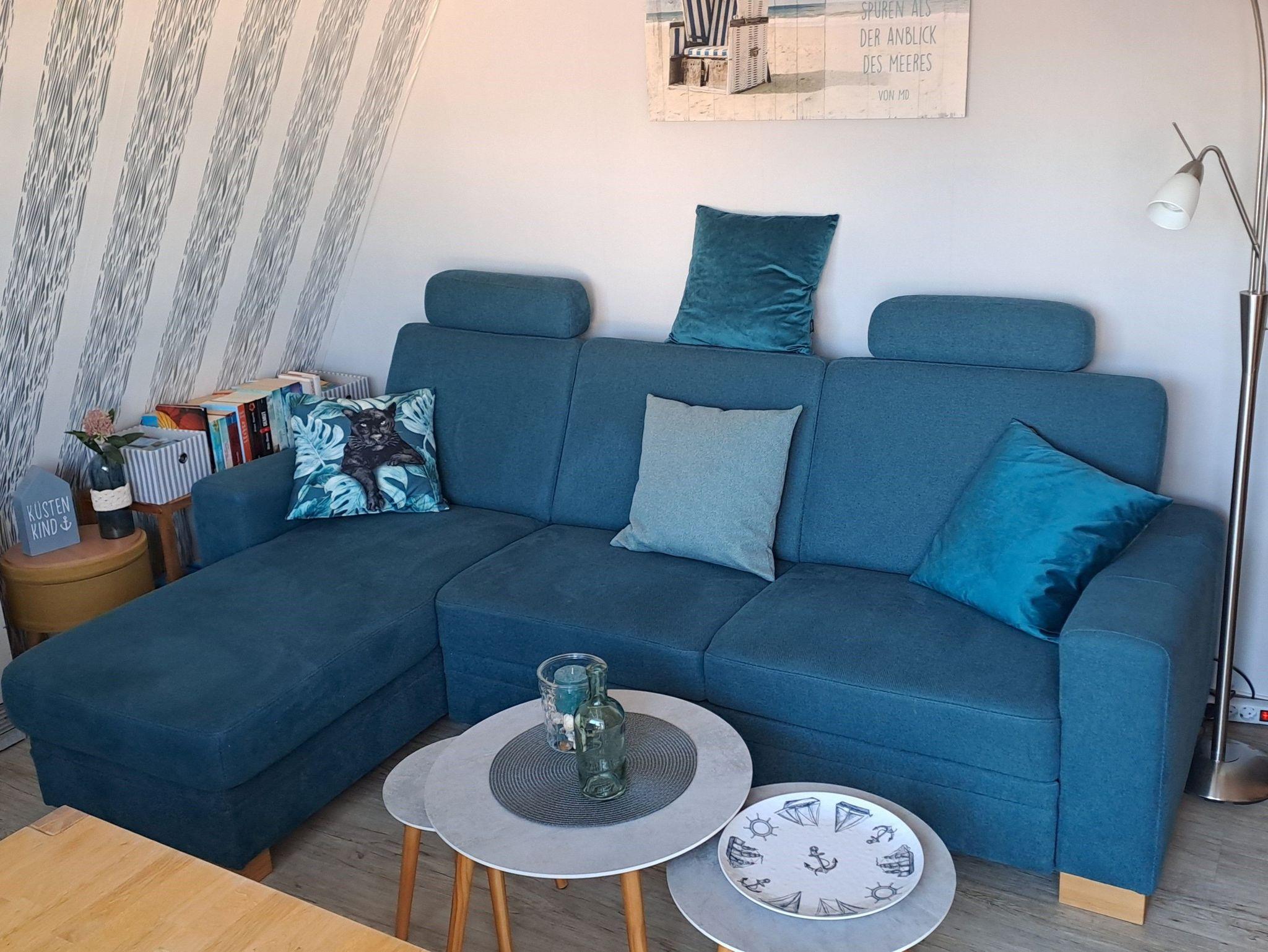 Der Wohnraum lädt mit der gemütlichen Sitzecke zum Relaxen ein. Aktuelle Bücher, Flachbildschirm, Blu-ray-Spieler, Radio, CDs, DVDs und diverse Spiele stehen für unsere Gäste bereit.