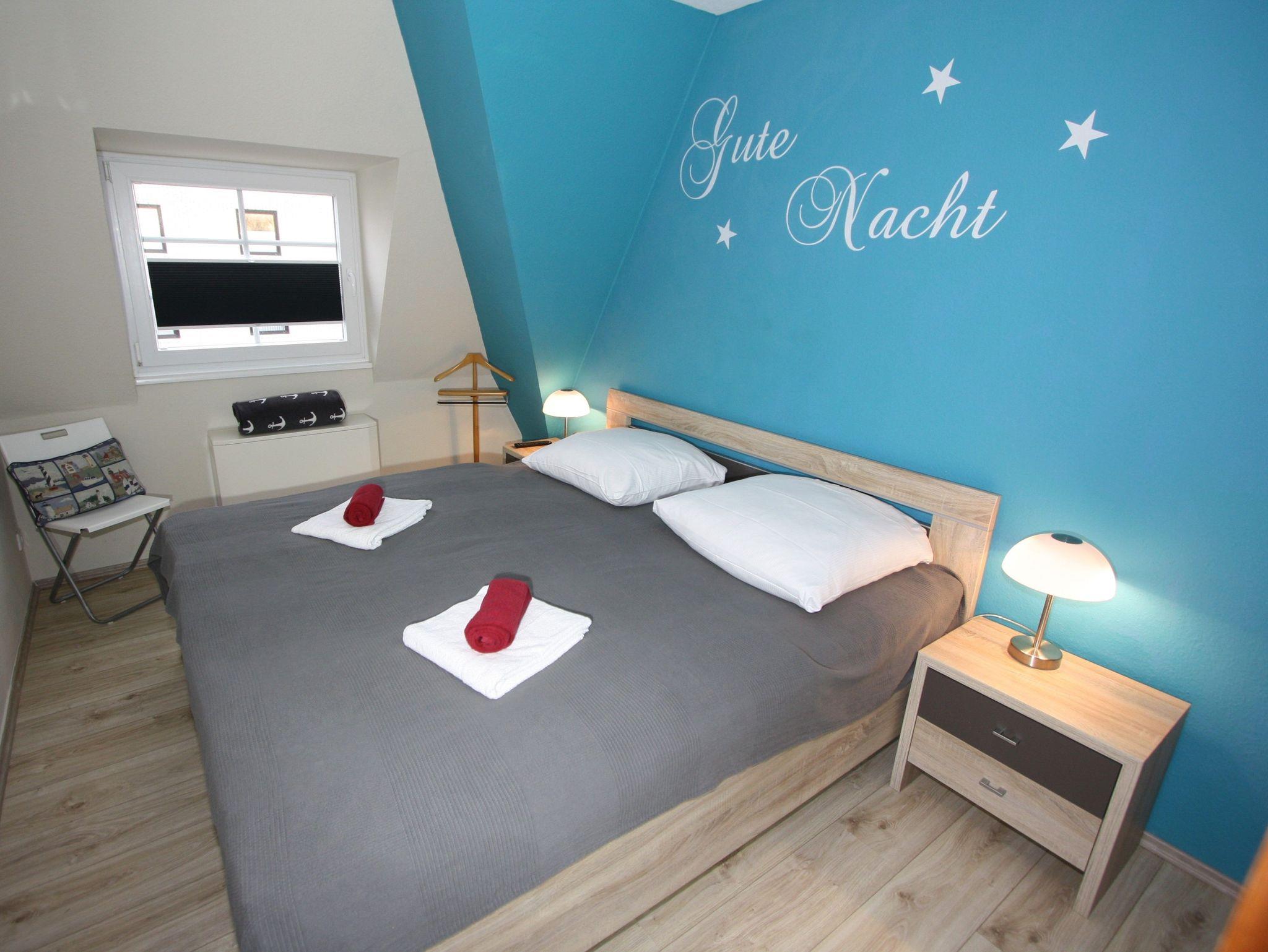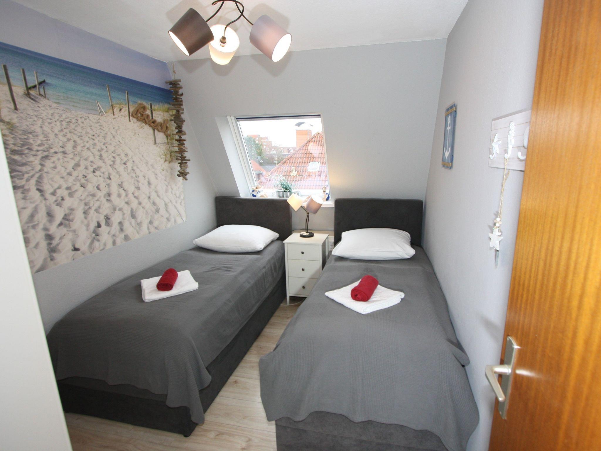 Das zweite Schlafzimmer ist modern und maritim eingerichtet. Für unsere Gäste stehen zwei getrennt stehende Boxspringbetten (90 cm x 200 cm)