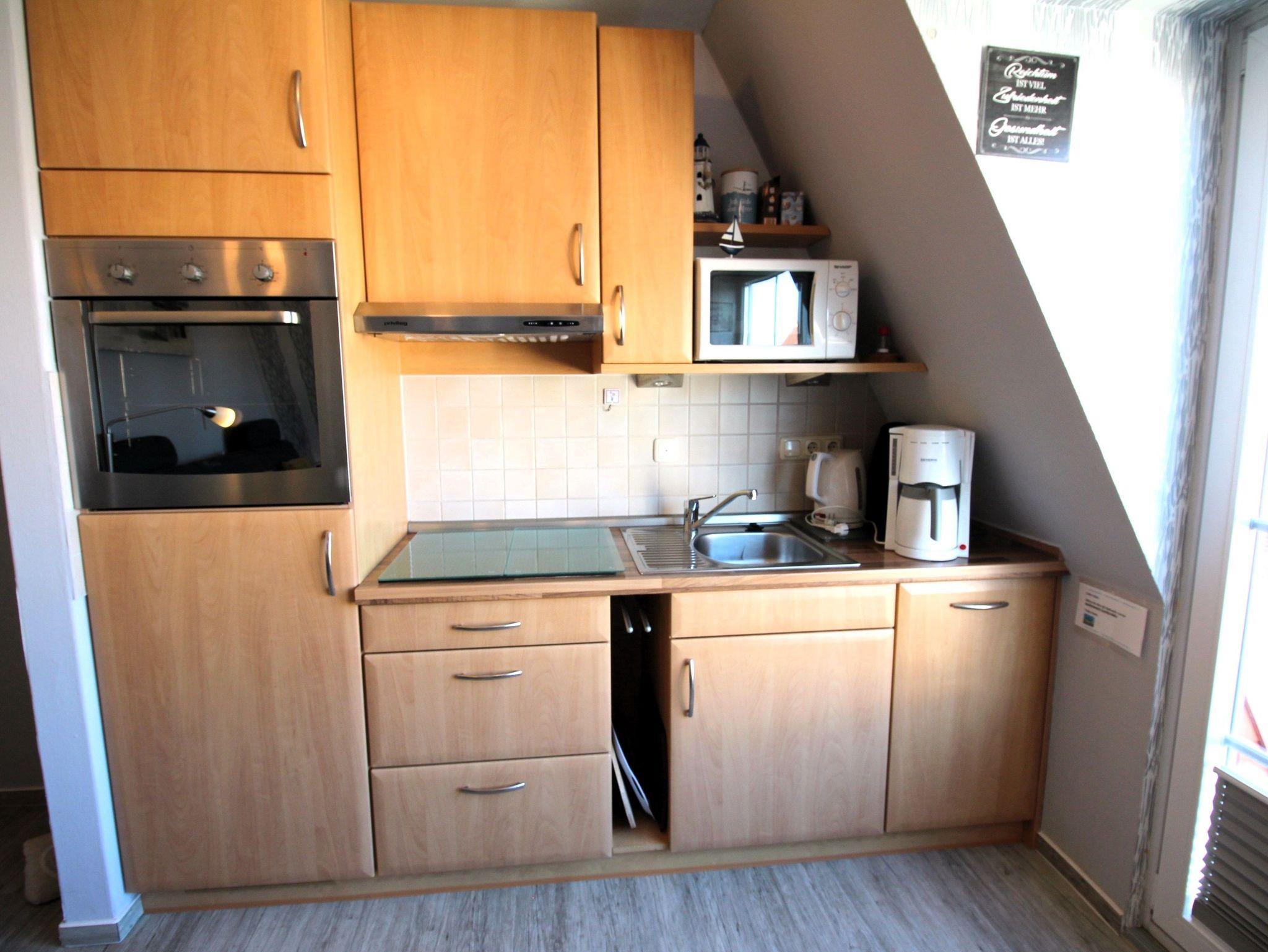 Im 2024 renovierten Wohn-/ Esszimmer befindet sich eine hochwertige Küchenzeile mit Geschirrspüler, Kühlschrank, 4-Platten-Ceranfeld mit Kindersicherung, Backofen, Dunstabzugshaube, Mikrowelle, Kaffeemaschine, Senseo Maschine, Toaster, Wasser- und Eierkocher, ausreichend Besteck, Geschirr und Gläser.