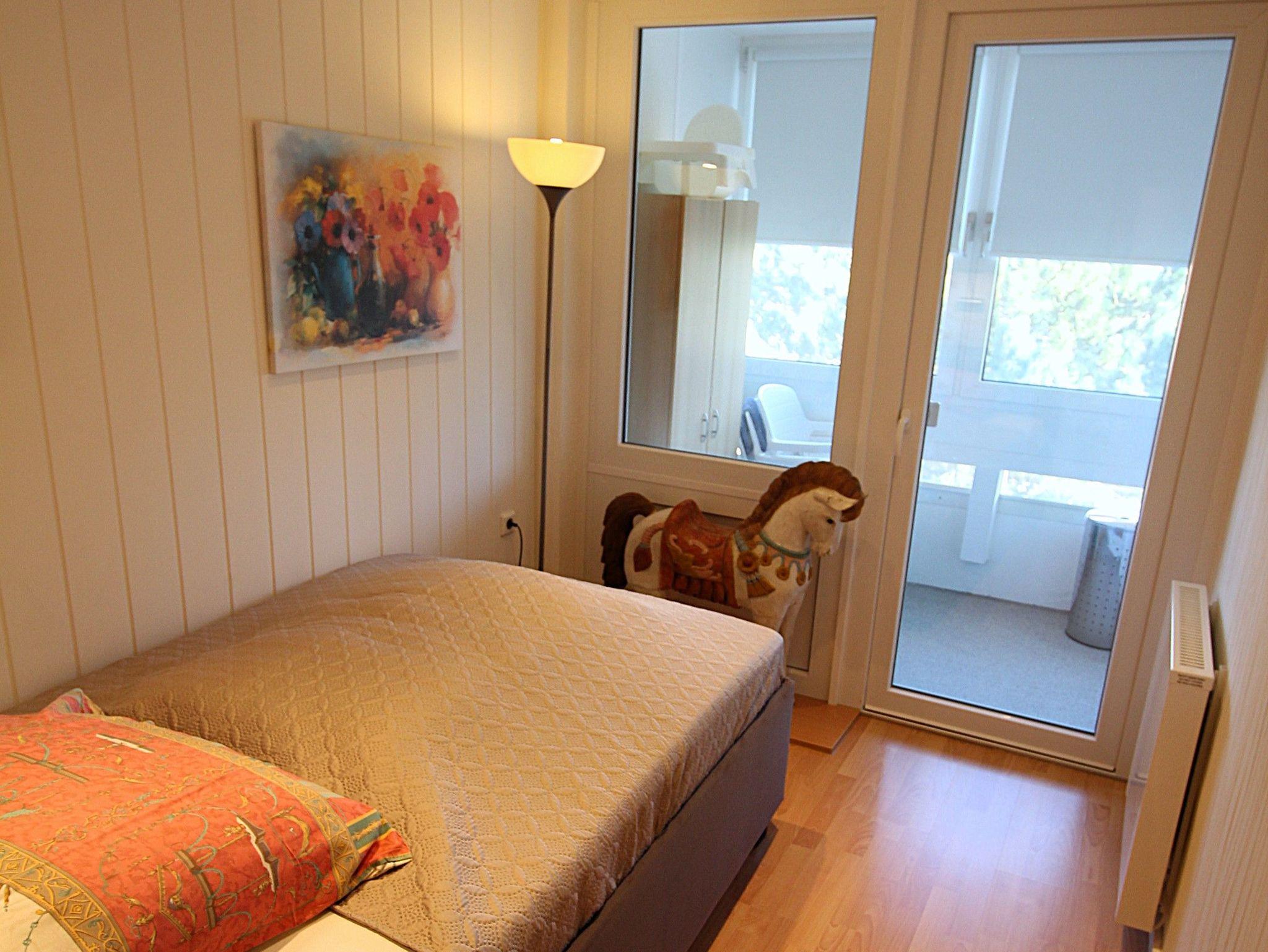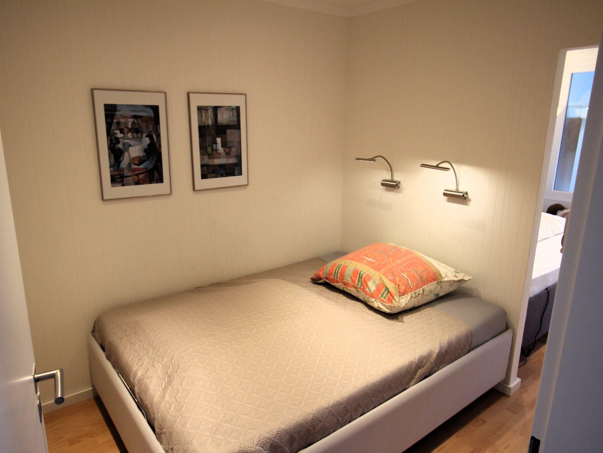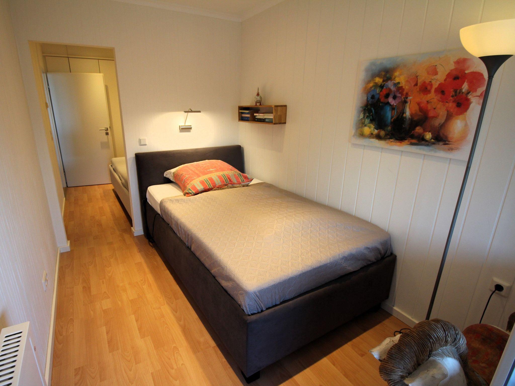 Auch vom Schlafzimmer, das über zwei abgetrennte Schlafbereiche mit einem Doppelbett bzw. einem Einzelbett verfügt, gibt es Zugang zu einer kleinen Loggia. Komplettiert wird die Ferienwohnung durch das Bad mit bodengleicher Dusche.