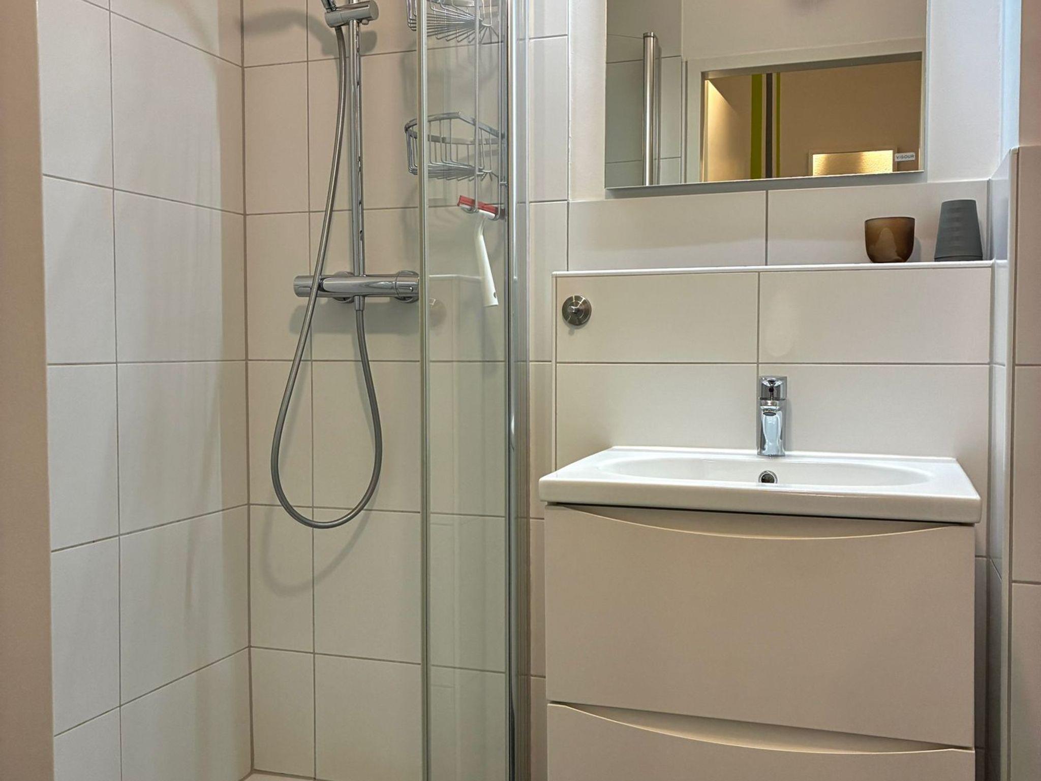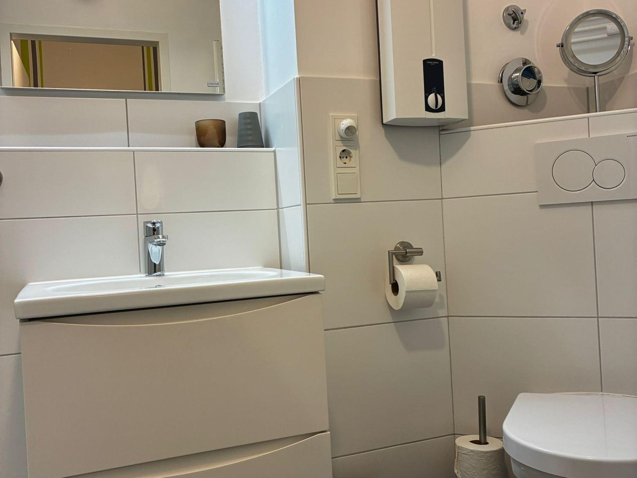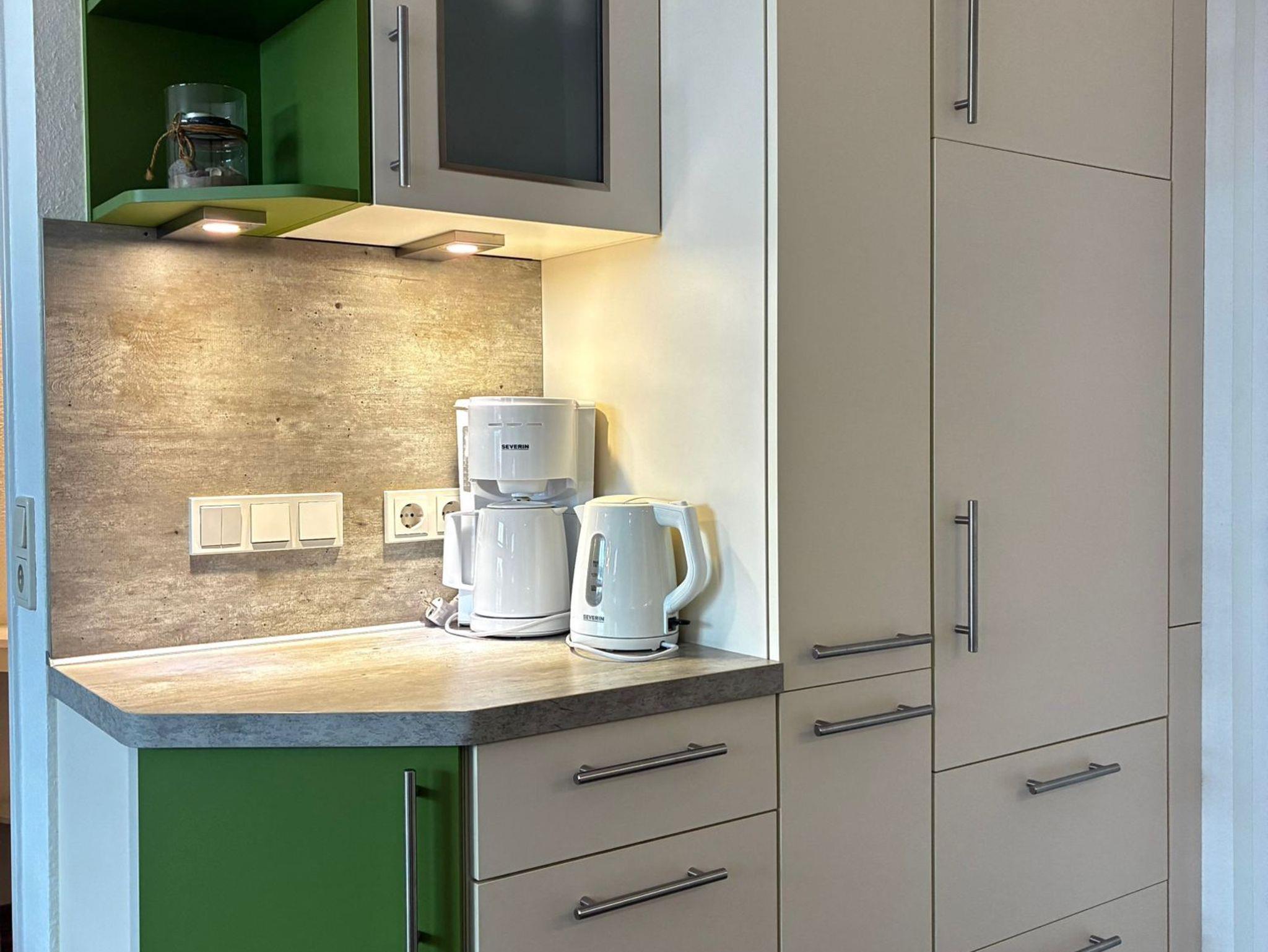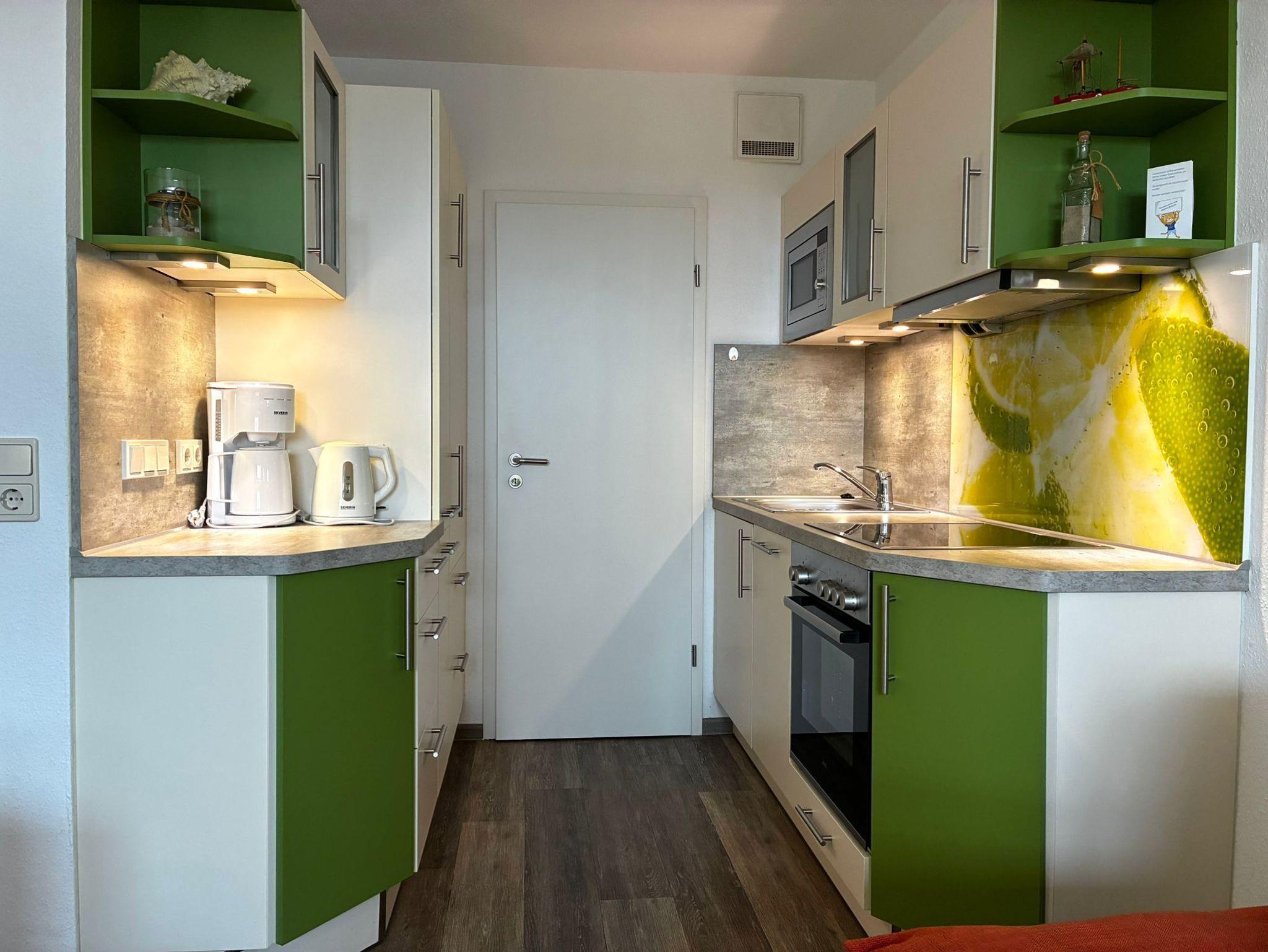 Sie wohnen in einem 2-Zimmer-Appartement mit ca. 41 m² im 4. OG. Diele mit Sitzbank und Garderobe, Wohnraum mit Schlafcouchund Kabel-Flachbild-TV, Stereo-Anlage und Blu-ray-Player, separater Essplatz, voll ausgestatteter Küchenbereich mit Ceranfeld, Backofen, Geschirrspüler und Mikrowelle mit Backofenfunktion, Schlafraum mit Doppelbett, 2. Flachbild-TV, modernes Bad mit Dusche/WC, überdachter Balkon mit Südausrichtung. In der Wohnung befindet sich ebenfalls ein großer Abstellraum. Kostenloser Parkplatz vorhanden vor demParkdeck.