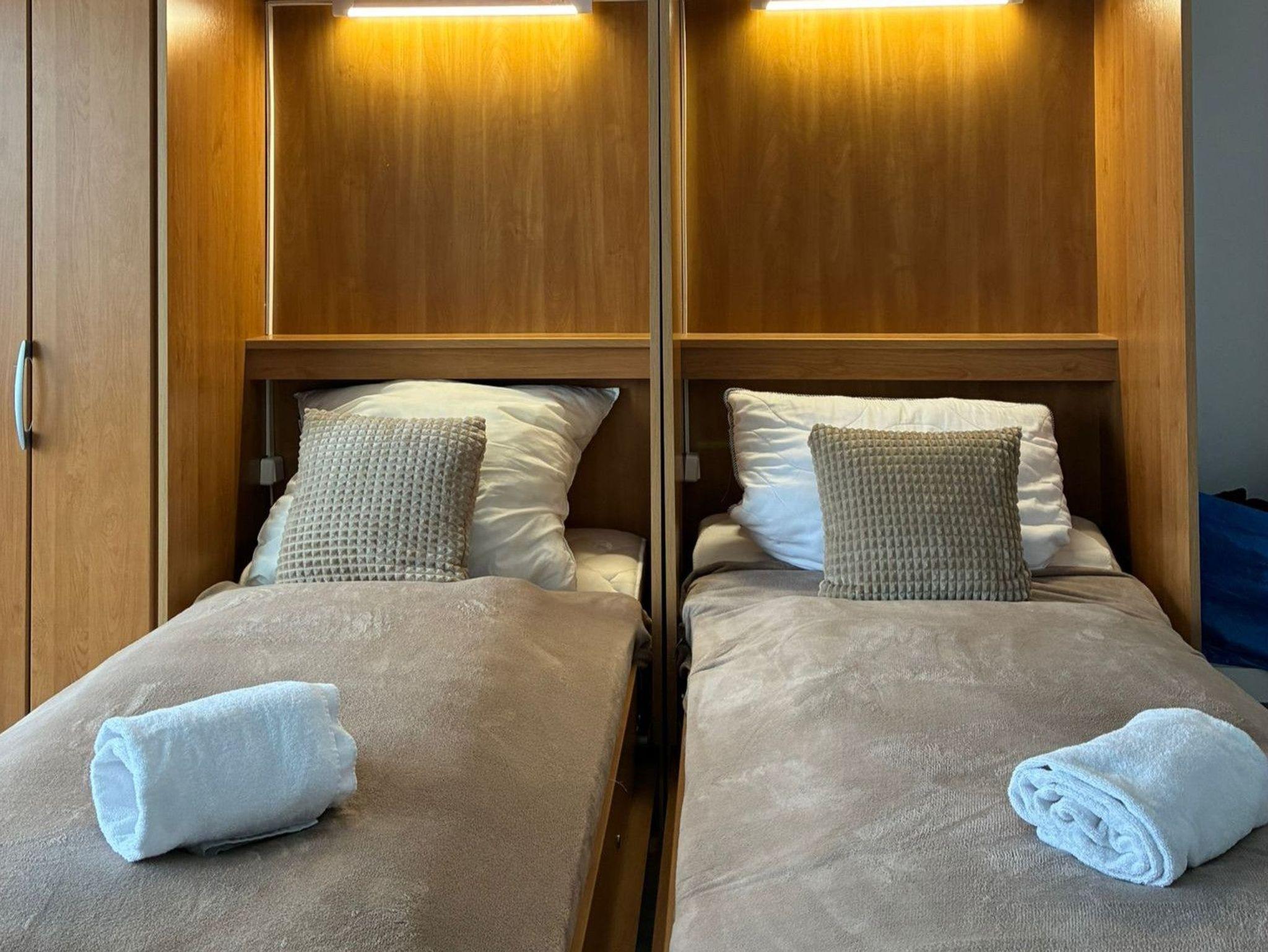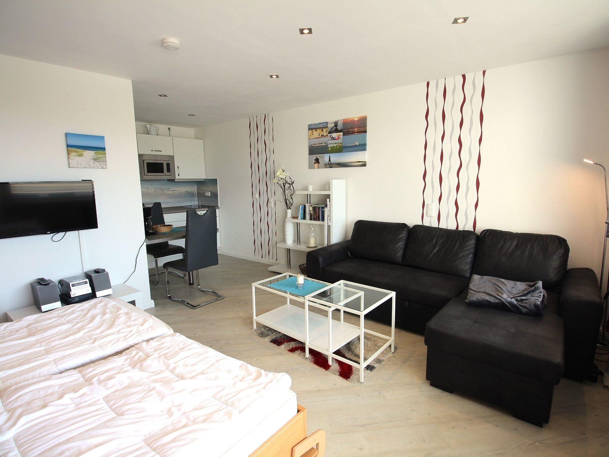 Sie wohnen in einem 1-Zimmer-Appartement für bis zu 2 Personen auf ca. 35 m² Wohnfläche, ein Wohn-/Schlafraum mit zwei einzelnen Schrankbetten und einer großen Couch mit Ottomane. Im Mediabereich steht ein schwenkbarer Flachbild-Fernseher und eine Mikro-Stereoanlage zur Verfügung. Die Küchenzeile ist u.a. mit Mikrowelle und einem Cerankochfeld mit zwei Platten ausgestattet. Der Essplatz befindet sich direkt an der Küche, ideal für kurze Wege.