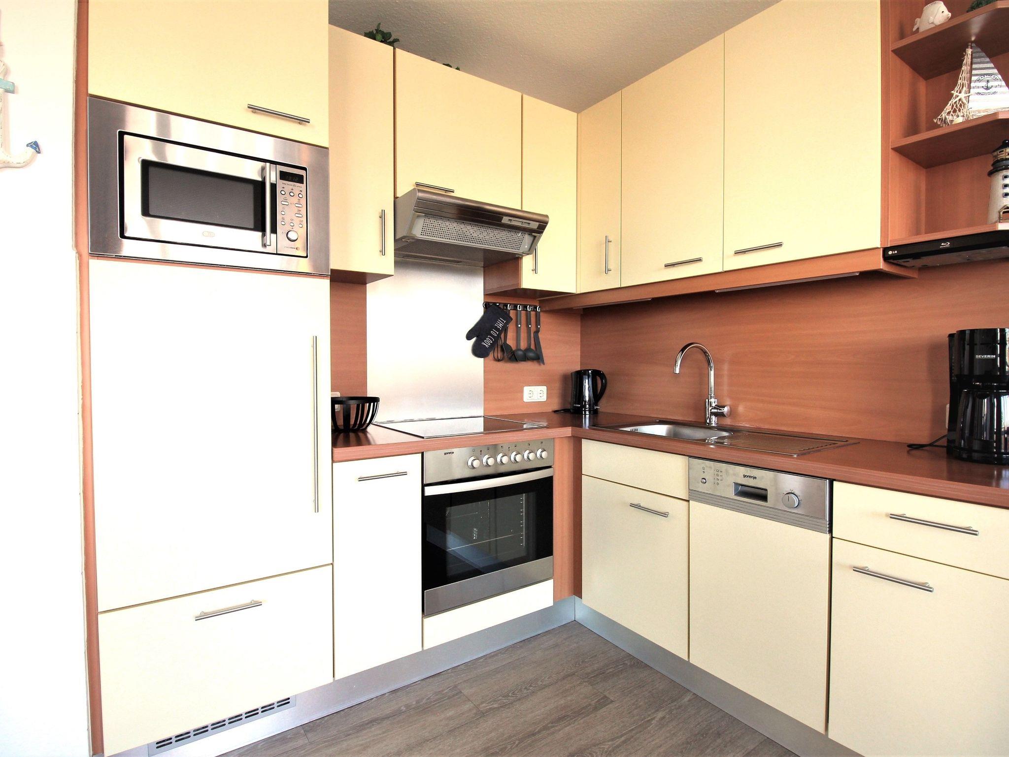 ° voll ausgestatteter Küchenbereich mit Geschirrspüler, Elektroherd mit Ceranfeld und Backofen, Mikrowelle