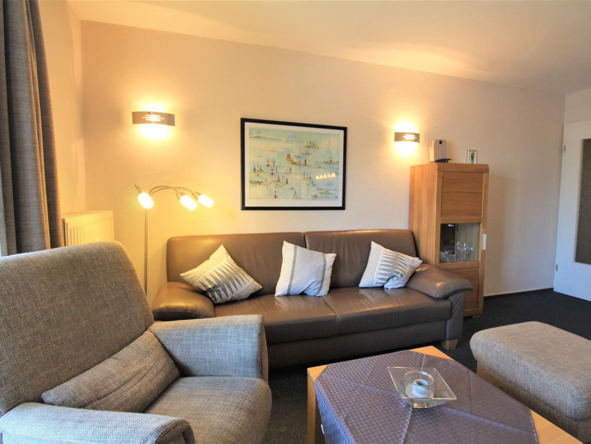 3-Zimmer-Appartement für bis zu 4 Personen auf ca. 50-55 m². Zwei Schlafzimmer mit Doppel-/Einzel- oder Etagenbetten. Wohnraum mit Couch, TV, separatem Essplatz im Erker und voll ausgestattetem Küchenbereich. Balkon. Bad mit Dusche/WC. WLAN und PKW-Stellplatz vorhanden.