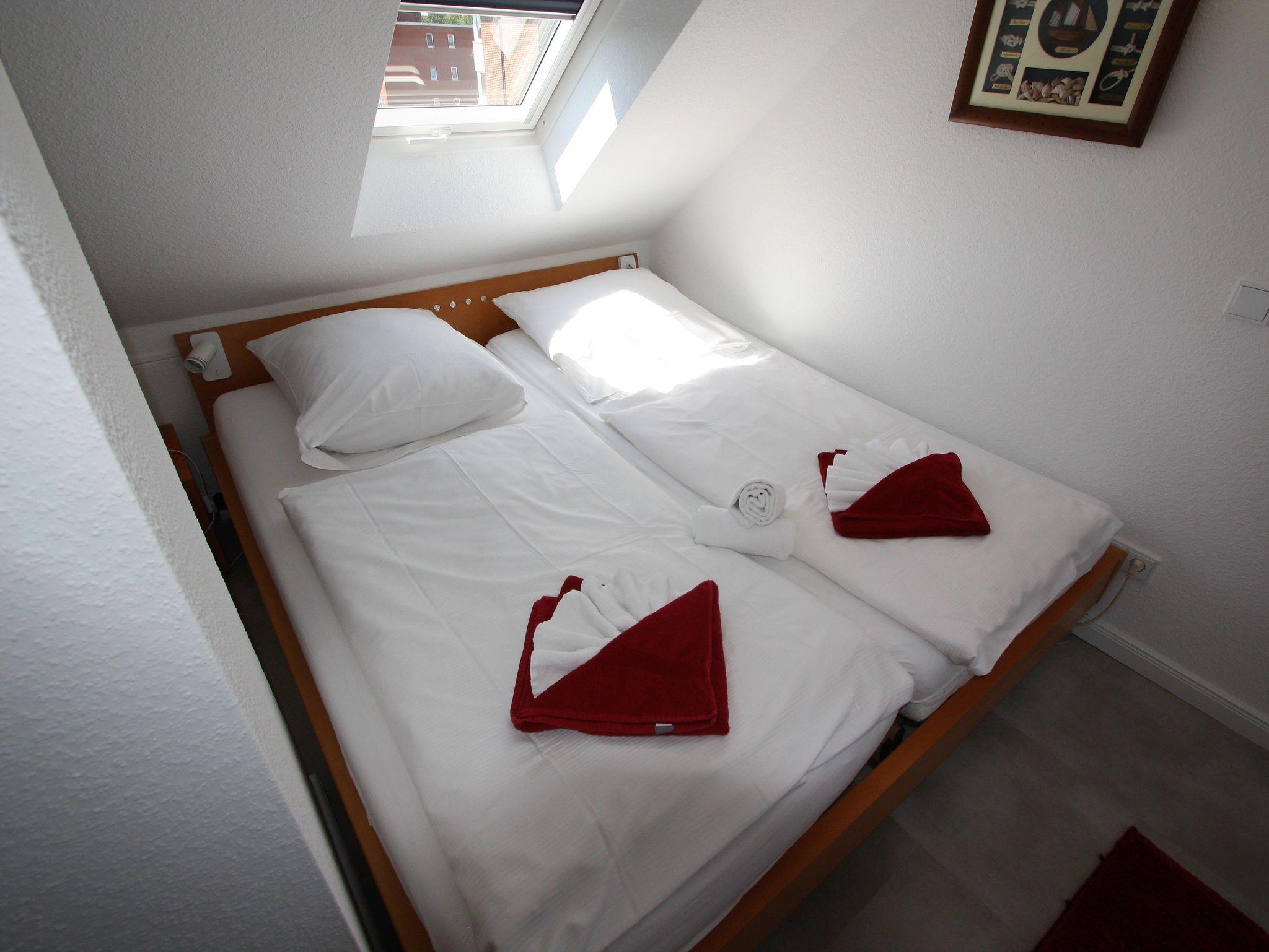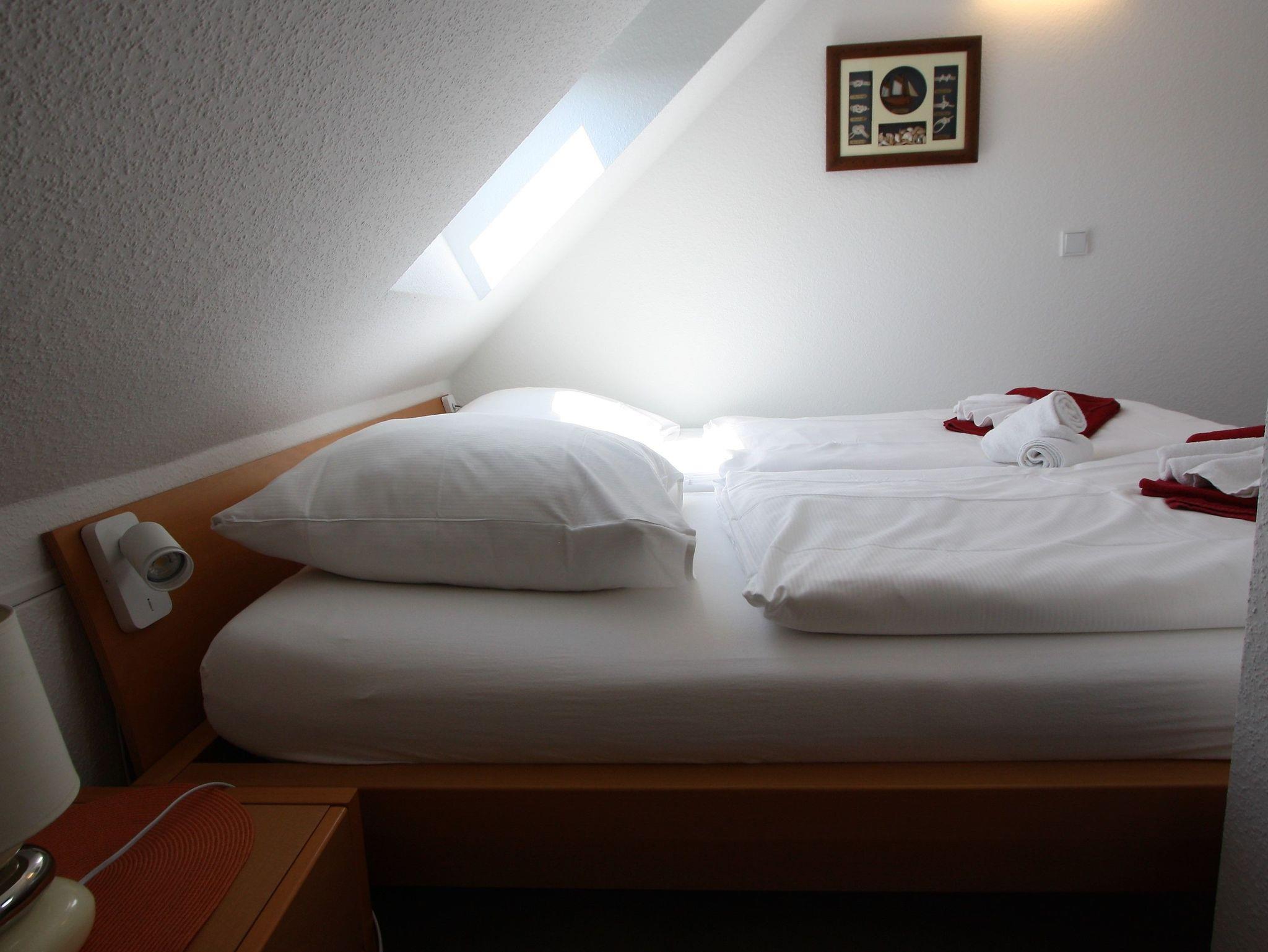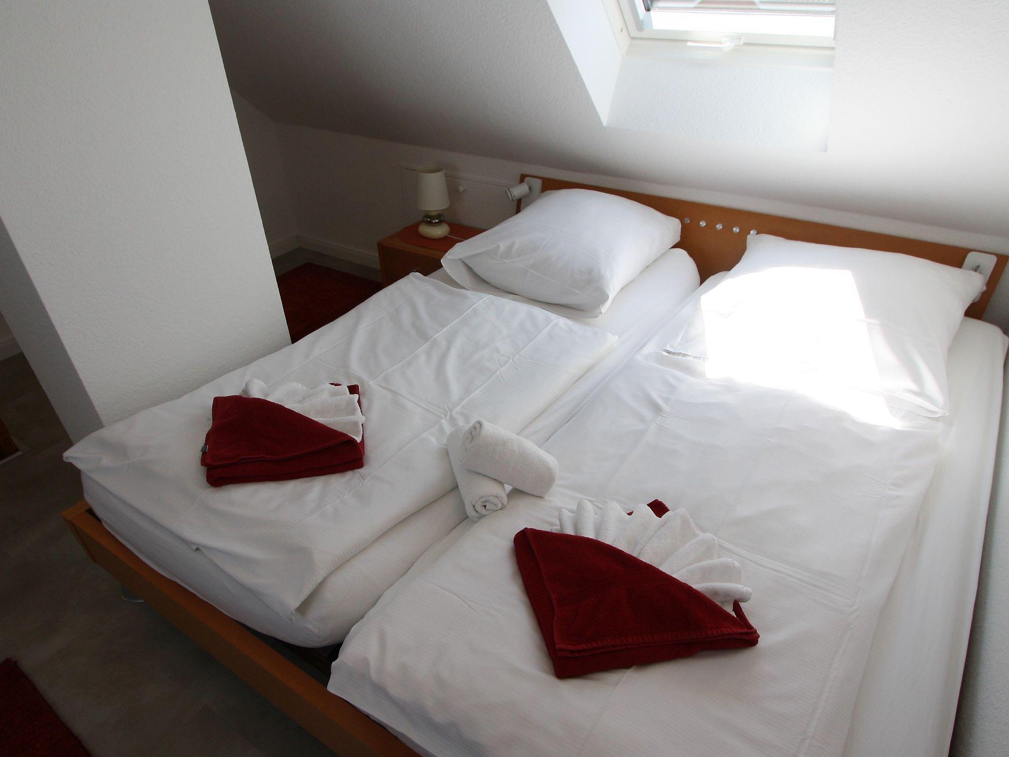 Sie verfügt über zwei separate Schlafzimmer. Ein Schlafzimmer mit zwei getrennt stehenden Einzelbetten, sowie ein Schlafzimmer mit Doppelbett im gemütlichen Dachgeschoss. Im offenen Wohnraum befindet sich eine bequeme Couchgarnitur mit Blick auf einen Flachbild-TV. Zudem steht Ihnen ein kostenloser Internetzugang unbegrenzt zur Verfügung.