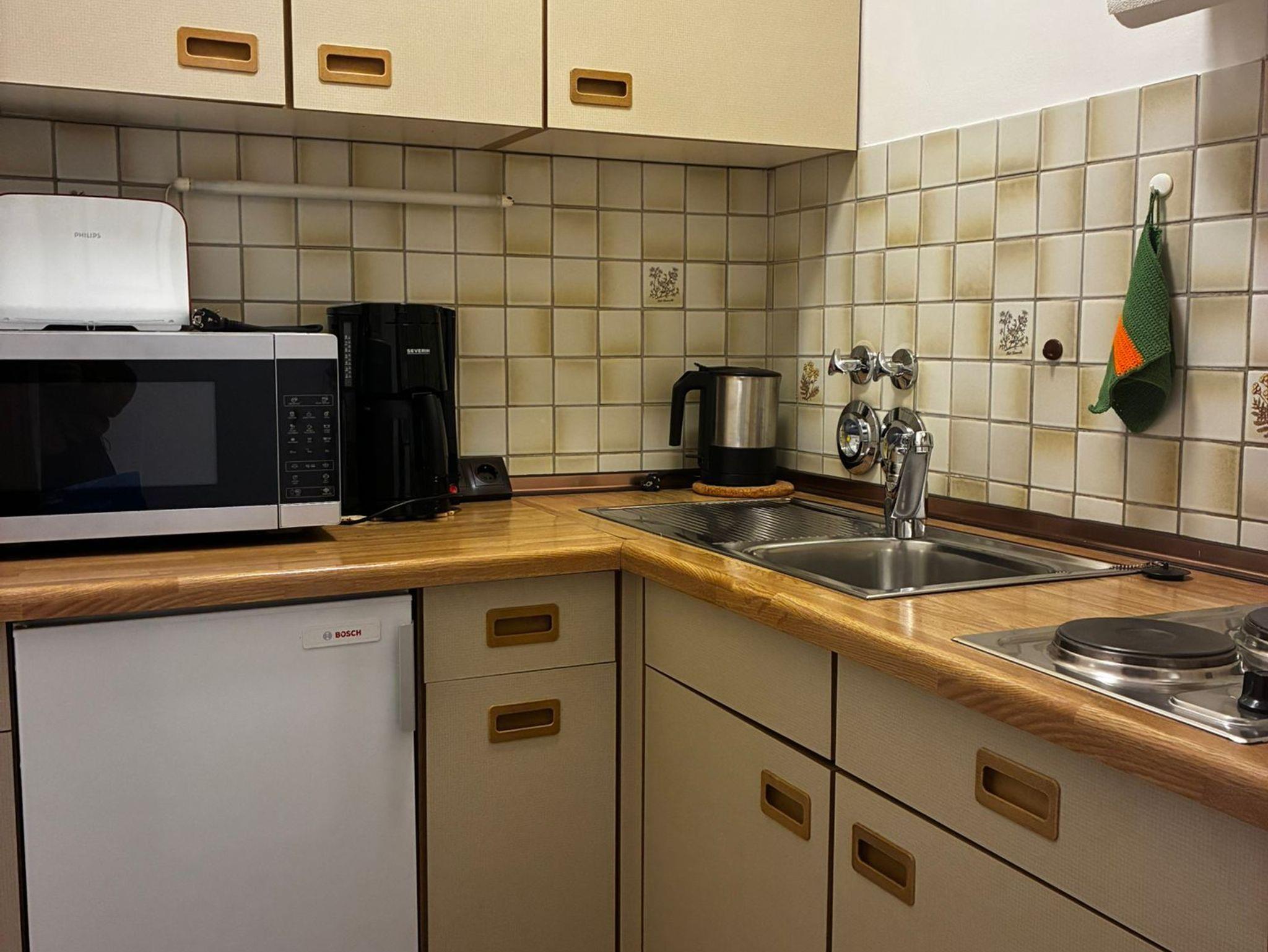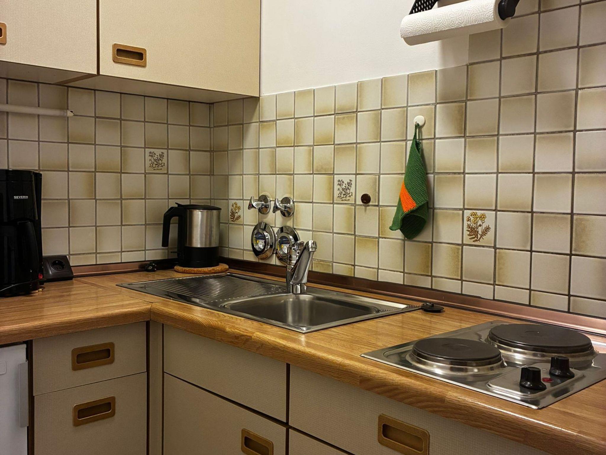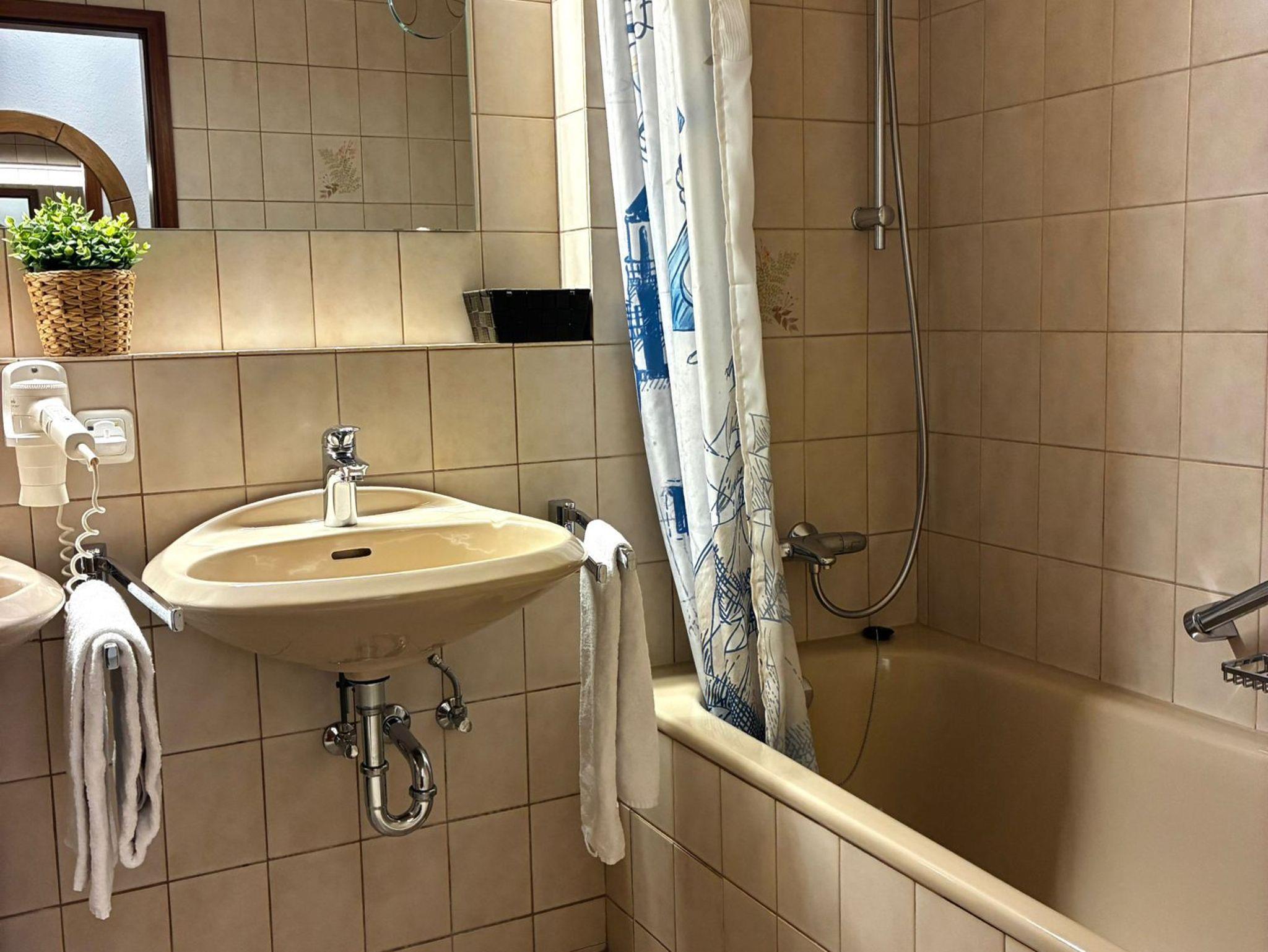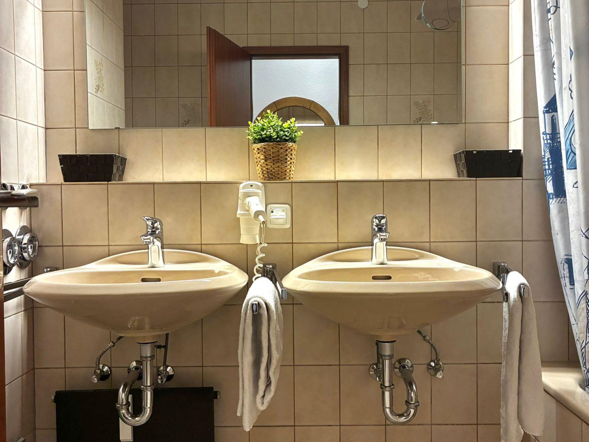 Das Badezimmer ist mit einer Badewanne ausgestattet, die auch als Dusche genutzt werden kann, sowie mit zwei Waschbecken. Kostenloses WLAN, eine kostenfreie Telefonverbindung ins deutsche Festnetz und ein eigener Stellplatz in der Tiefgarage bis zu einer Fahrzeughöhe von 1,95 m ergänzen den Komfort der Wohnung.