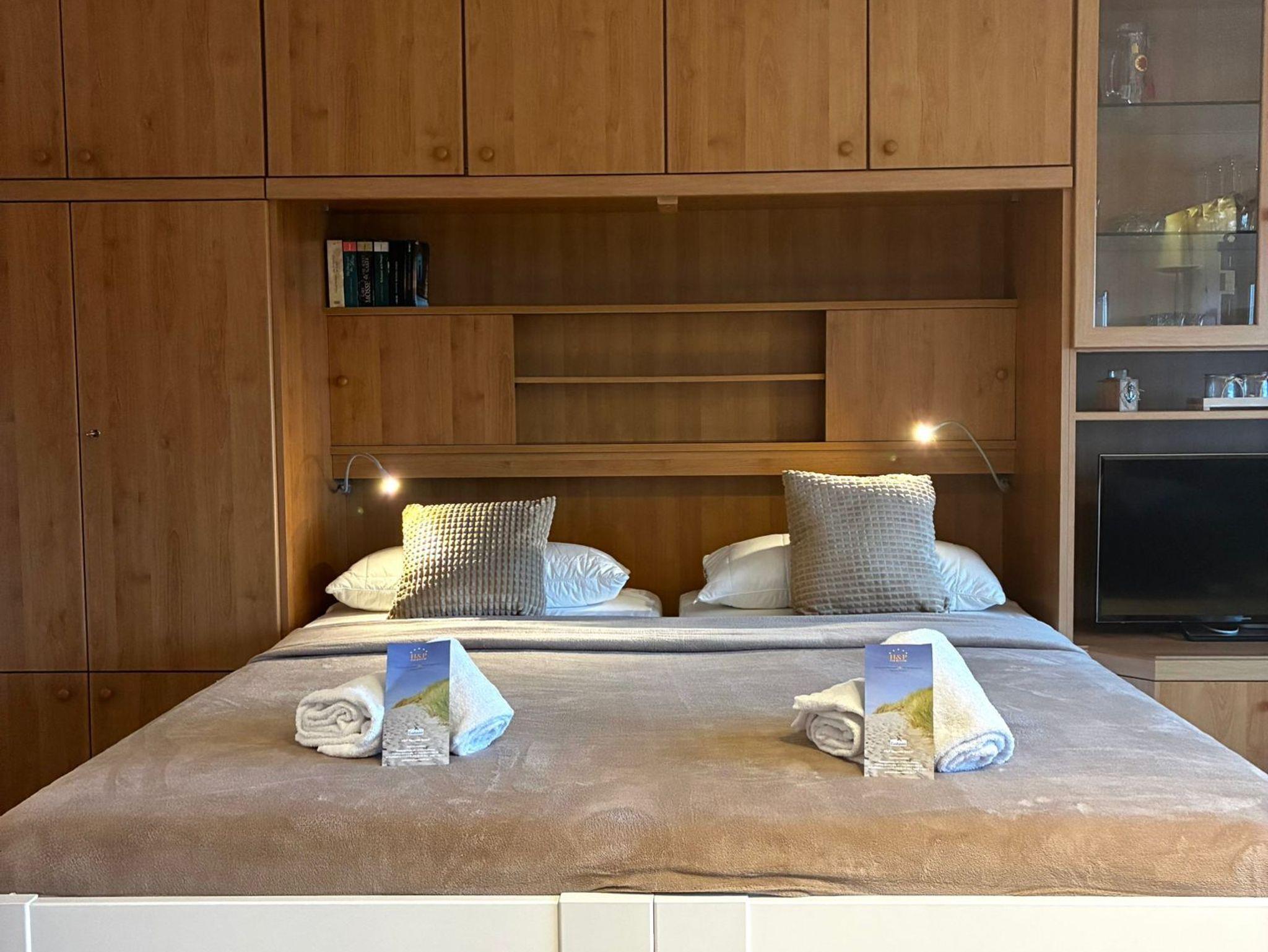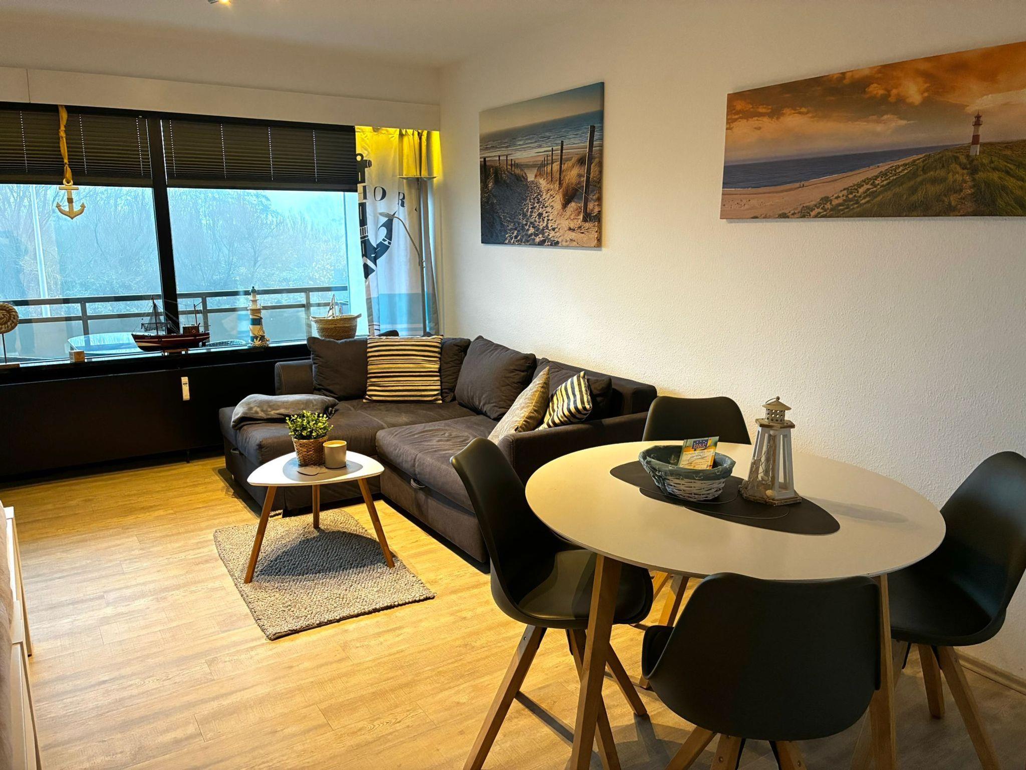 Die 40 m² große Ferienwohnung in der 1. Etage bietet ideale Voraussetzungen für einen erholsamen Aufenthalt zu zweit. Der kombinierte Wohn- und Schlafbereich ist mit einer gemütlichen ausziehbaren Couch, einem Essplatz sowie einem Doppelbett mit elektrischem Lattenrost ausgestattet und schafft eine angenehme Wohnatmosphäre. Die separate, kompakte Küche verfügt über alle gängigen Küchenutensilien und ermöglicht die Zubereitung von Mahlzeiten, die auf dem Balkon mit Blick zum Deich genossen werden können.