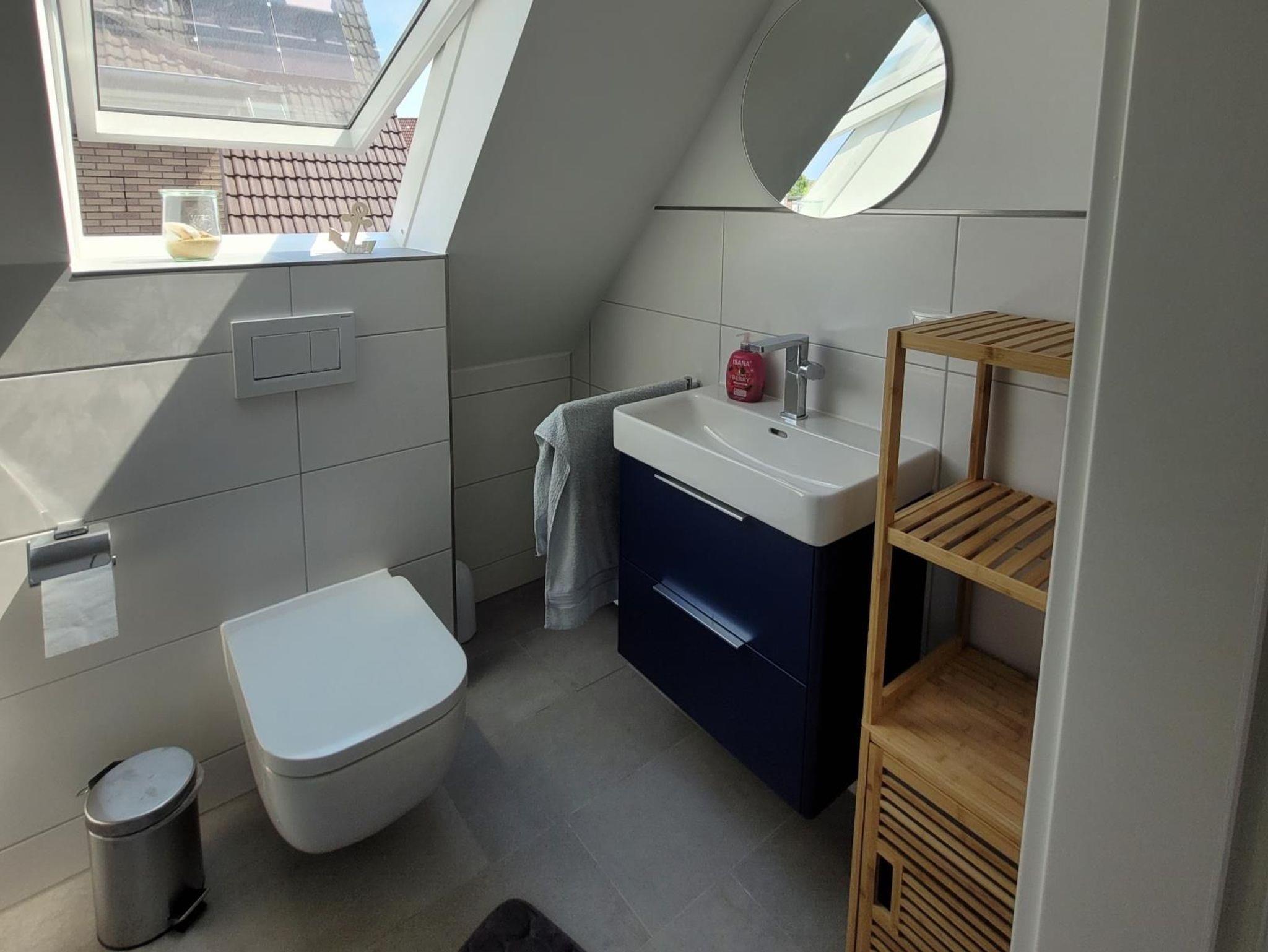 Ebenfalls im Wohnraum finden Sie eine voll ausgestattete Küchenzeile mit Backofen, Kochfeld, Mikrowelle, Geschirrspüler und Kühlschrank mit Gefrierfach. Im daneben liegenden Badezimmer finden Sie eine Dusche und einen Haartrockner.