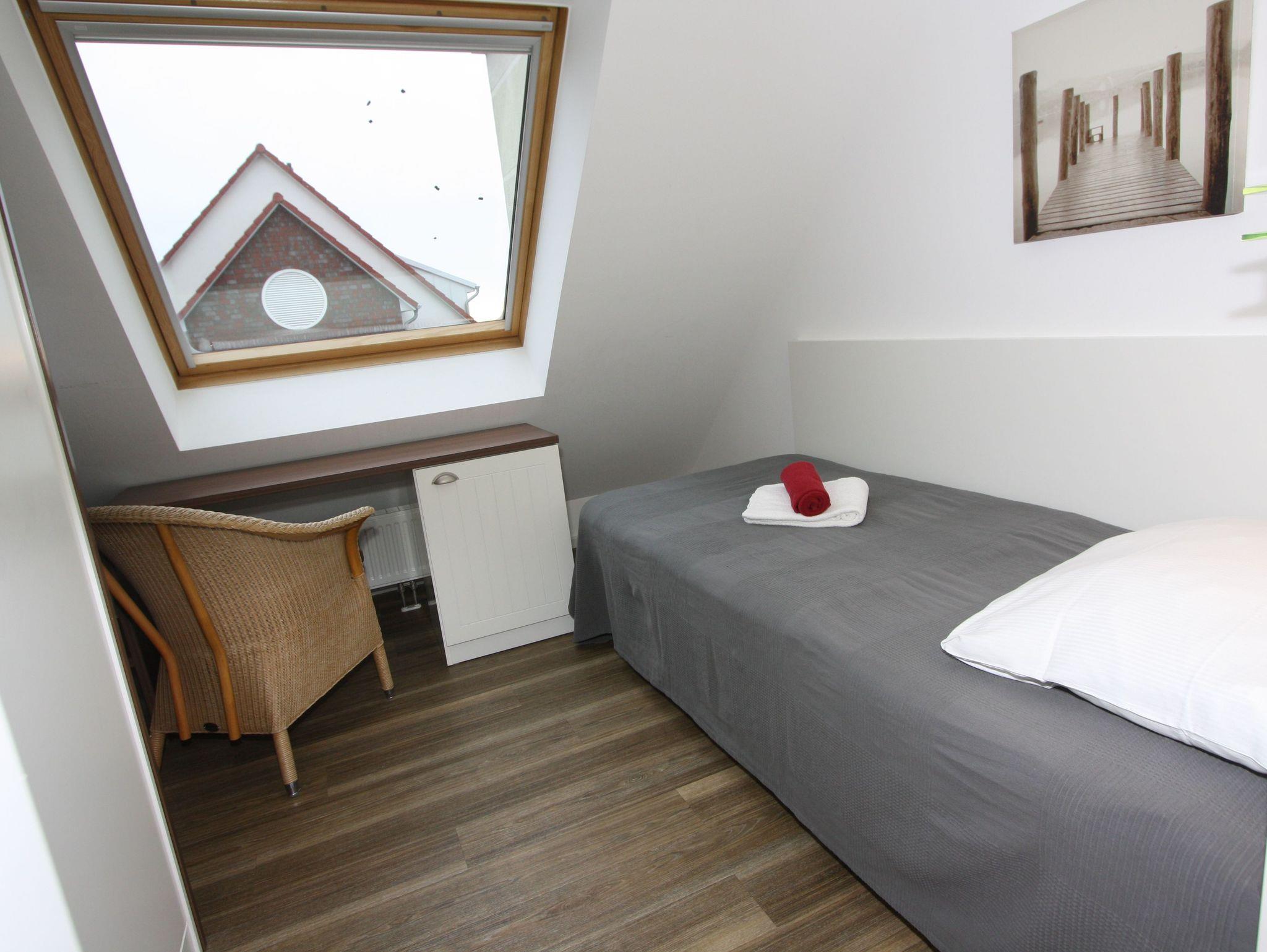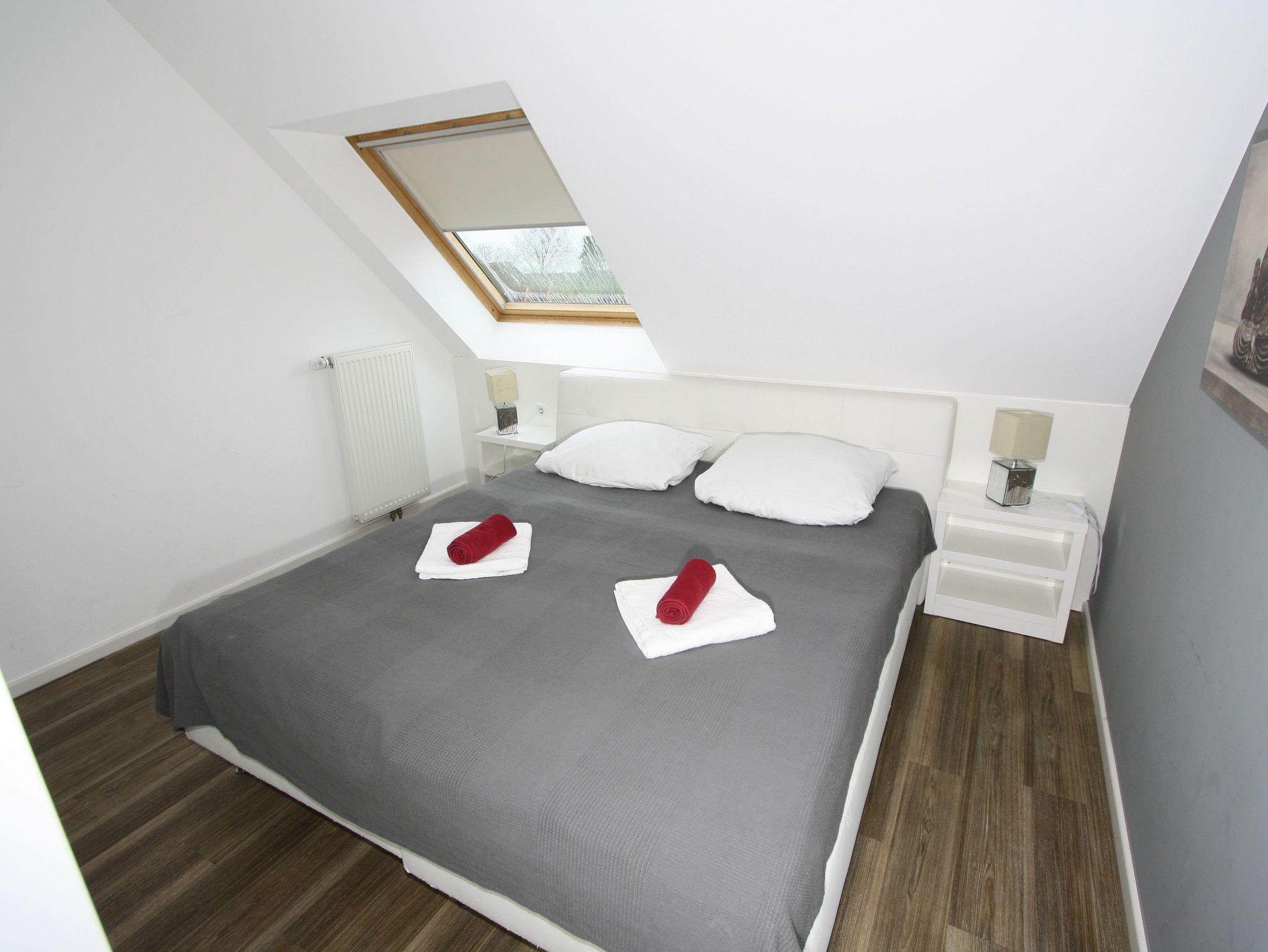 Die Wohnung verfügt über zwei separate Schlafräume auf der Eingangsetage mit jeweils zwei Betten (ein Doppelbett sowie zwei Einzelbetten), eine Schlafcouch im Wohnzimmer bietet zwei weitere Schlafgelegenheiten (Empfehlung: Belegung der Wohnung mit bis zu 4 Personen).