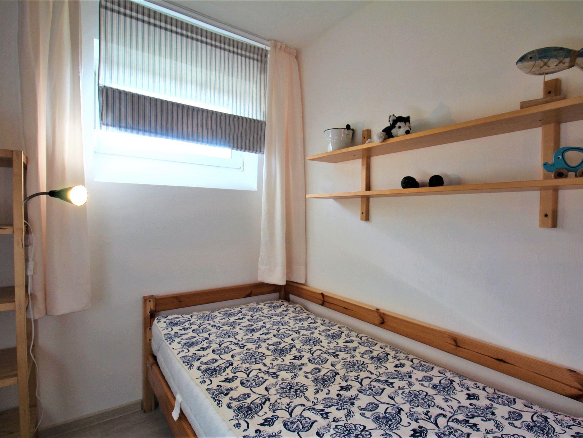 Im Untergeschoss befindet sich ein Schlafzimmer mit Doppelbett und Fernseher und ein Schlafzimmer mit Etagenbett.