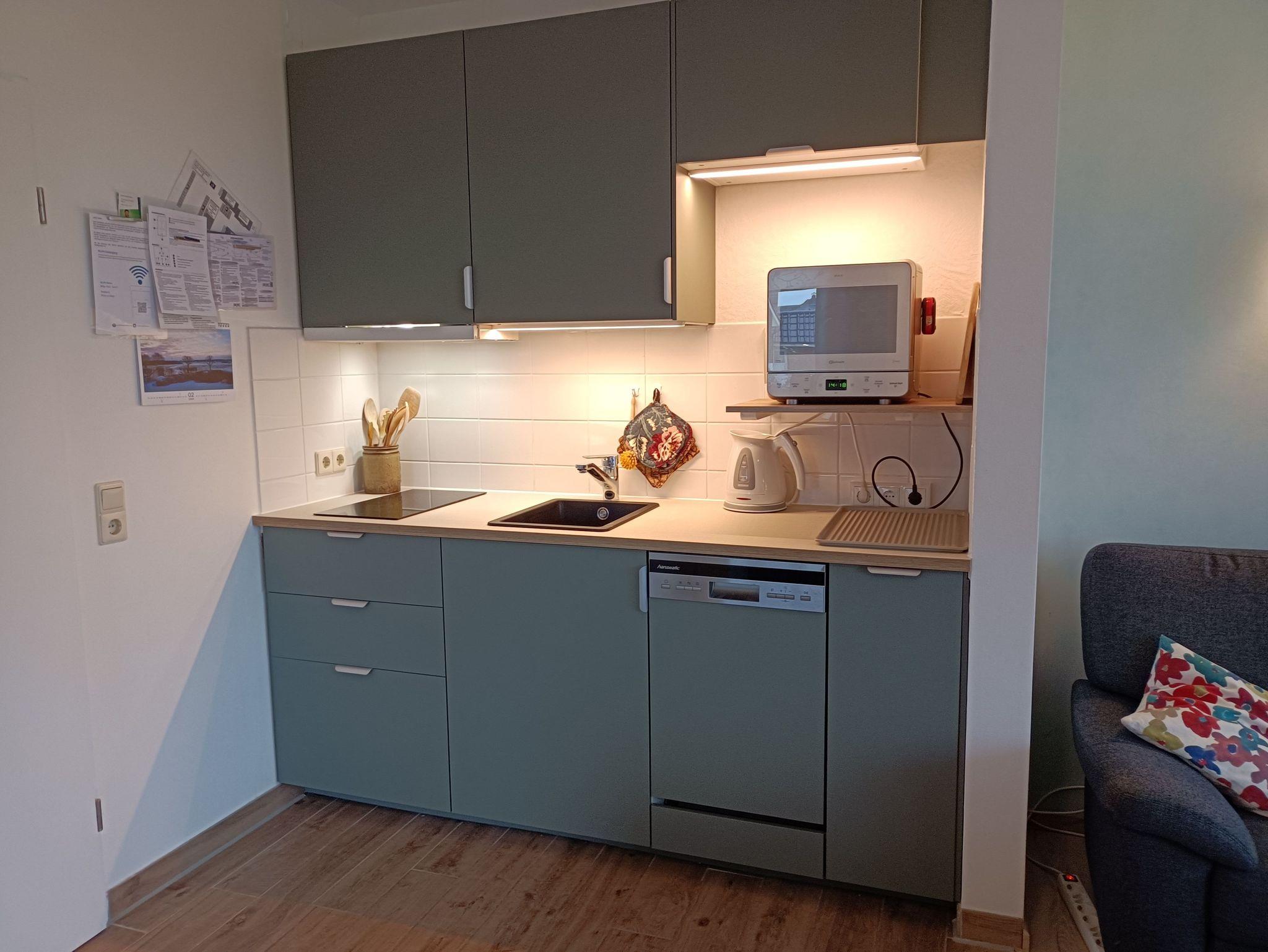 Im Erdgeschoss finden Sie einen großen hellen Wohnraum mit Doppelbettcouch, separatem Essplatz, TV-Flachbildschirm und Internet über WLAN. Ein komplett und reichhaltig ausgestatteter Küchenbereich mit 2-Platten-induktions-Kochfeld, Geschirrspüler, Kühlschrank, Wasserkocher, Toaster, Kaffeemaschine und Mikrowelle mit Grill- und Backfunktionen