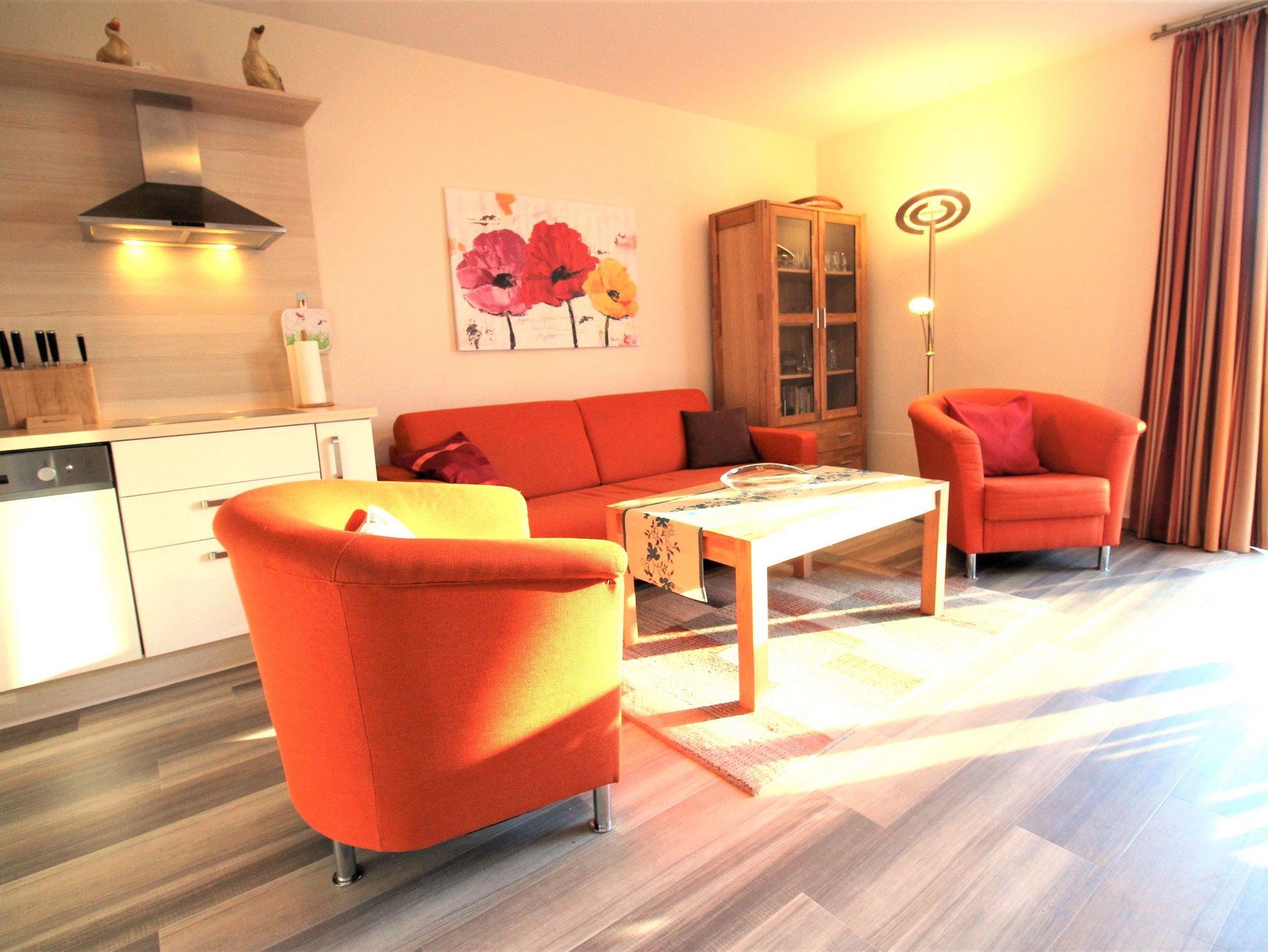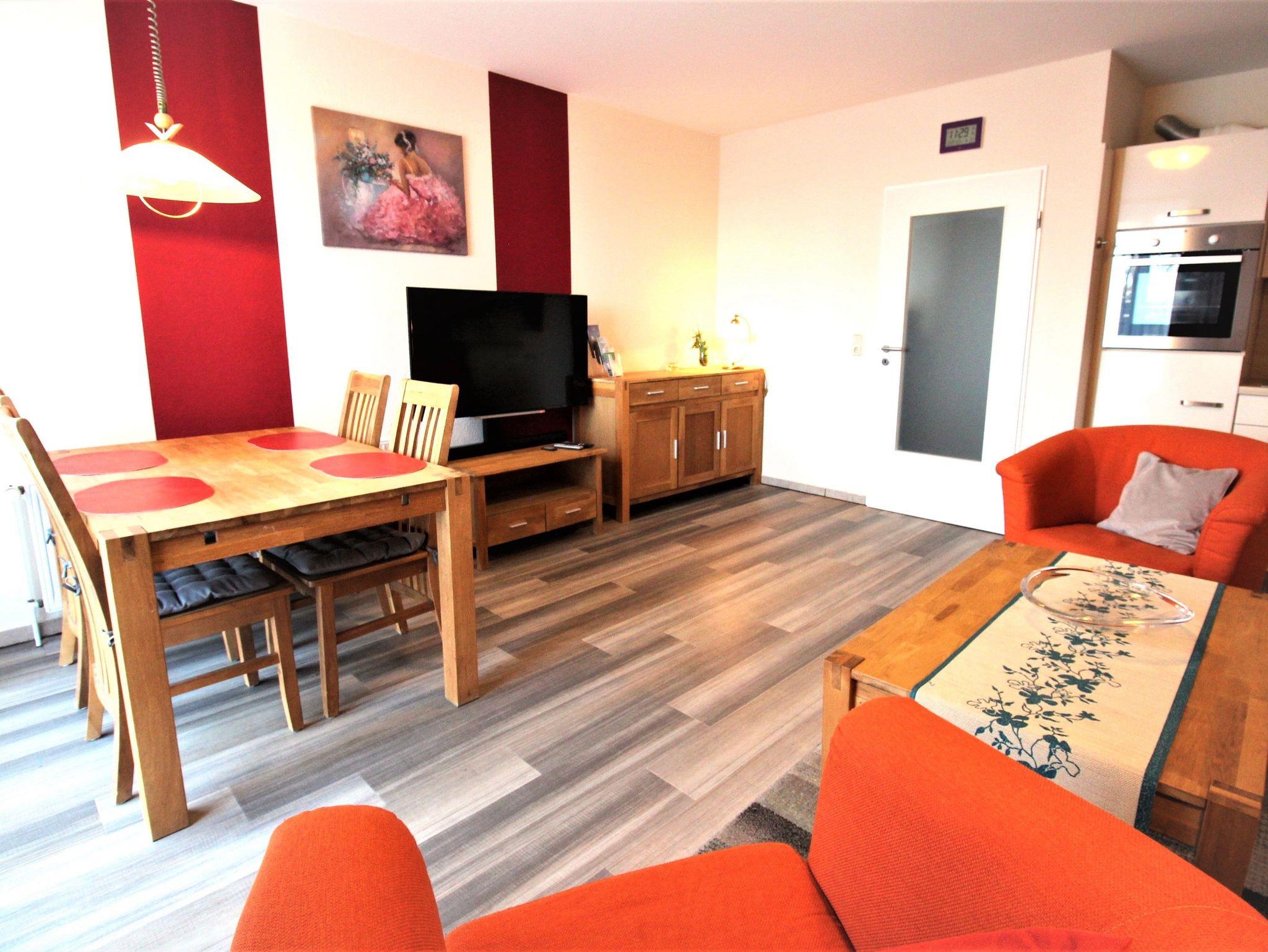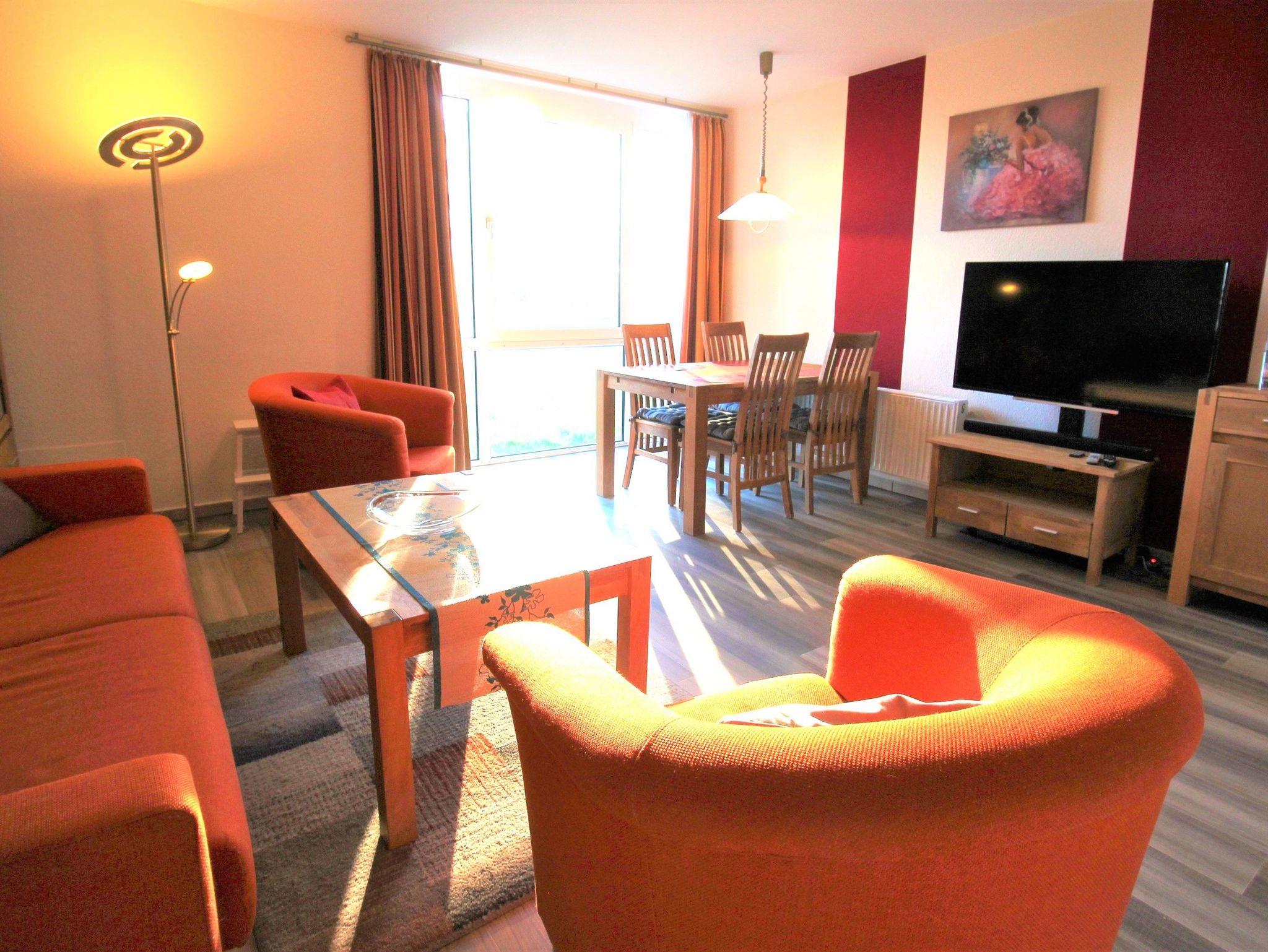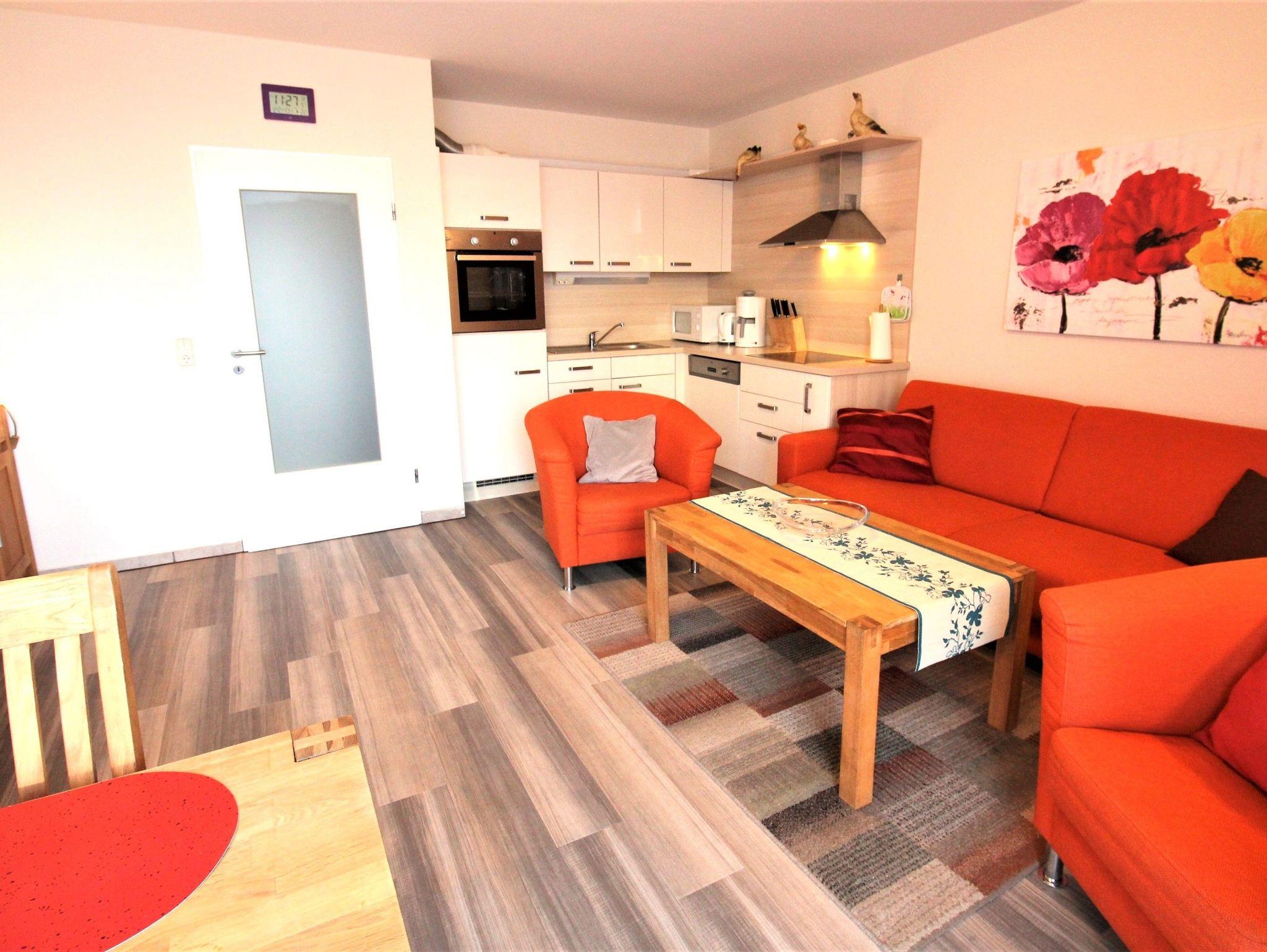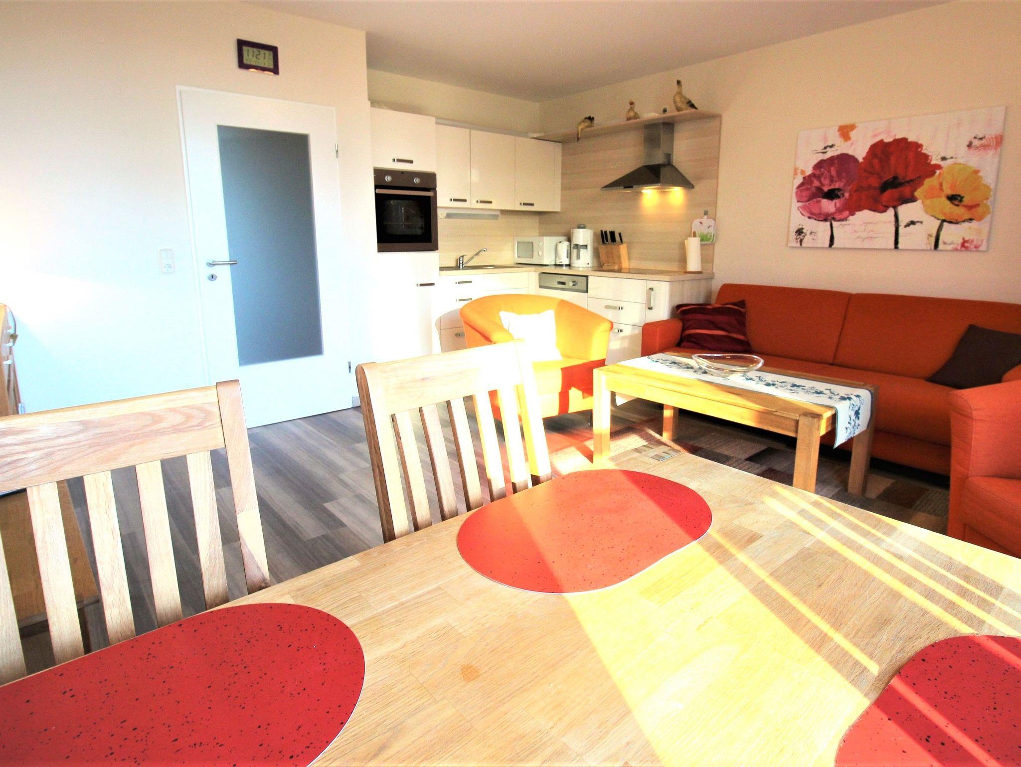 2-Zimmer-Appartement für bis zu 4 Personen auf ca. 46 m². Schlafzimmer mit Doppelbett, Wohn-Schlafraum mit Doppelbettcouch, TV, separatem Essplatz, voll ausgestattetem Küchenbereich, Balkon oder Terrasse, Bad mit Dusche/WC. WLAN und PKW-Stellplatz vorhanden.