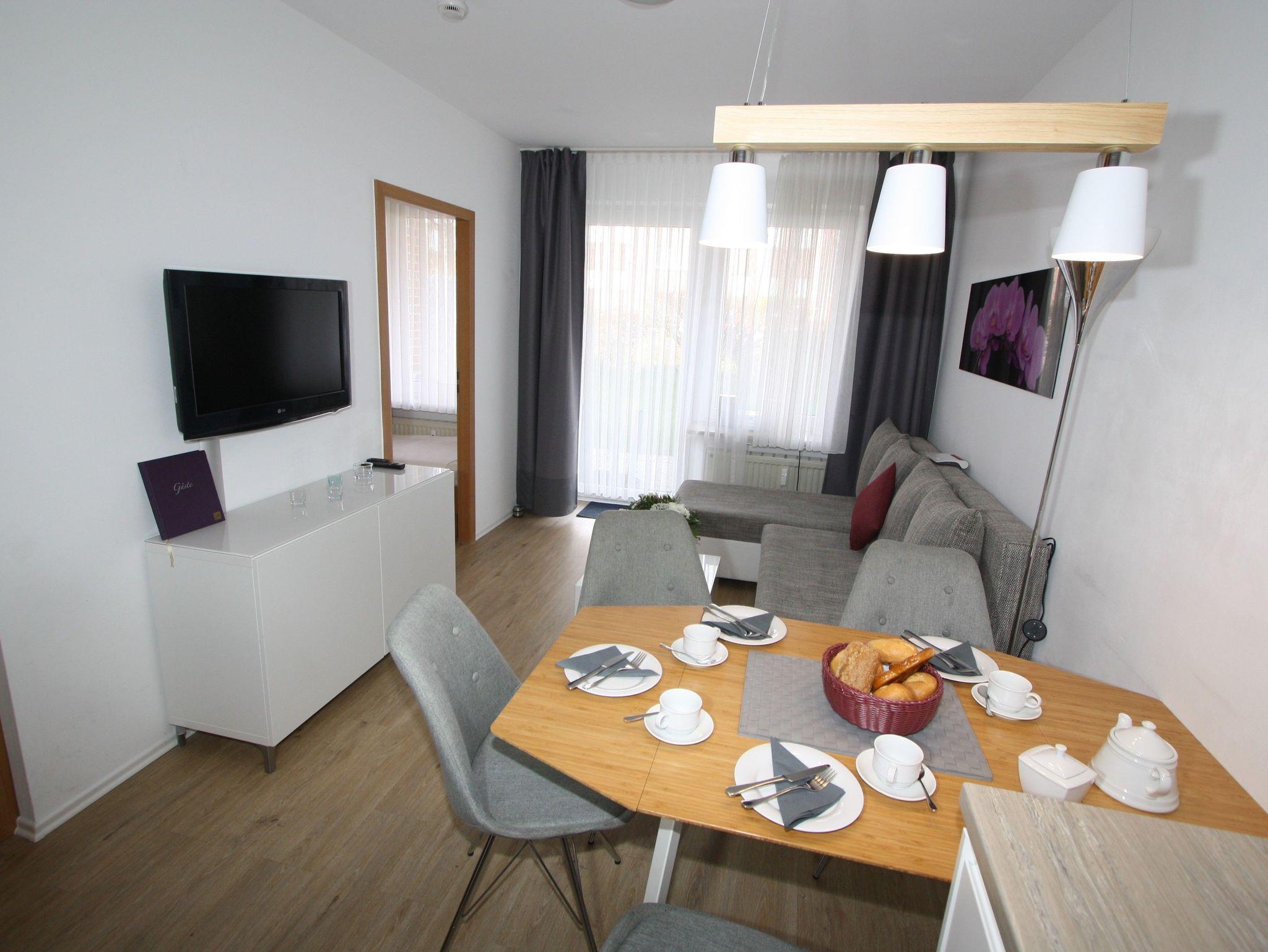 2-Zimmer-Appartement für bis zu 4 Personen auf ca.42 m². Schlafzimmer mit Doppelbett oder zwei Einzelbetten, Wohn-Schlafraum mit Doppelbettcouch, TV, separatem Essplatz, voll ausgestattetem Küchenbereich, Balkon oder Terrasse, Bad mit Dusche/WC. teilweise WLAN und PKW-Stellplatz vorhanden.