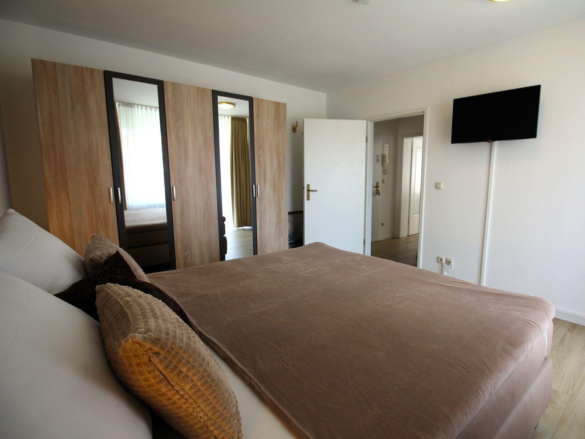- ein Schlafzimmer mit Boxspingbett (180 x 200 cm), fünftürigem Schlafzimmerschrank sowie Verdunkelungsvorhängen;