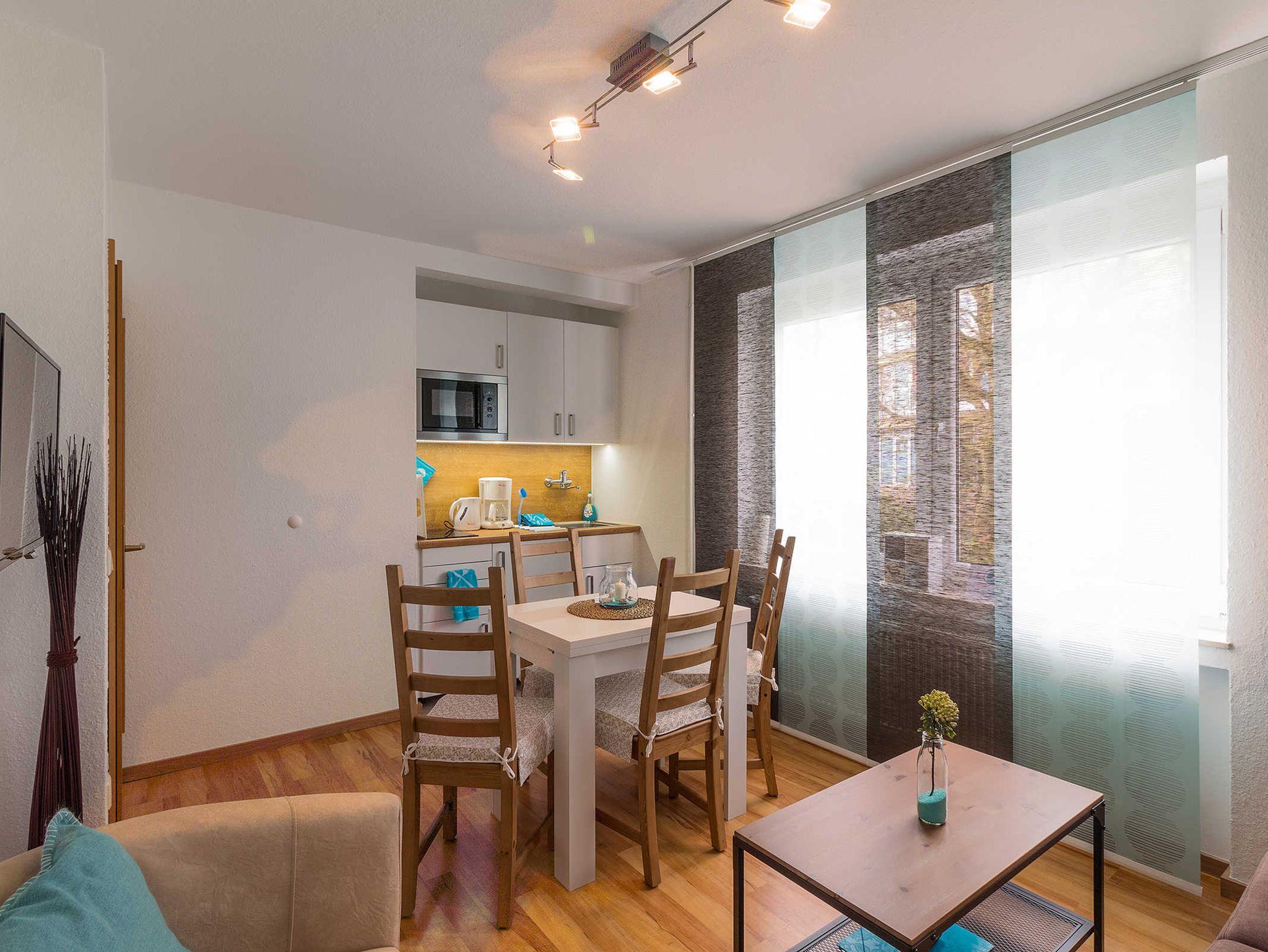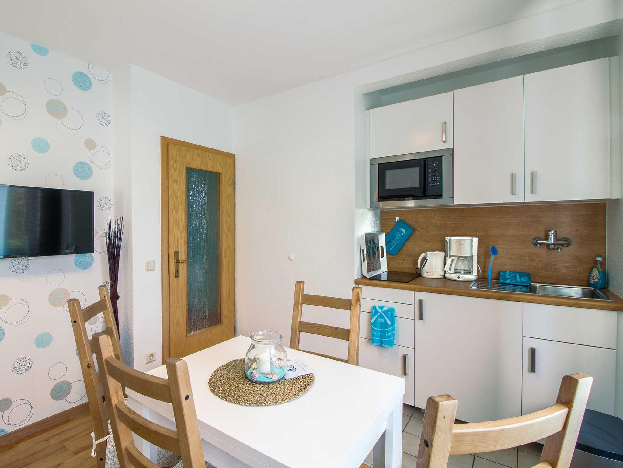 Die im Wohnraum integrierte Küchenzeile ist mit einem großen Kühlschrank mit Gefrierfach sowie einer Mikrowelle und einem Induktionskochfeld ausgestattet. Außerdem finden Sie in der Küche alles, was für eine unbeschwerte Zeit nötig ist. Es erwartet Sie ein modernes Bad.