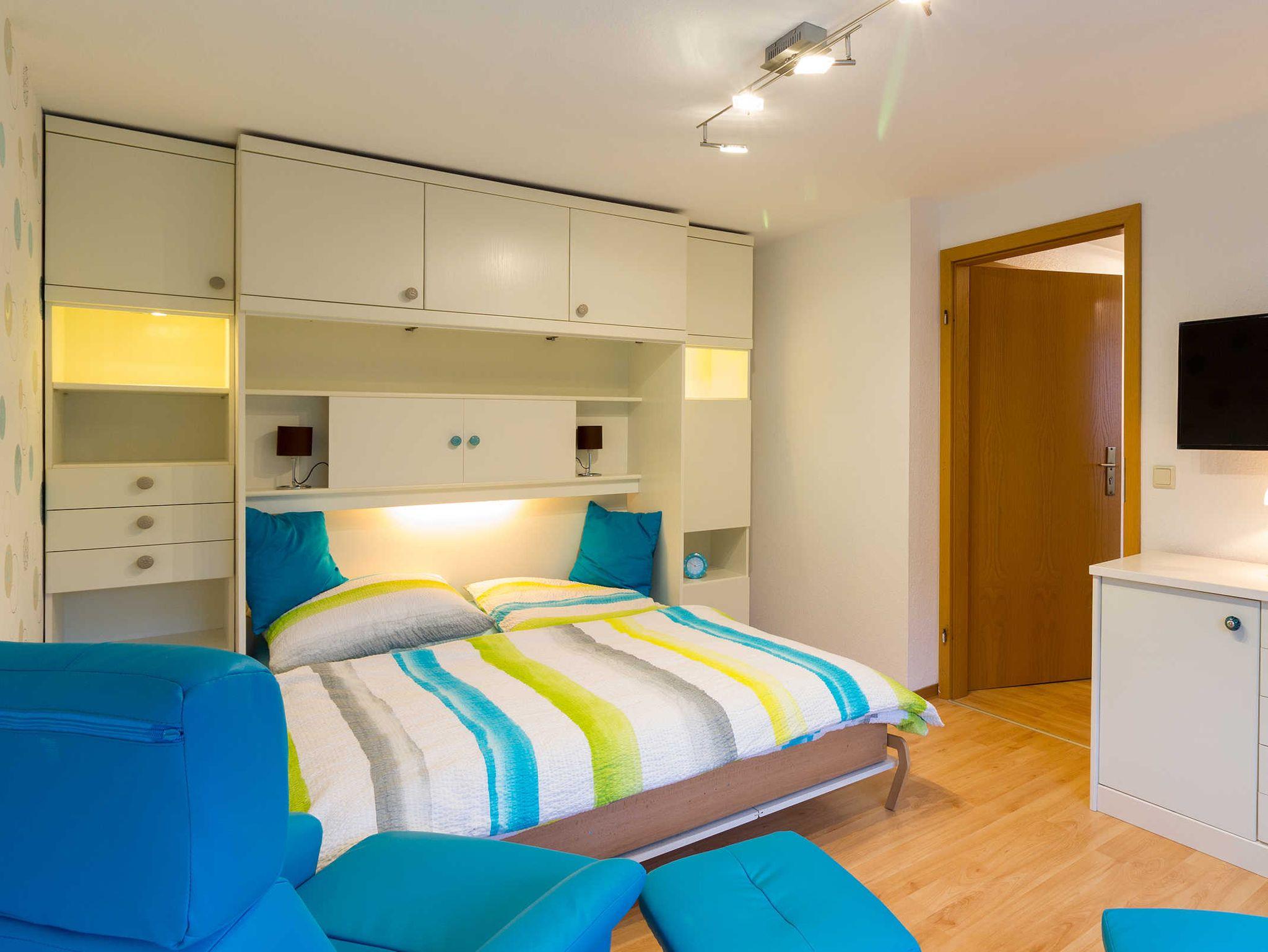 Der Wohn - Schlafraum verfügt über ein praktisches Doppelklappbett, in dem Kuscheln und Träumen nicht schwer fällt.