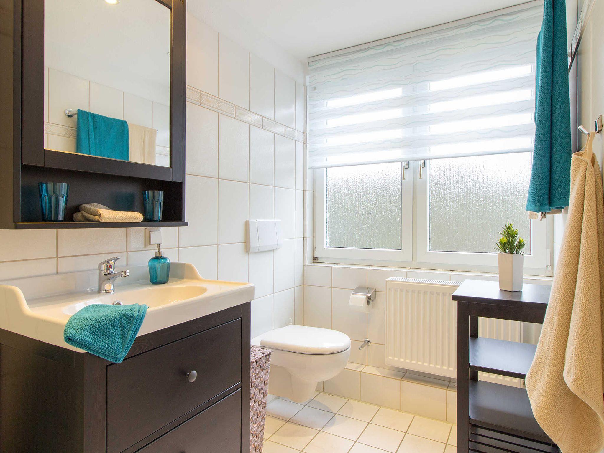 Das modern eingerichtete Badezimmer bringt Schwung für den Tag und angenehme Ruhe für die Abendtoilette.