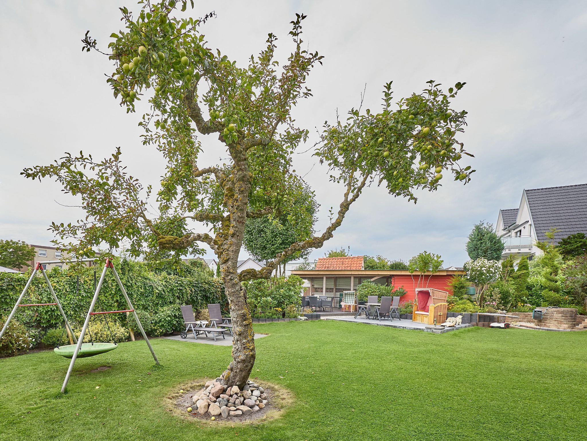 • Großer Gemeinschaftsgarten mit Terrasse, Gartenmöbeln und Strandkörben