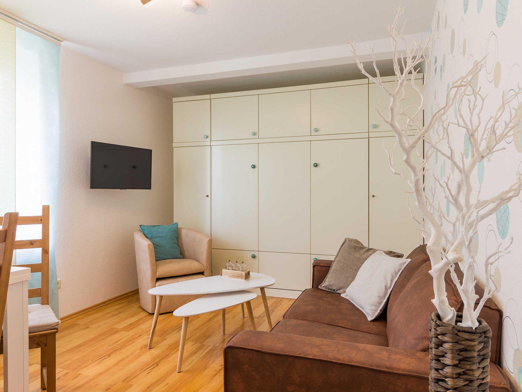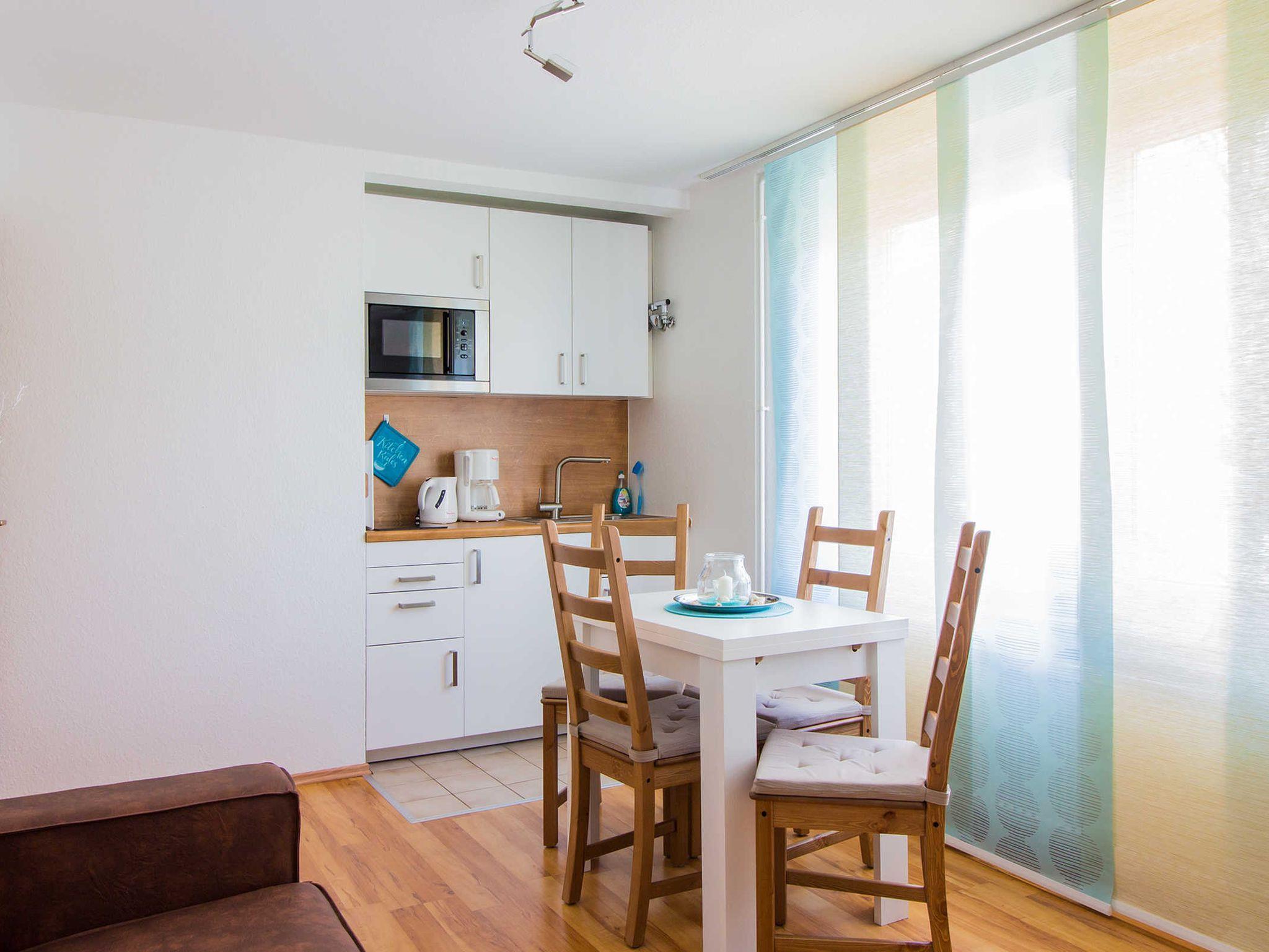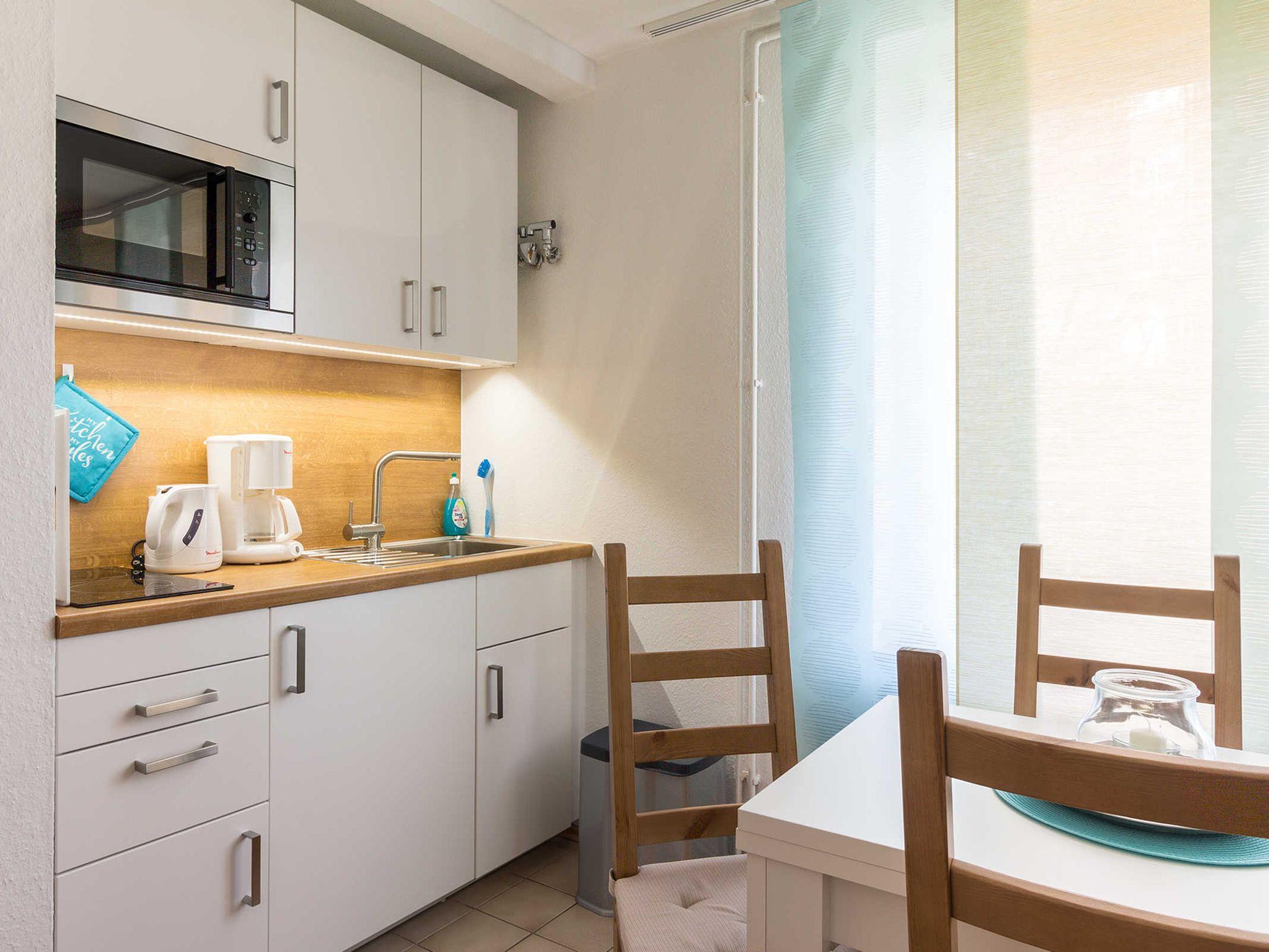 Ein Flachbildschirm mit Kabel TV sowie kostenloses WLAN mit schneller Internetanbindung steht Ihnen zur Verfügung. Die im Wohn - Schlafraum integrierte Küchenzeile ist mit einem großen Kühlschrank mit Gefrierfach sowie einer Mikrowelle und einem Induktionskochfeld ausgestattet. Außerdem finden Sie in der Küche alles, was für eine unbeschwerte Zeit nötig ist.