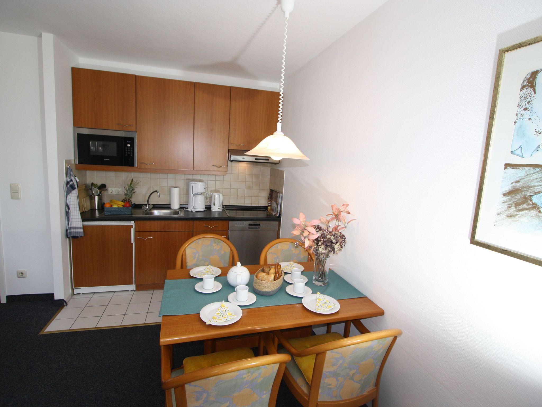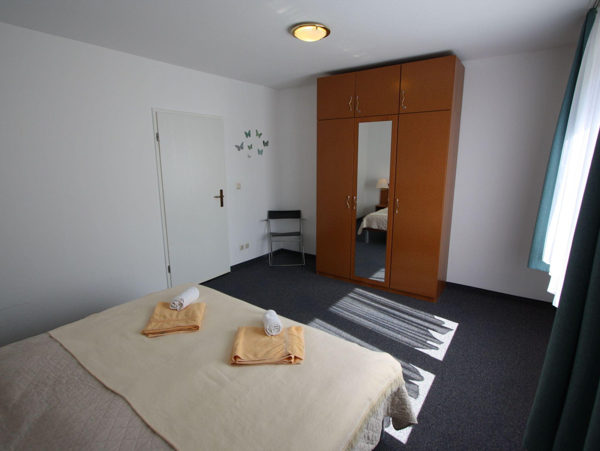 Sie wohnen in einem 2-Zimmer-Appartement für bis zu 4 Personen auf ca. 51 m² Wohnfläche im Erdgeschoss. Ein Schlafzimmer mit Doppelbett, Wohn-/Schlafraum mit bequemer Doppelbettcouch, separater Essplatz, voll ausgestatteter Küchenbereich, Dusche/WC, Terrasse und SAT-TV, kostenloses WLAN. PKW-Stellplatz in der Tiefgarage.