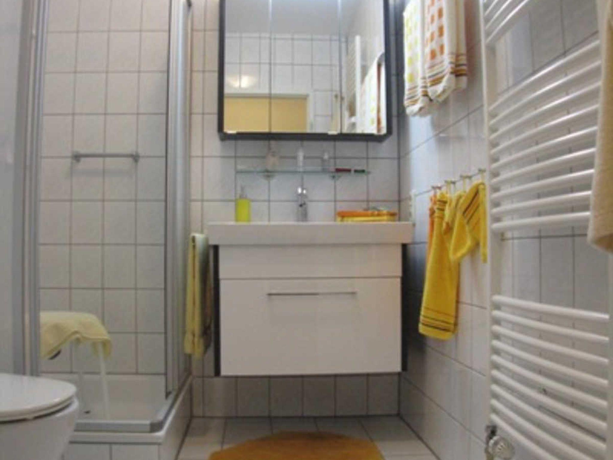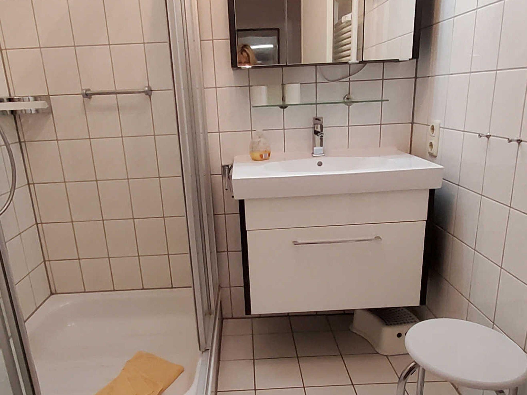 Geräumiges Badezimmer: Dusche, Spiegelschrank, Hocker, Föhn, Handtuchheizung und ausreichend Ablagefächer.