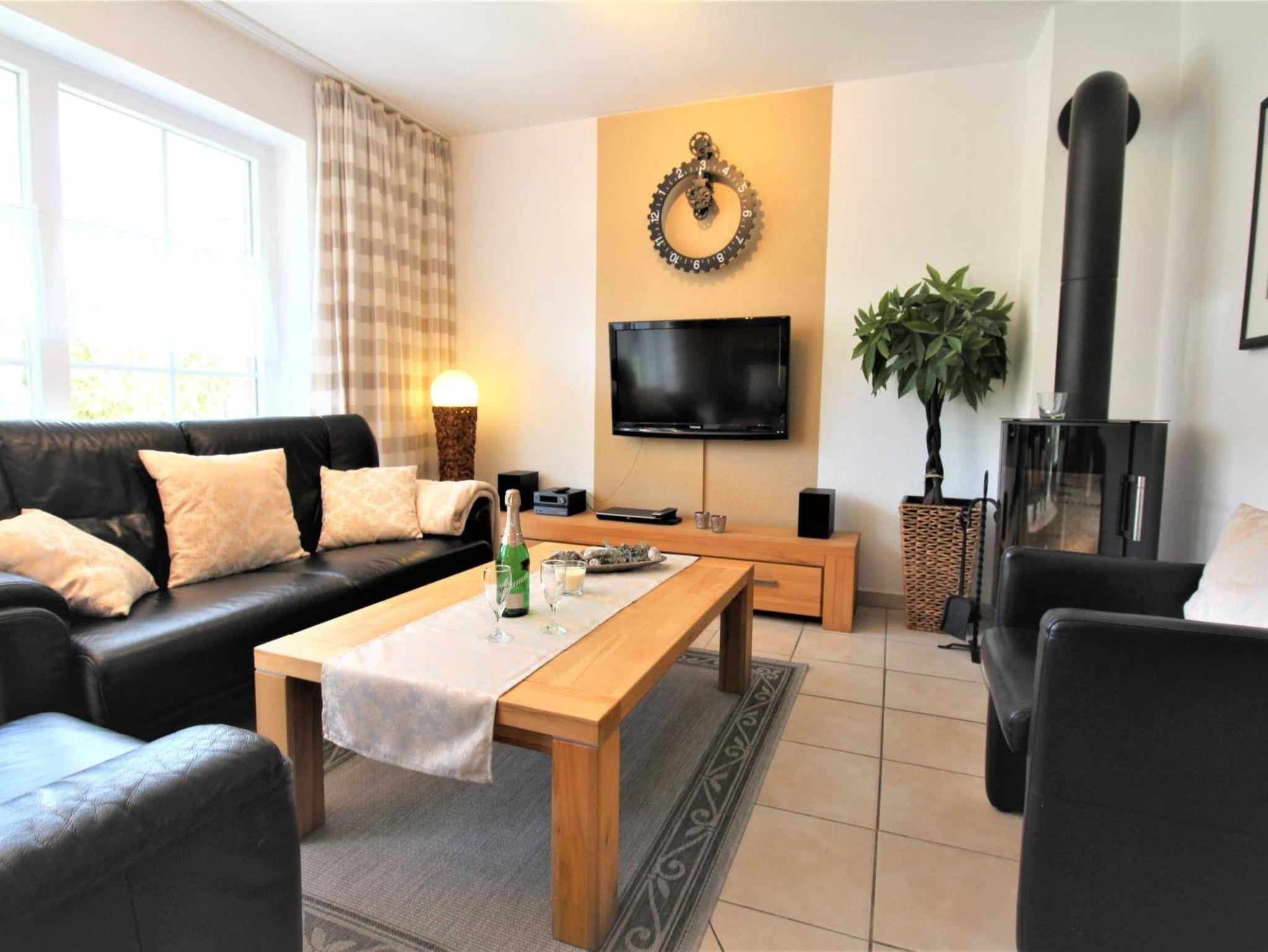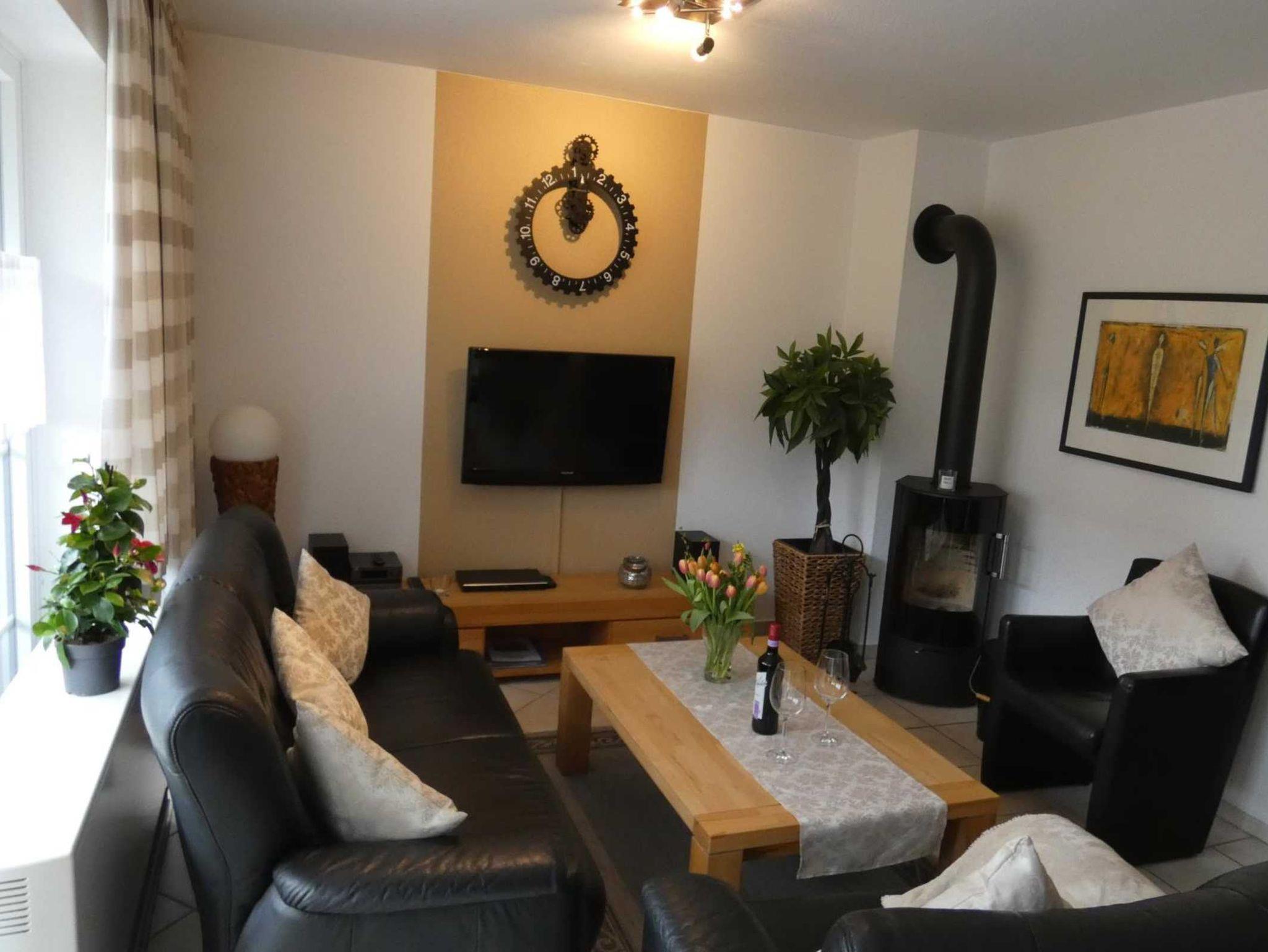 Ein Kaminofen schmückt den ausgesprochen apart und gemütlich eingerichteten Wohnraum mit Flachbildschirm, SAT-TV (Videotext), DAB+ Musikanlage mit Bluetooth und USB-Anschluss, Blu-ray-Player, DVD-Player und bequemer schwarzer Leder-Garnitur.