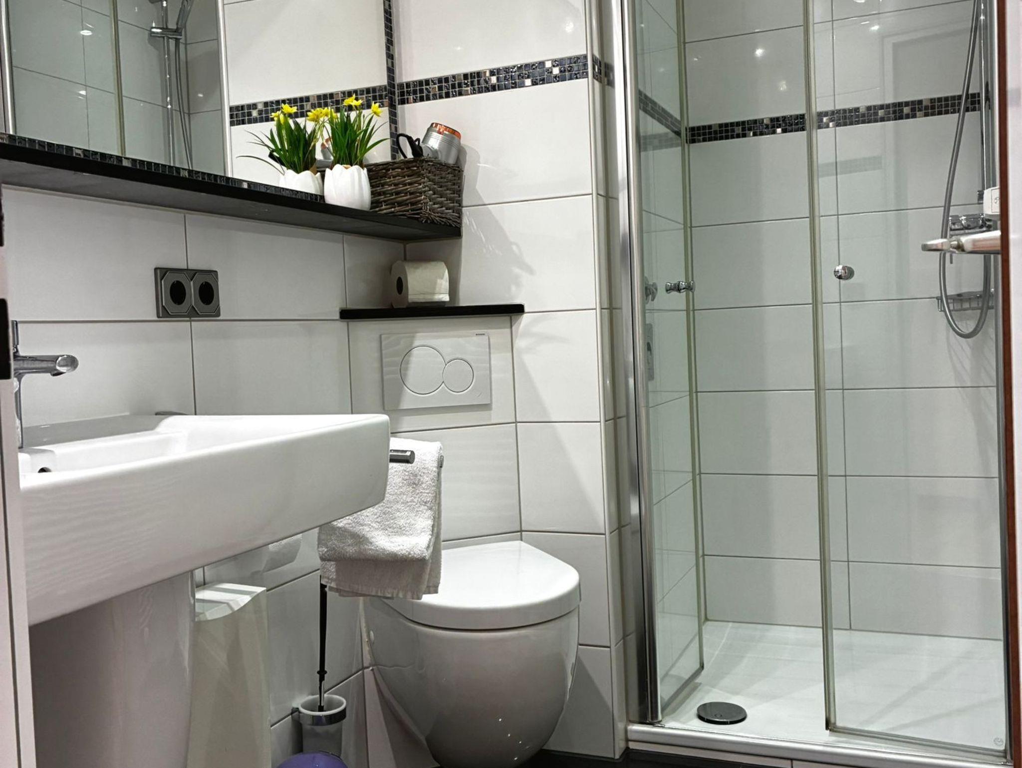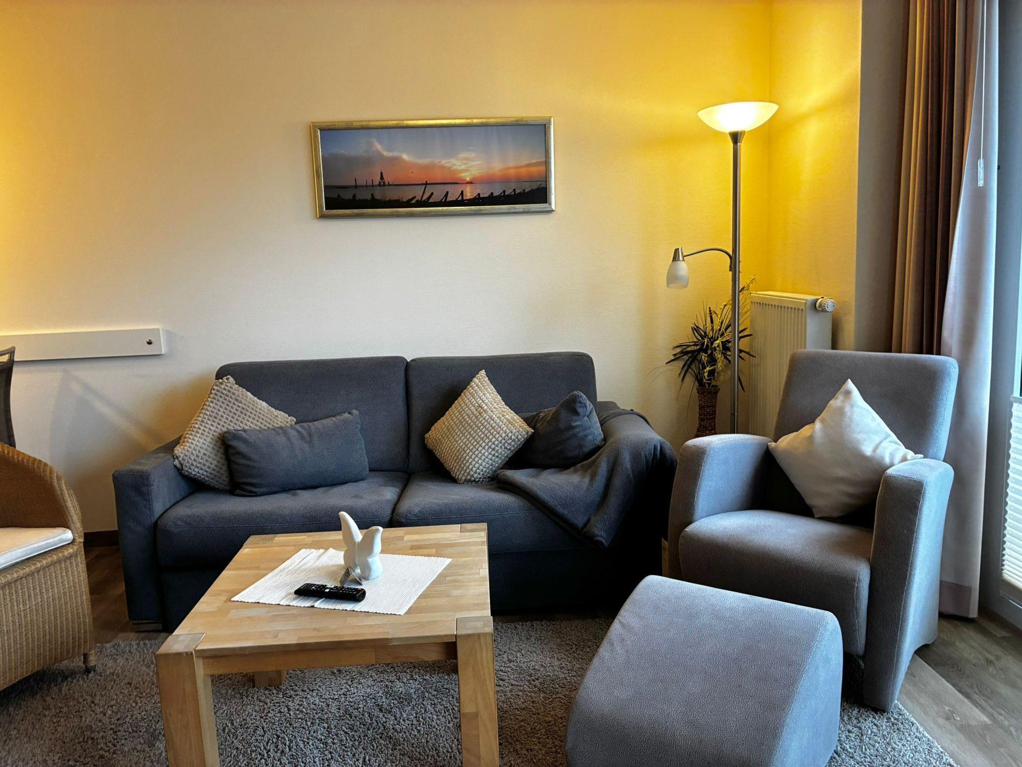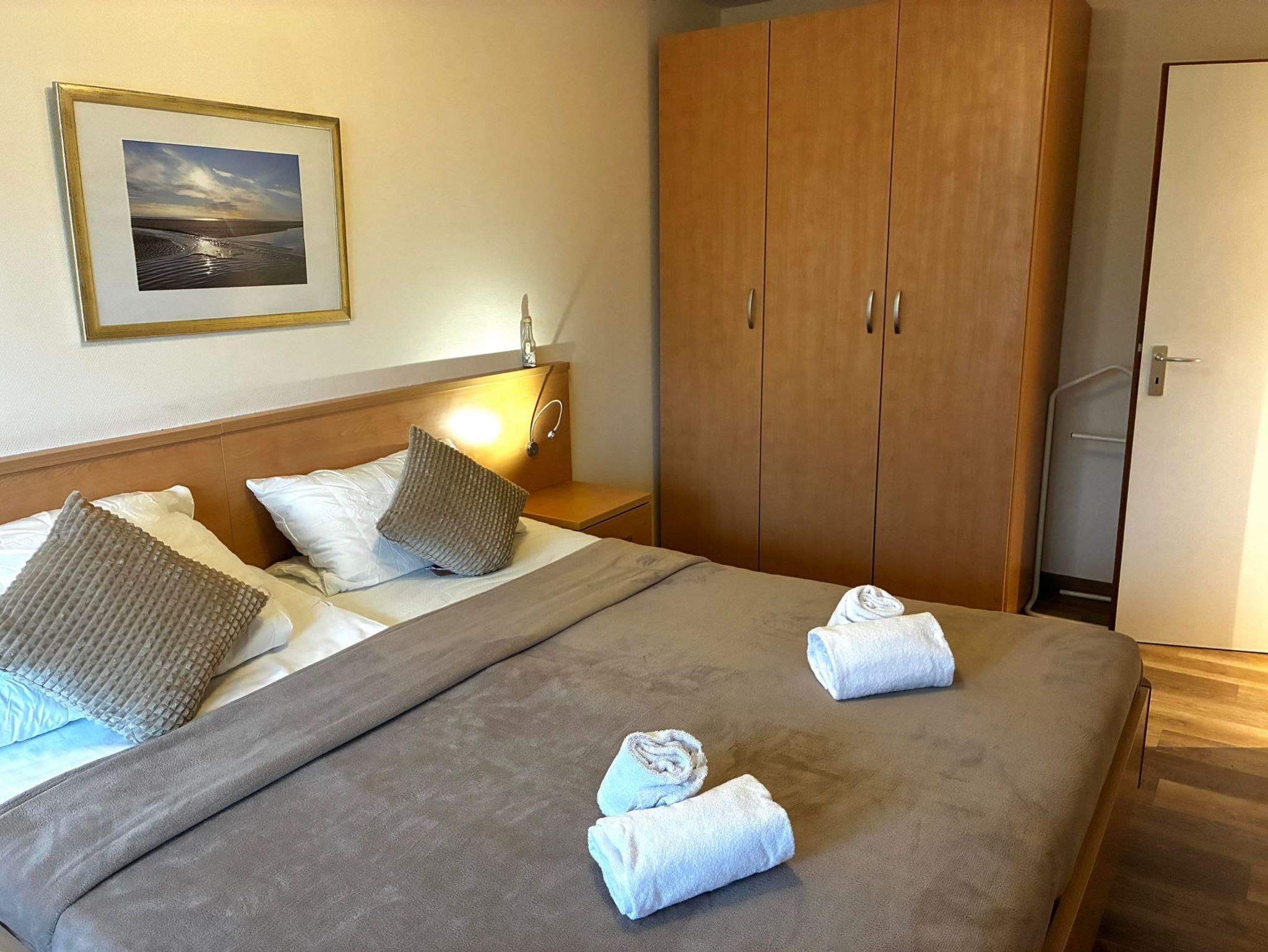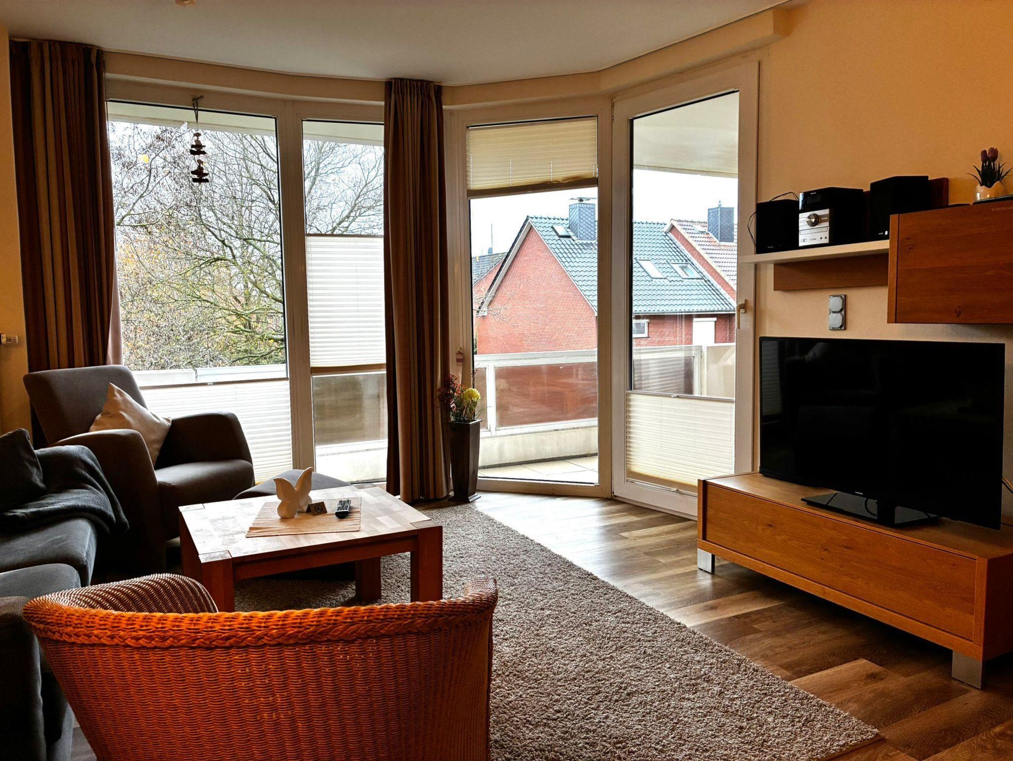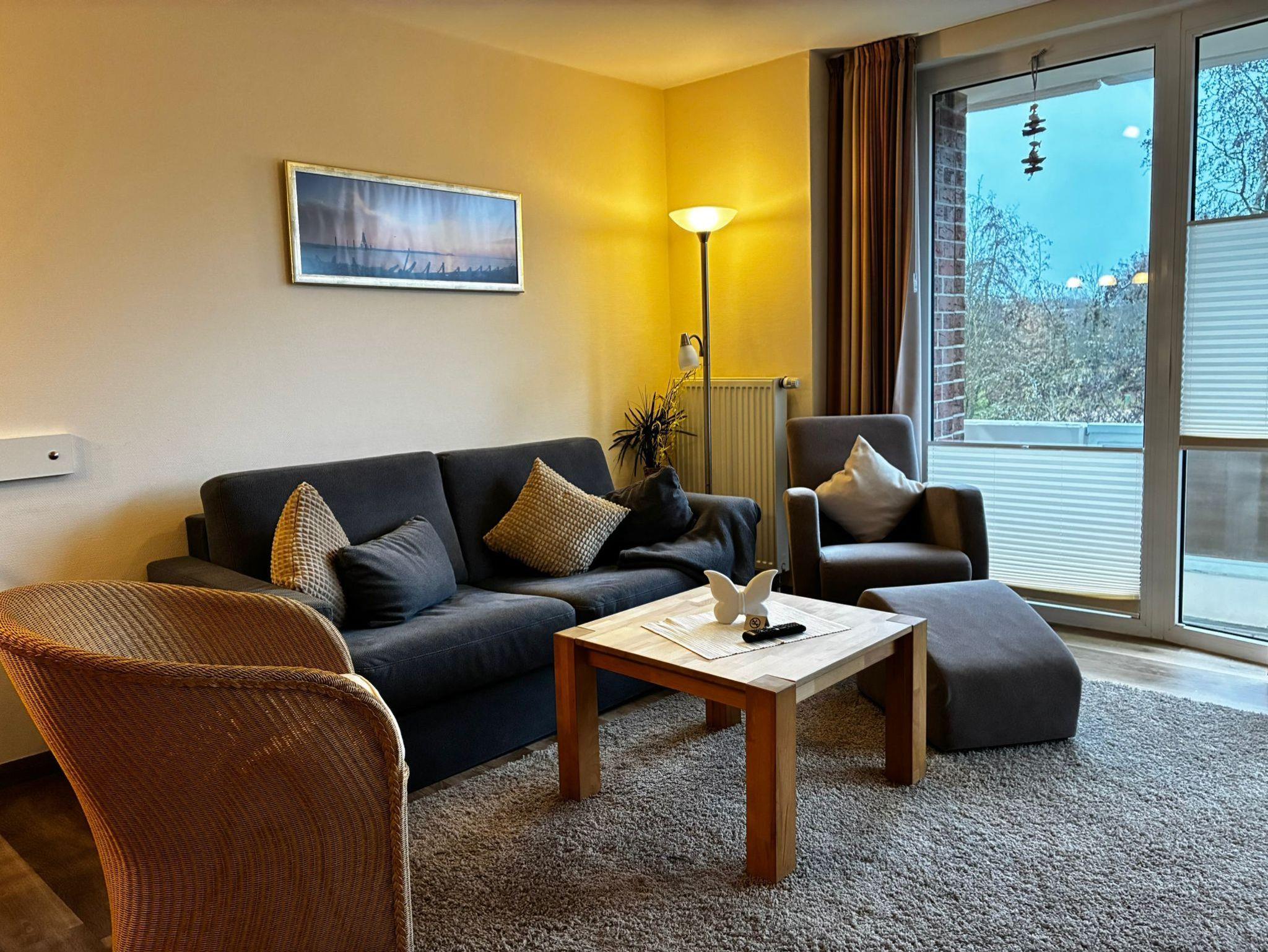 Sie wohnen in einem 2-Zimmer-Appartement für bis zu 4 Personen auf ca. 50 m² im 1. Obergeschoss. Die Ferienwohnung verfügt über ein Schlafzimmer mit Doppelbett (Matratzenstärke 2 und 3) und TV , ein Wohn-/Schlafraum mit Doppelbettcouch, separaten Essplatz und voll ausgestatteten Küchenbereich mit Geschirrspüler und Mikrowelle, Dusche/WC, Balkon, Kabel-LCD-TV, WLAN.