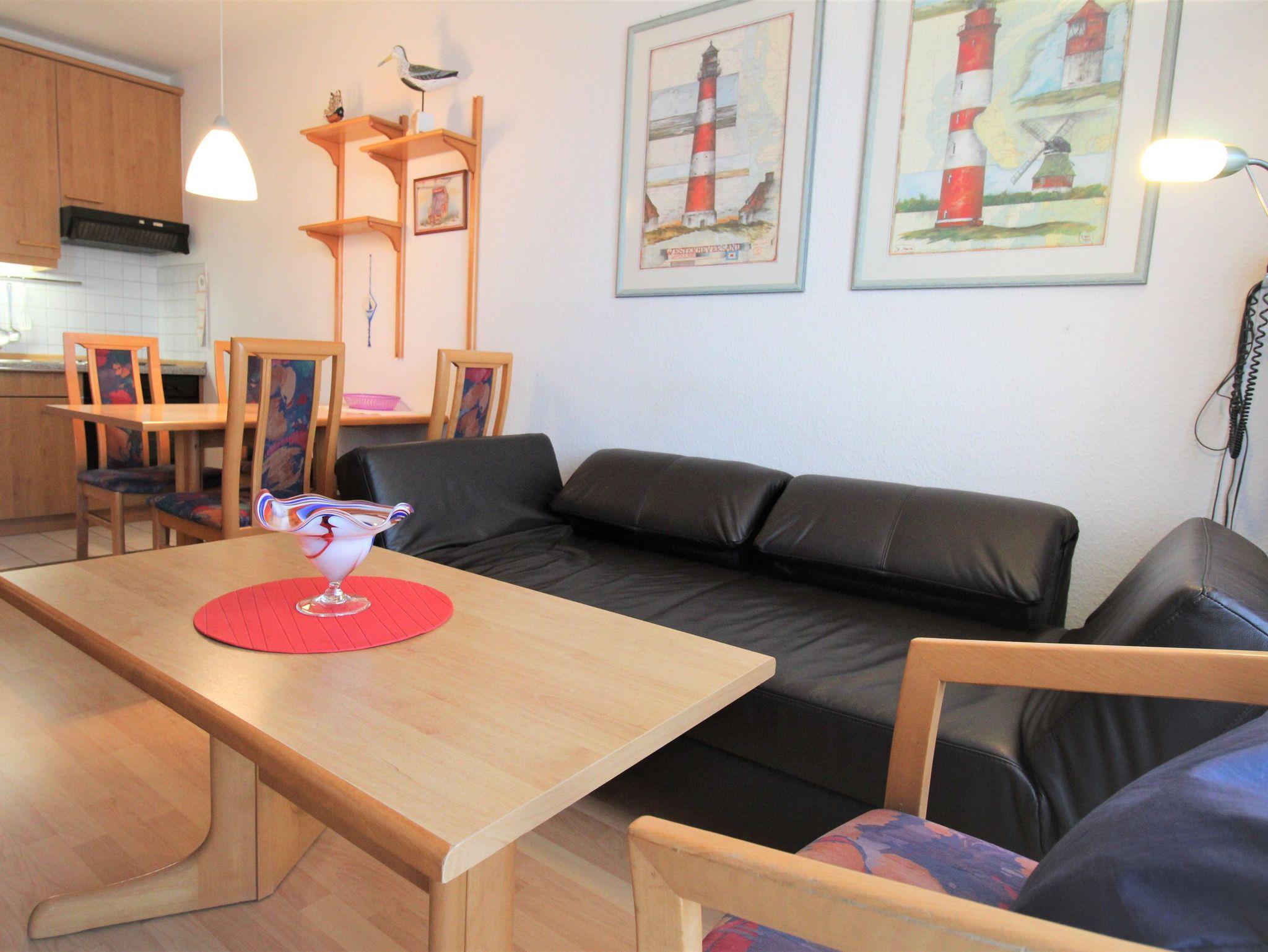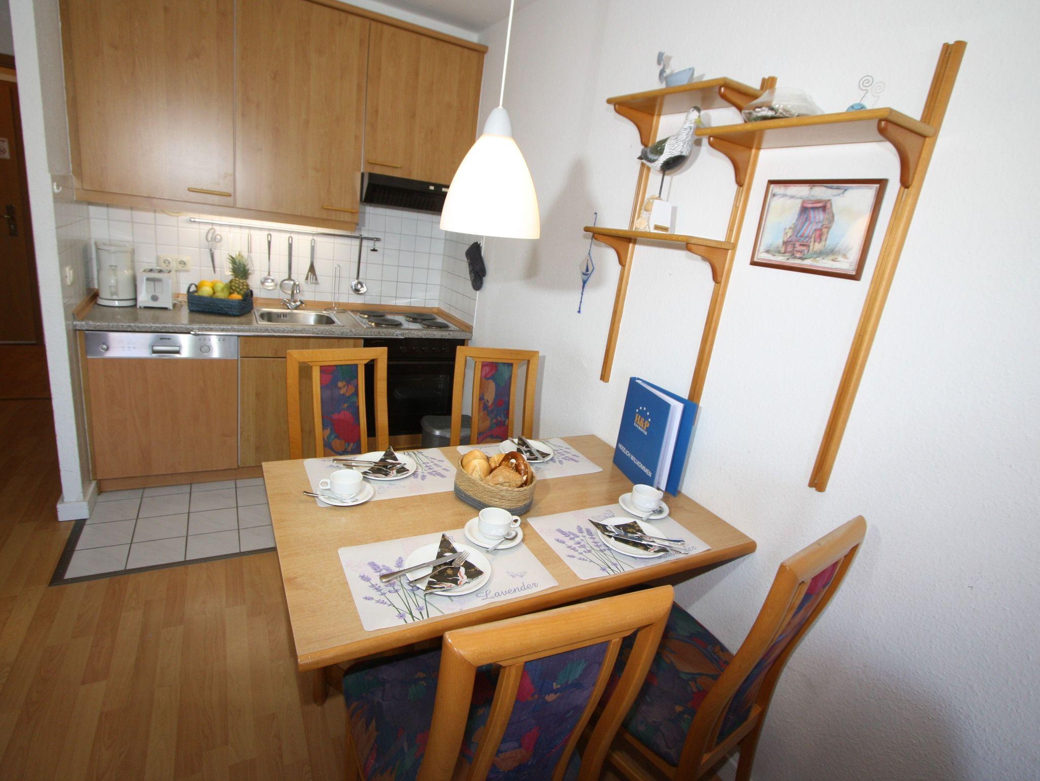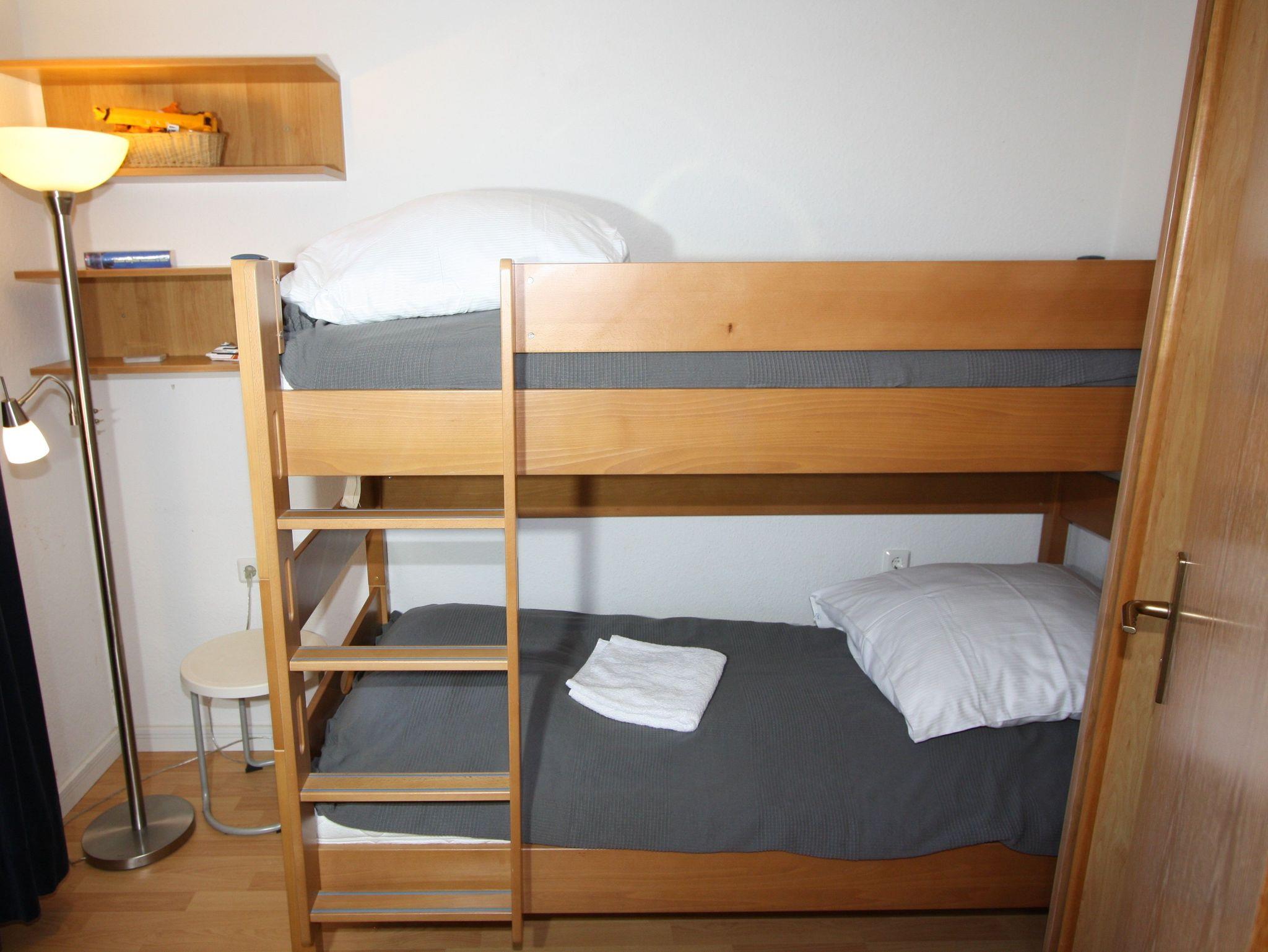Sie wohnen in einem 2-Zimmer-Appartement für bis zu 4 Personen auf ca. 42 m² Wohnfläche im 2. Obergeschoss. Ein Schlafzimmer mit Etagenbetten, Wohn-/Schlafraum mit einem durch Raumteiler abgetrennten Doppelbett, separater Essplatz, voll ausgestatteter Küchenbereich mit Geschirrspüler, Dusche/WC, Balkon, SAT-Flachbild-TV und Telefon.