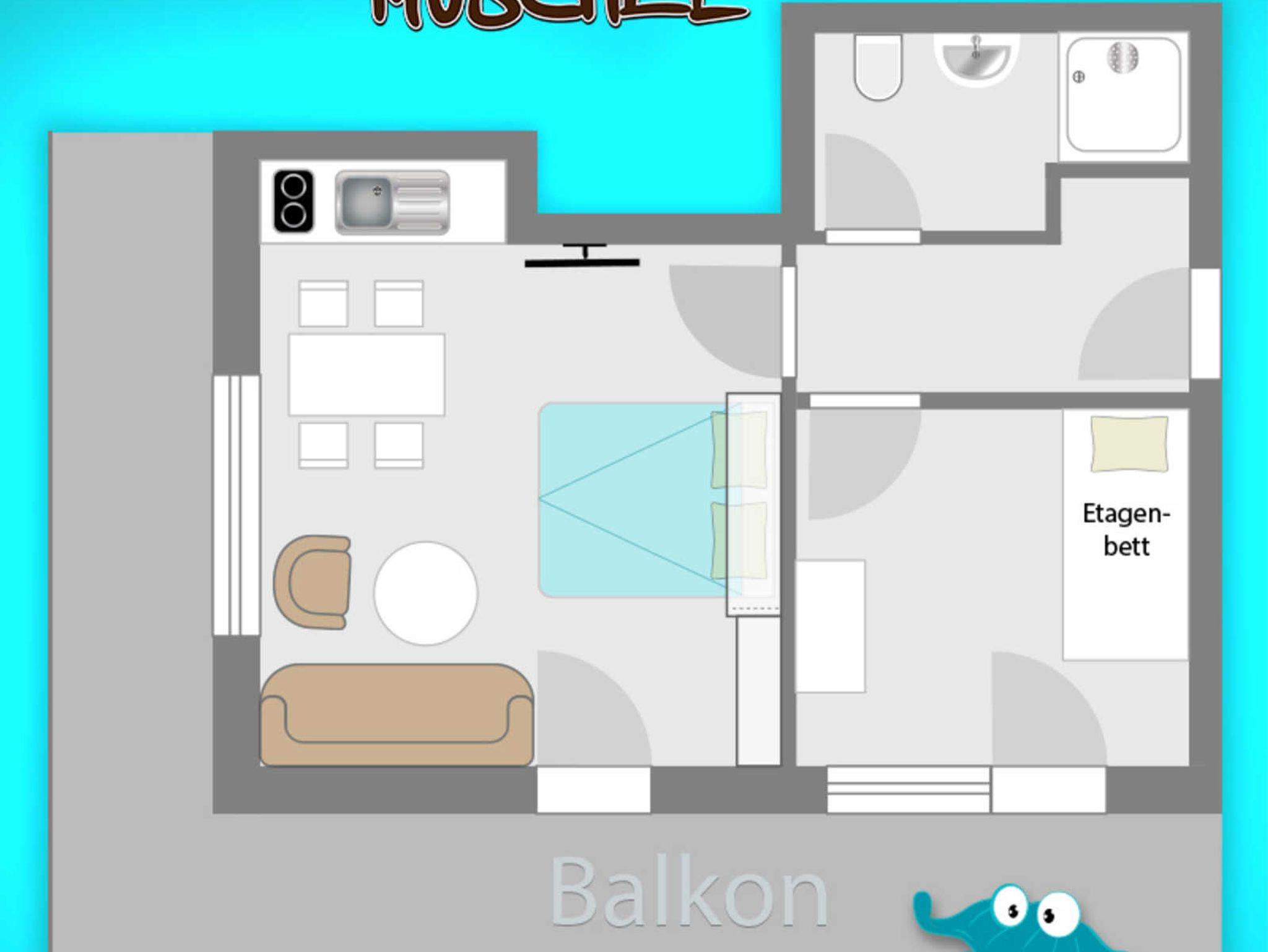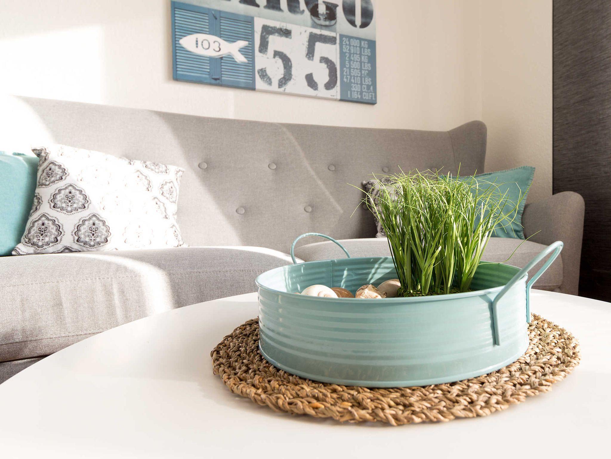 WLAN mit schneller Internetanbindung, sowie ein fester Parkplatz stehen kostenlos zur Verfügung. Ein großzügiger Balkon mit Mobiliar ermöglicht eine seitliche Seesicht. Die Muschel verfügt über einen gemütlichen Wohnraum mit integrierter Küchenzeile, Flachbild TV und einem bequemen Klappbett, einem weiteren Zimmer mit Etagenbett und einem modern ausgestatteten Badezimmer.