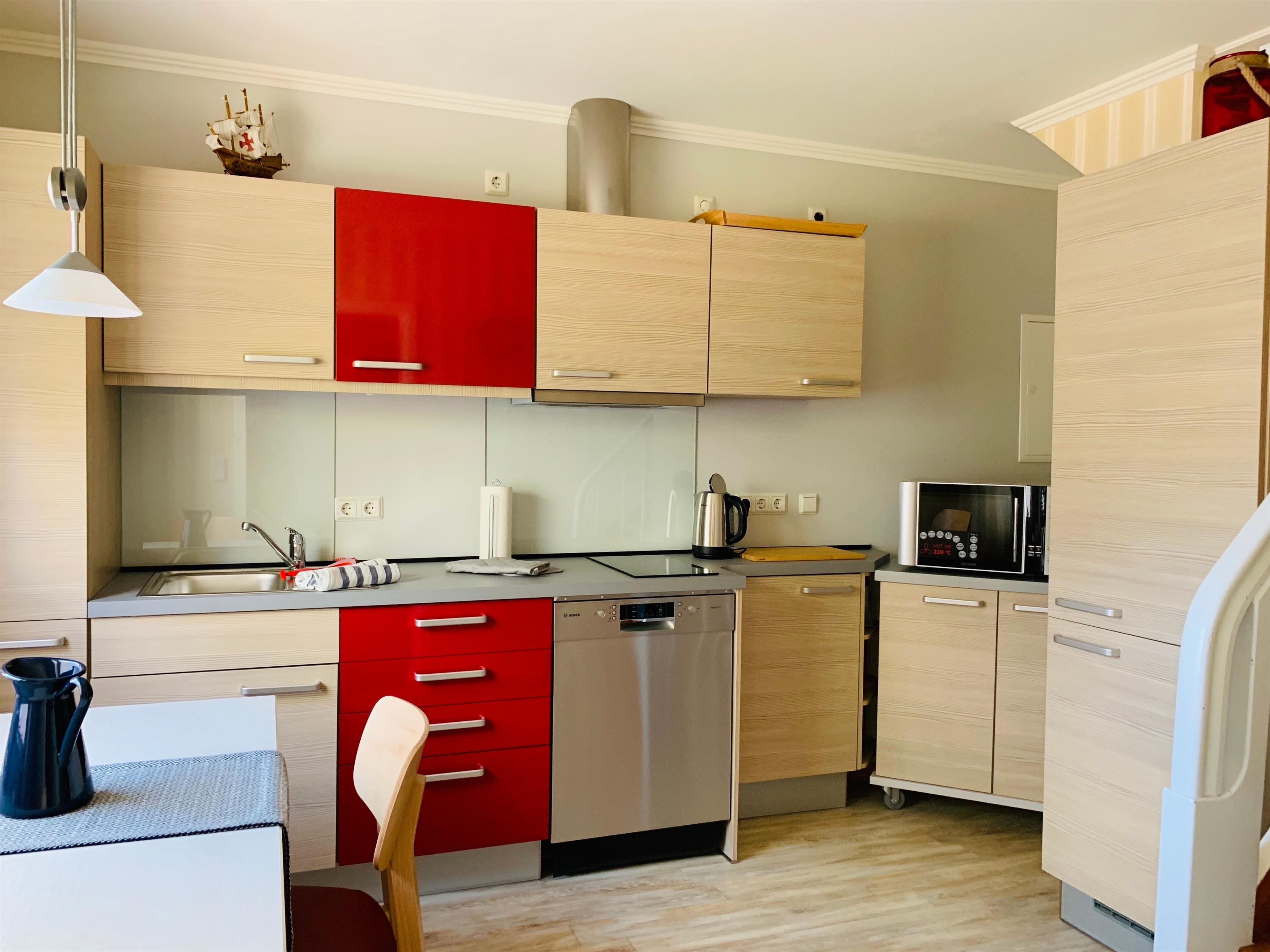 Küchenausstattung: Kühlschrank, Geschirrspülmaschine, Mikrowellen-Backofen, 2er- Ceran-Kochfeld, Wasserkocher, Kaffeezubereitung: French Press und Handfilter.