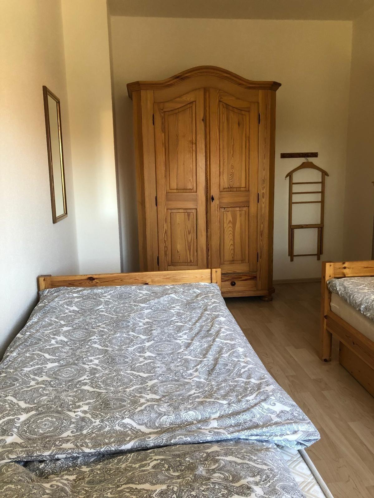Ein Schlafzimmer mit einem Doppelbett und ein Schlafzimmer mit zwei Einzelbetten.