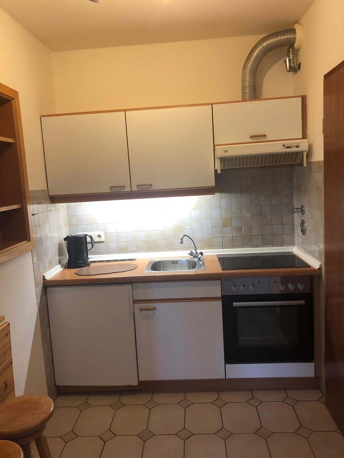 Die Küche befindet sich in der Diele und bietet einen Kühlschrank, Backofen/Herd, Kaffeemaschine, Wasserkocher und Toaster.