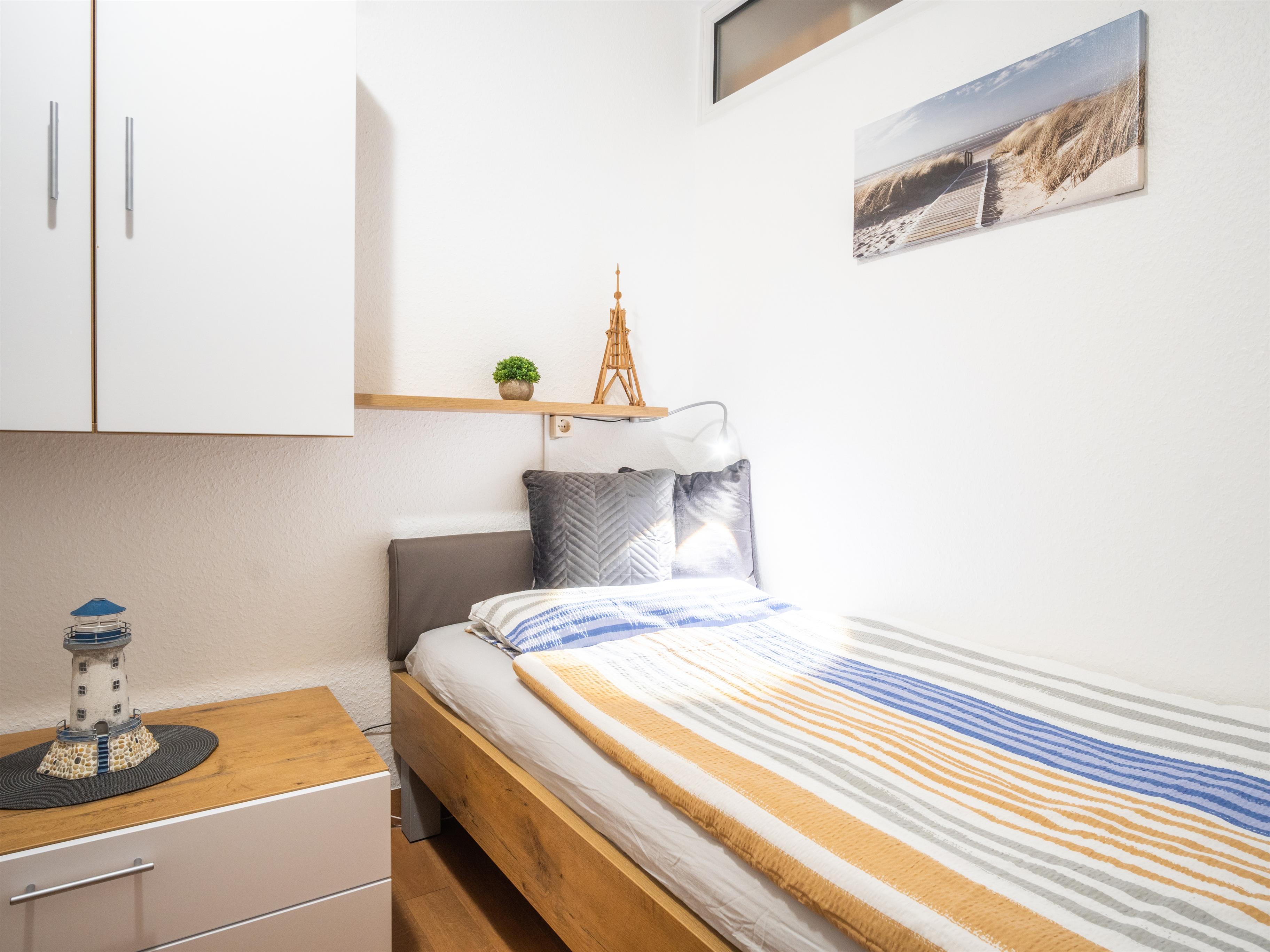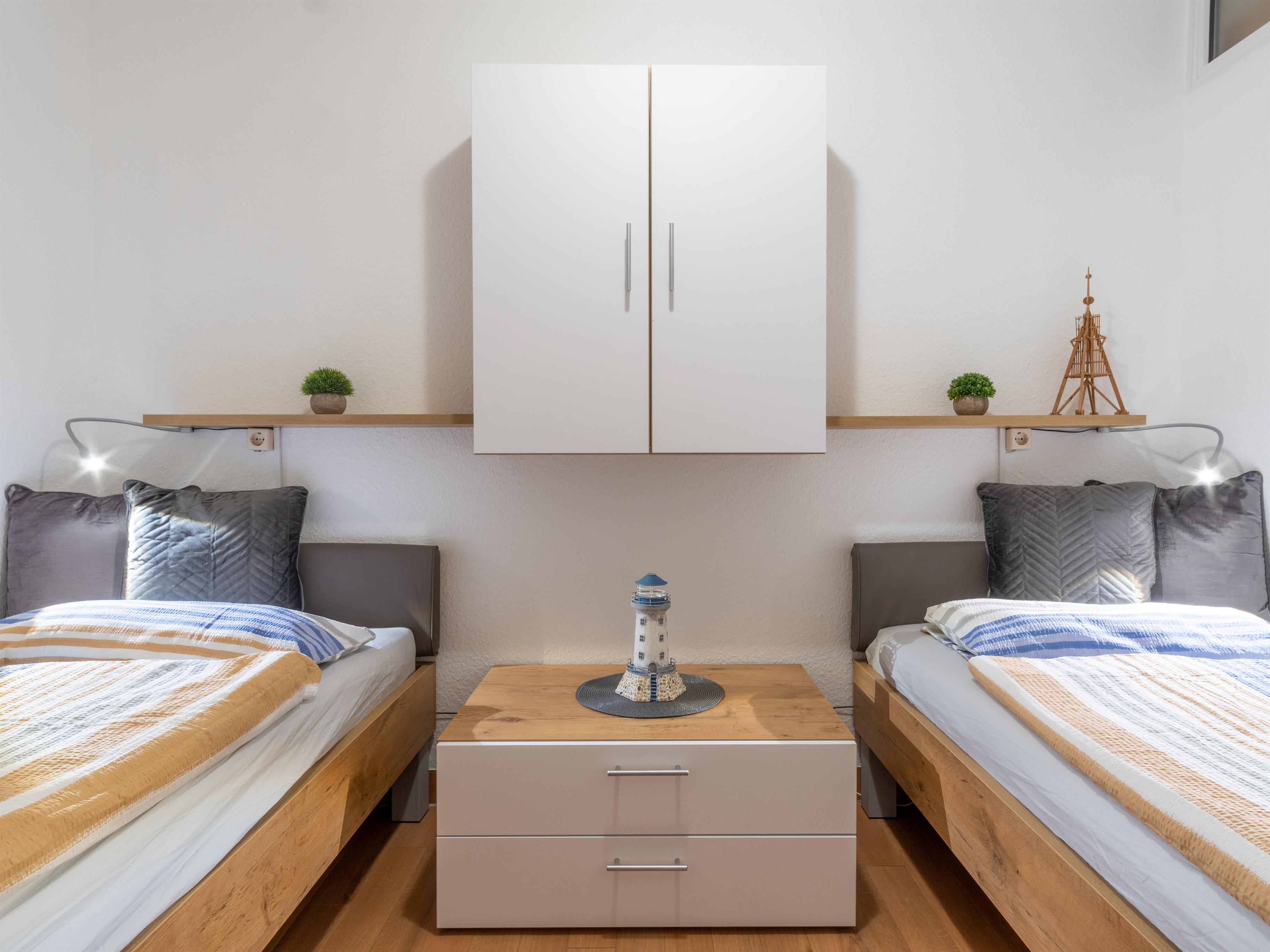 Es gibt ein separates Schlafzimmer mit zwei Einzelbetten mit Federkernmatratze (Liegefläche 200 cm x 90 cm) und ein Schrank-Klappbett im Wohnbereich mit 2 Kaltschaummatratzen für 2 Personen (Liegefläche 160 cm x 205 cm). Das separate Schlafzimmer wird mit einer Milchglasschiebetür vom Rest der Wohnung abgegrenzt.