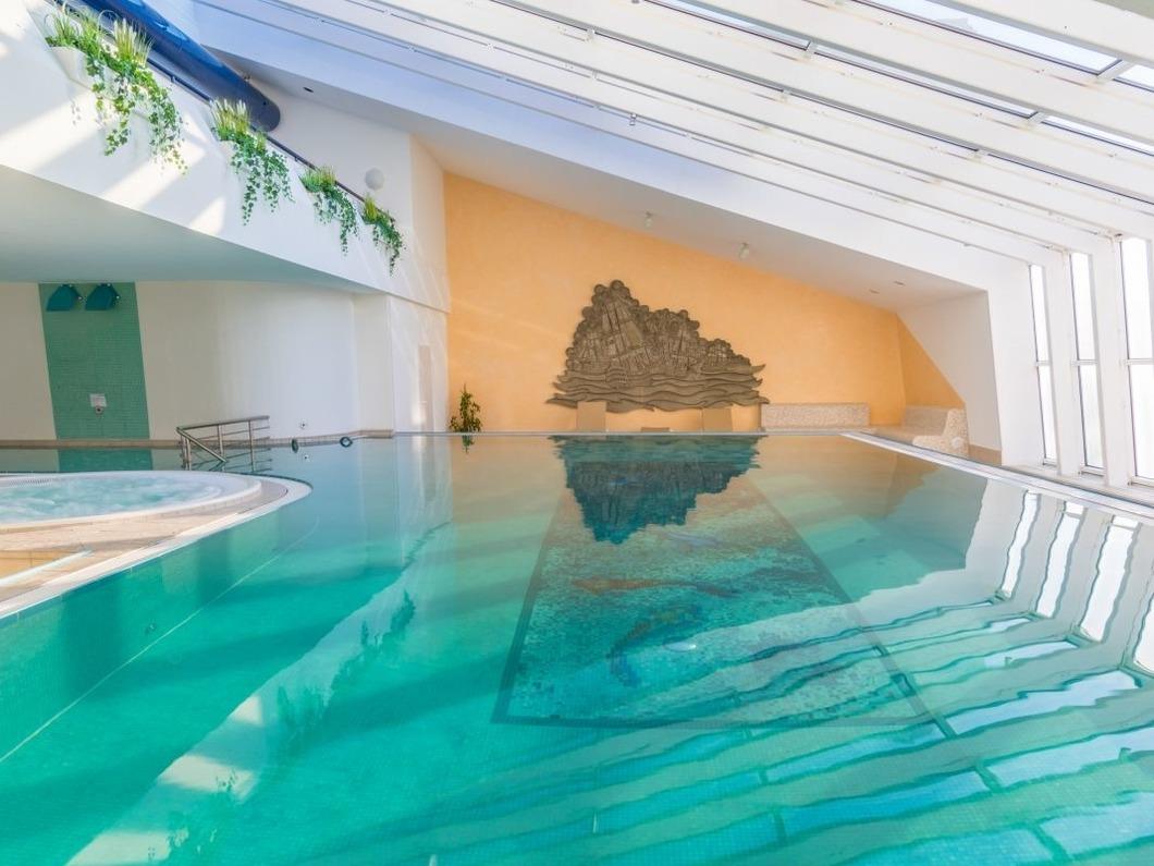 Das helle und einladende Schwimmbad befindet sich im 1. Stock und steht allen Gästen des Hauses kostenlos zur Verfügung. Neben dem 12,5m Schwimmbecken mit Massagedüse und künstlichem Wasserfall befindet sich ein beheizter Whirlpool.