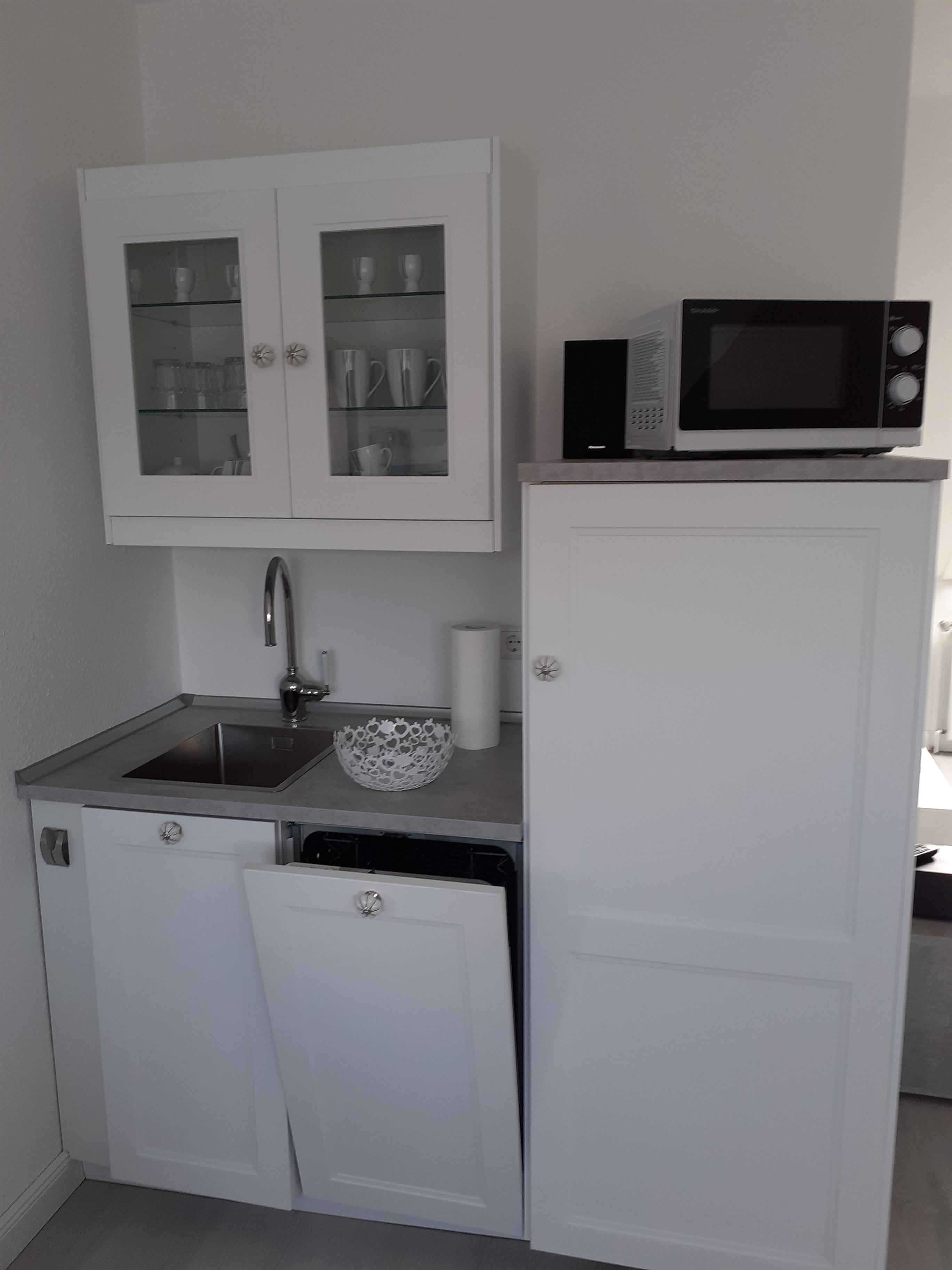 Ihnen stehen neben einem Kühlschrank auch eine Kaffeemaschine und eine Mikrowelle zur Verfügung.