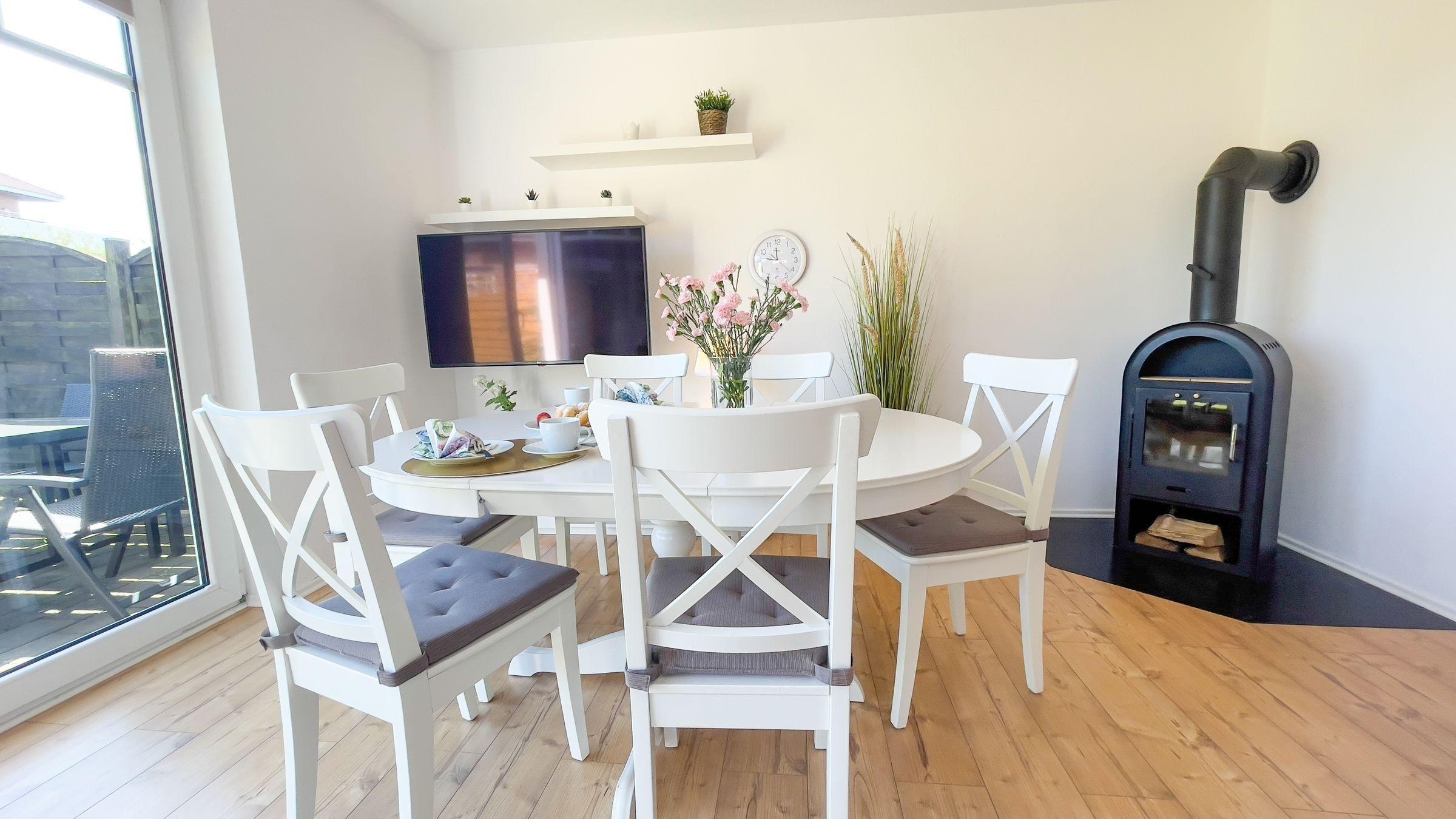 Das "Haus Eversand 2" bietet eine modern eingerichtete Doppelhaushälfte für bis zu 8 Personen. Im Obergeschoss befinden sich drei Schlafzimmer, zwei davon mit Doppelbetten und eines mit einem ausziehbaren Tagesbett, ausgestattet mit Fernsehern. Das Wohnzimmer verfügt über ein gemütliches Sofa, das zusätzliche Schlafmöglichkeiten bietet. Die vollständig ausgestattete Küche ermöglicht entspannte Kochabende, die im Wohn-/Esszimmer vor dem Holzofen wunderbar ausklingen können. Das Badezimmer bietet sowohl eine große Eckbadewanne als auch eine Duschkabine, zudem ist im Erdgeschoss ein Gäste-WC vorhanden. Die möblierte Terrasse lädt zum Verweilen ein. Ein PKW-Stellplatz ist vor dem Haus verfügbar. Das Ferienhaus ist ideal gelegen und ermöglicht einen bequemen Zugang zu den wichtigsten Einrichtungen und Attraktionen der Umgebung.
