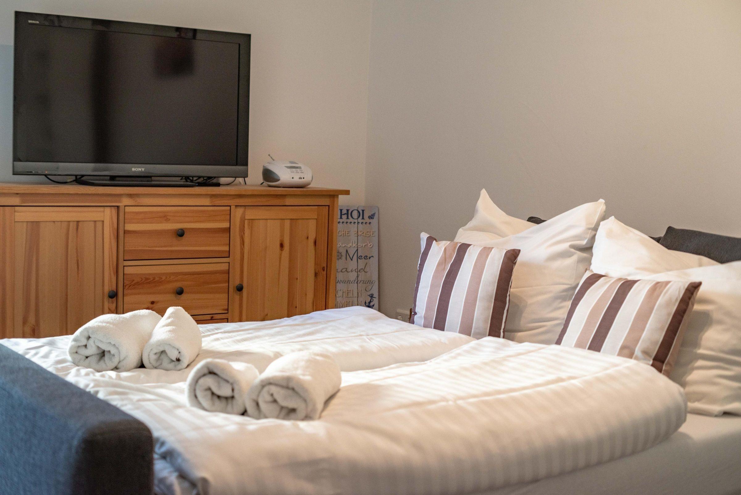 Die gemütliche Ferienwohnung für 2 Personen im Lotsenviertel bietet eine freundliche und moderne Ausstattung. Die Wohnung umfasst ein separates Schlafzimmer und ein einladendes Wohnzimmer, das mit einer Schlafcouch ausgestattet ist. Die umfangreich ausgestattete Einbauküche verfügt über ein Ceran-Kochfeld und ermöglicht eine angenehme Zubereitung von Mahlzeiten.